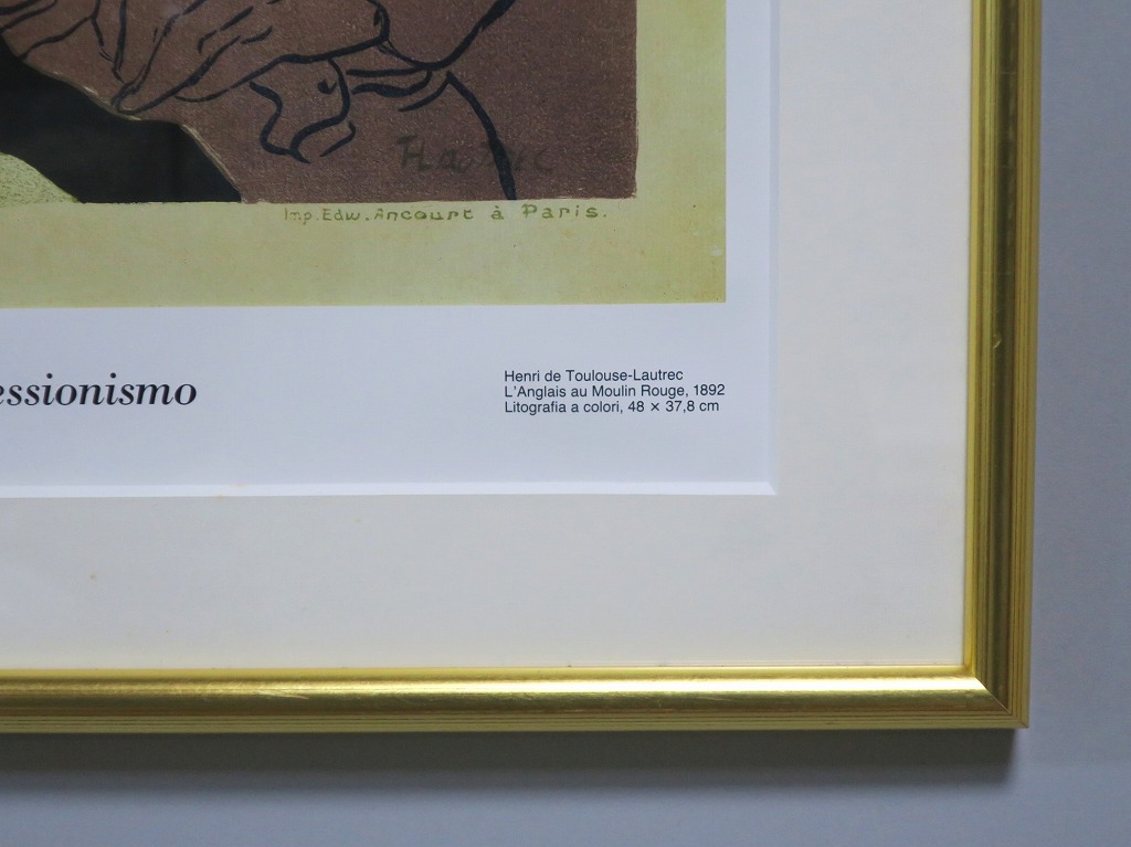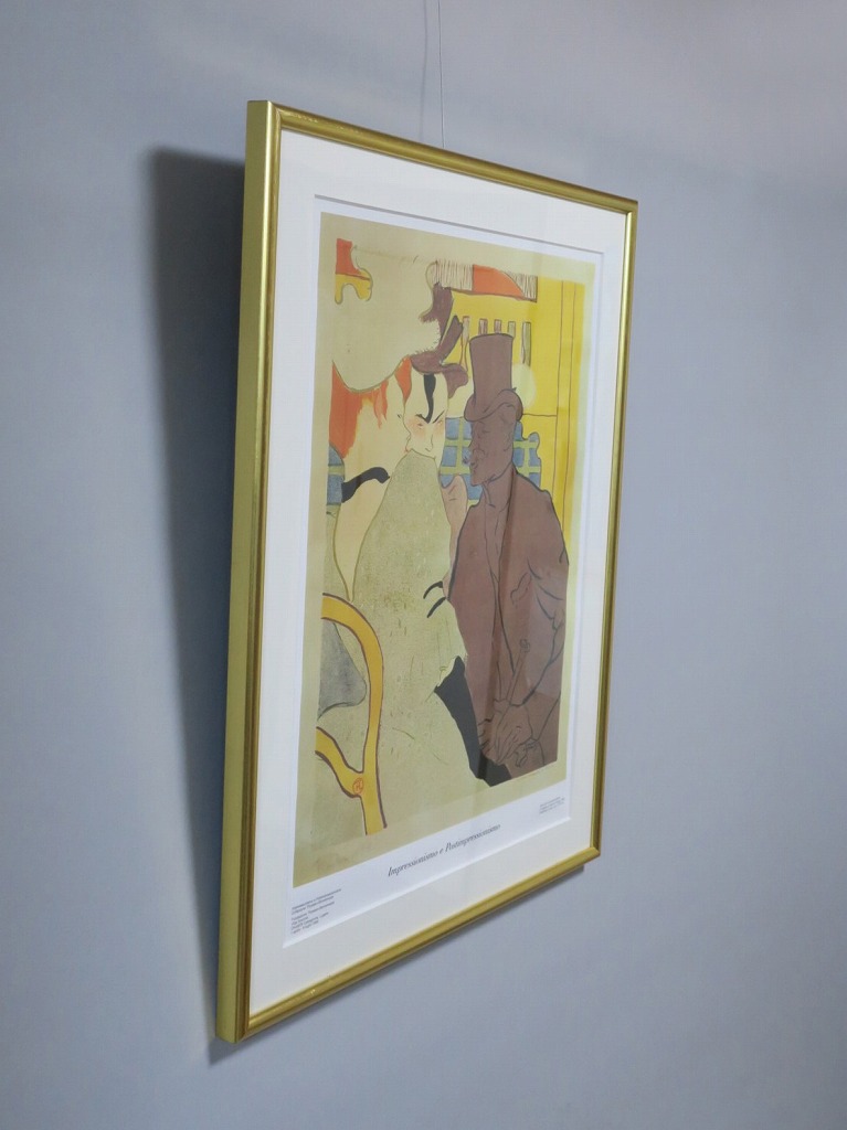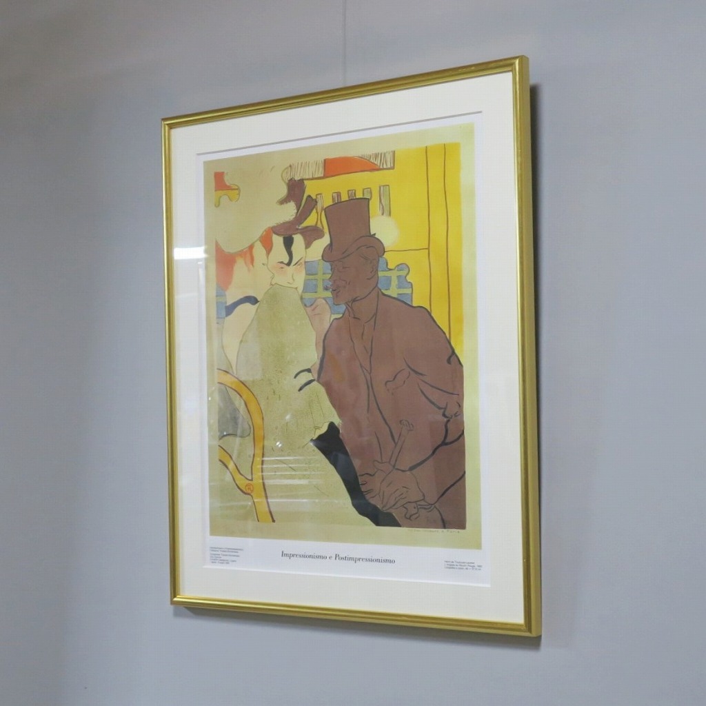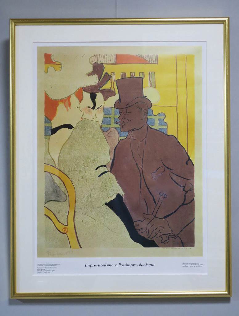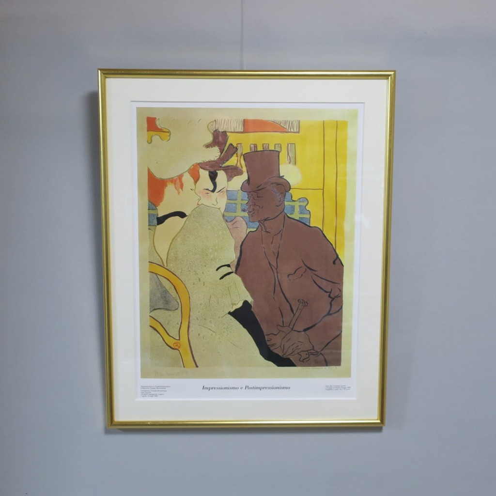 ピクチャーサイズ 縦横 約59cm×45cm 木製額、前面アクリル。額に若干の傷みがありますが、総じて良い状態です。前面のアクリルに映り込みがありますので、ご了承ください。状態は写真でご確認ください。 トゥールーズ・ロートレック(1864年〜1901年)は19世紀末、パリで活躍したフランス人画家です。ジャポニズムの影響を受けた作風でパリのダンスホール「ムーラン・ルージュ」などのポスターを芸術の域にまで高めた画家としても知られています。本品はロートレックのリトグラフ「ムーラン・ルージュのイギリス人」(1892年)の印刷ポスター。スイスのカスタニョーラ・ルガノで開かれた展覧会(1990年)の宣伝用に作られたものです。飾るとジャポニズムが流行していたパリの世紀末を感じることができます。 | ||