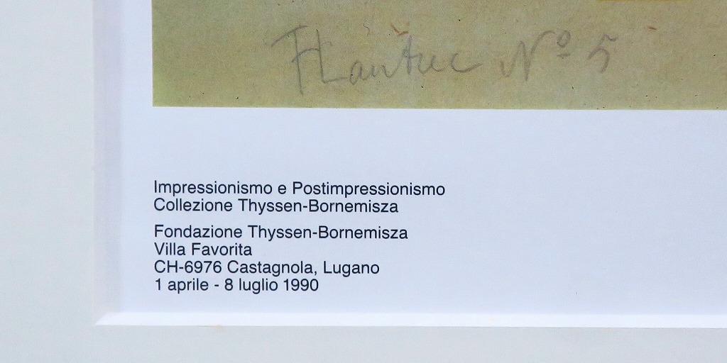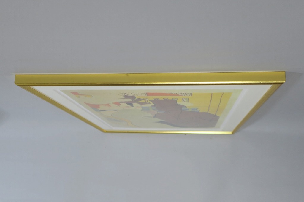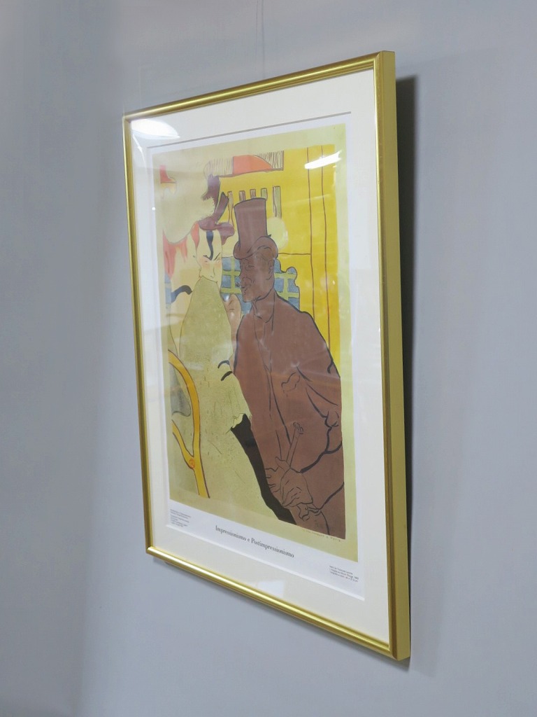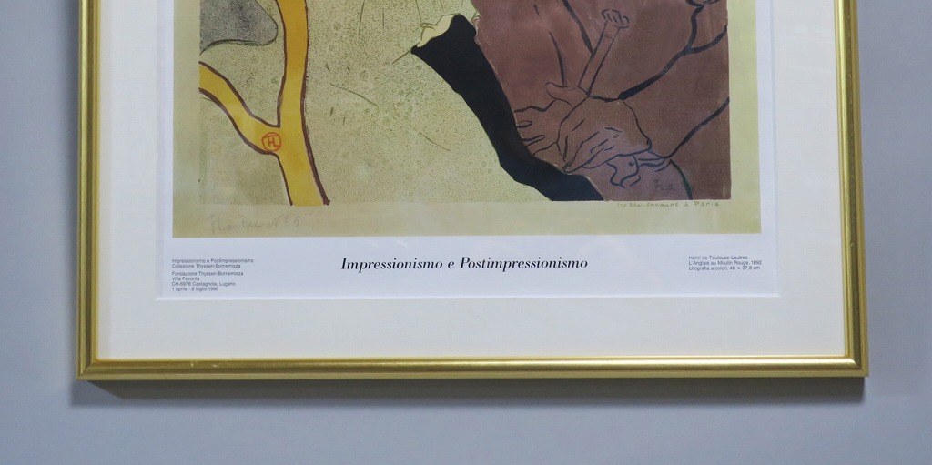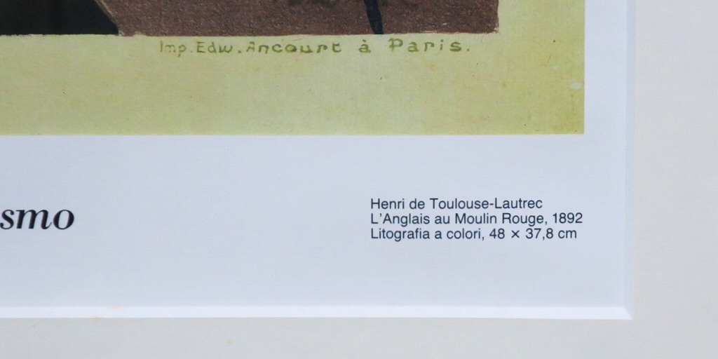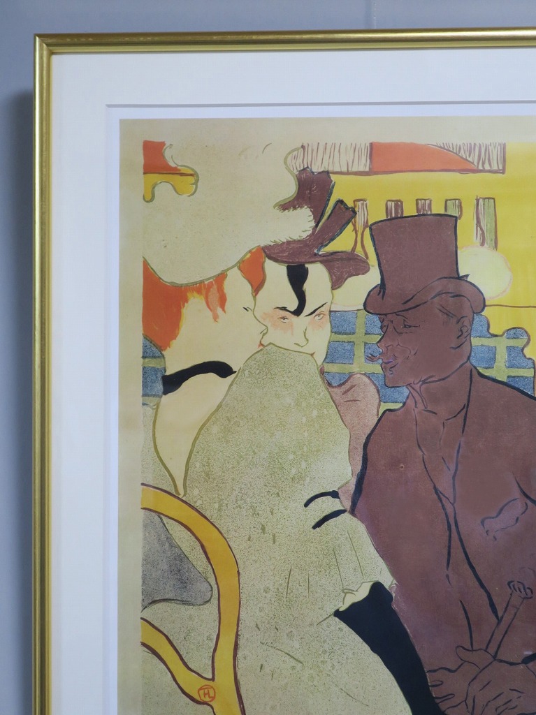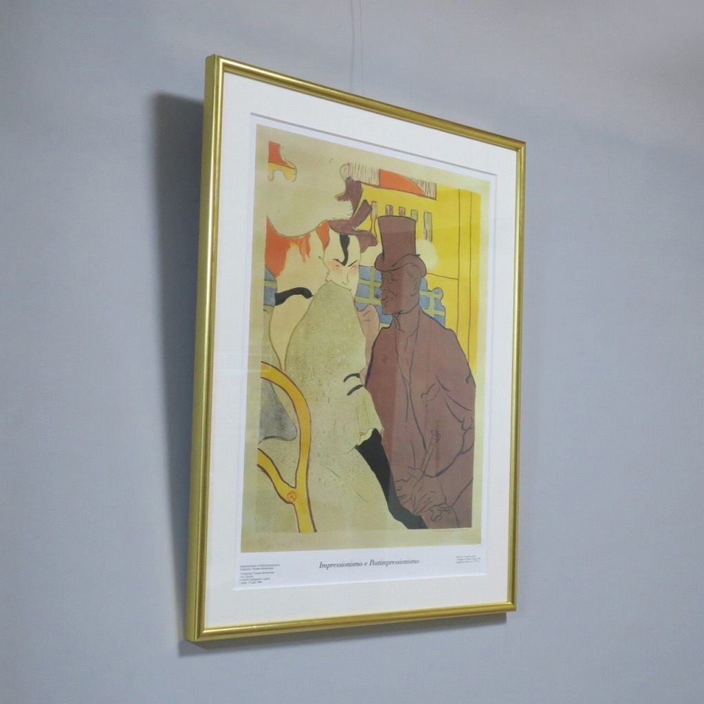 ピクチャーサイズ 縦横 約59cm×45cm 木製額、前面アクリル。額に若干の傷みがありますが、総じて良い状態です。前面のアクリルに映り込みがありますので、ご了承ください。状態は写真でご確認ください。 トゥールーズ・ロートレック(1864年〜1901年)は19世紀末、パリで活躍したフランス人画家です。ジャポニズムの影響を受けた作風でパリのダンスホール「ムーラン・ルージュ」などのポスターを芸術の域にまで高めた画家としても知られています。本品はロートレックのリトグラフ「ムーラン・ルージュのイギリス人」(1892年)の印刷ポスター。スイスのカスタニョーラ・ルガノで開かれた展覧会(1990年)の宣伝用に作られたものです。飾るとジャポニズムが流行していたパリの世紀末を感じることができます。 | ||
