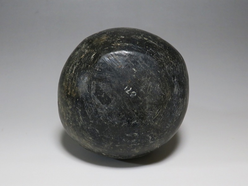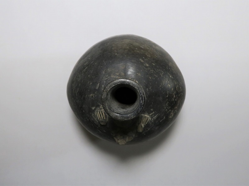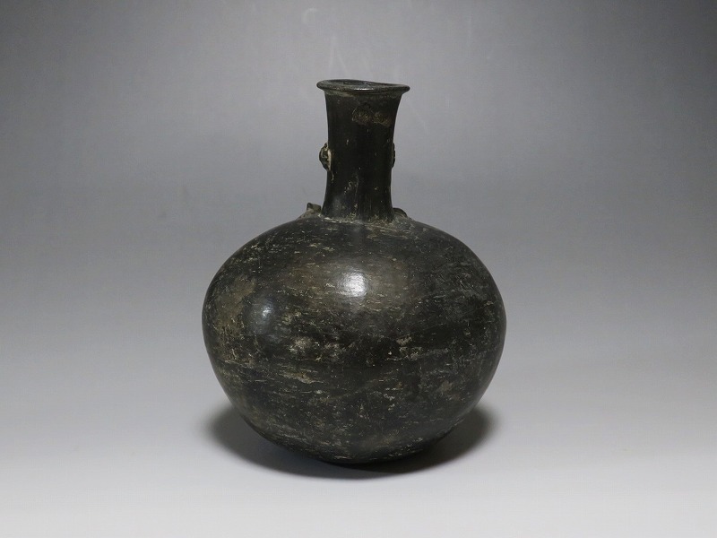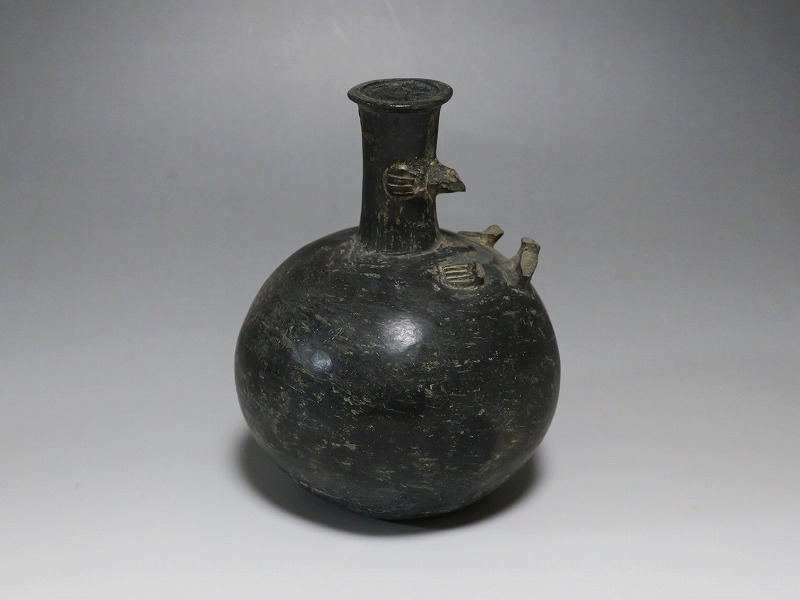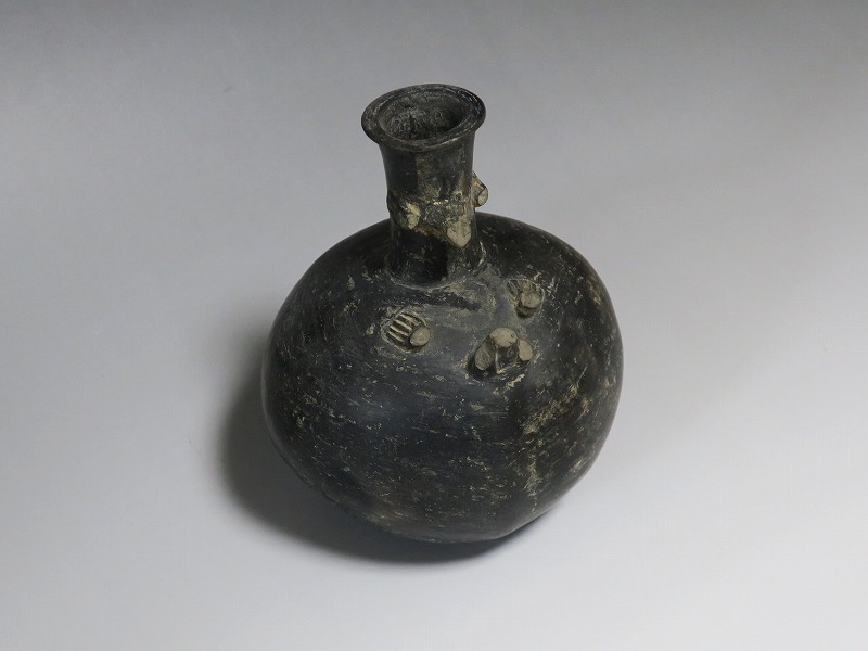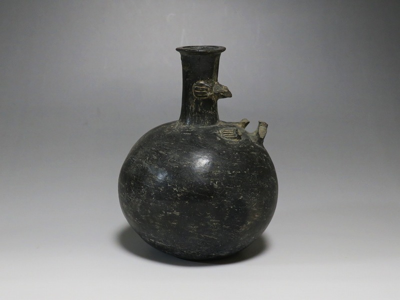 (ペルー 紀元1世紀前後) 商品番号 2803 高さ 約15cm/胴径 約12.5cm/口径 約3.5cm 取っ手の部分が欠損しています。状態は写真でご確認ください。 チャビン文化は、ペルー北部のアンデス高地に、紀元前900〜200年頃に栄えた文化です。チャビンの有名な考古遺跡はチャビン・デ・ワンタルで、現在のアンカシュ県の高地に位置します。本品は整形、焼成した土器を煙などで燻した後、研磨した黒色の瓶。この技法は紀元前から世界各地で土器の装飾技法として用いられています。欠損した取っ手の部分には鳥の彫刻が施してあったと考えられます。薄く繊細な感じがする作品で、ローマンガラスの瓶のような形をしています。古代アンデスを感じさせてくれる黒色土器です。 | ||