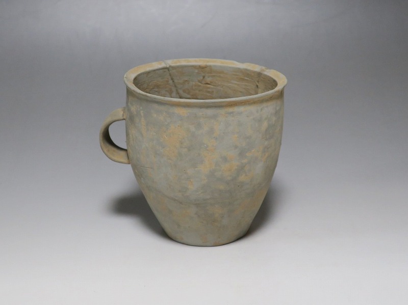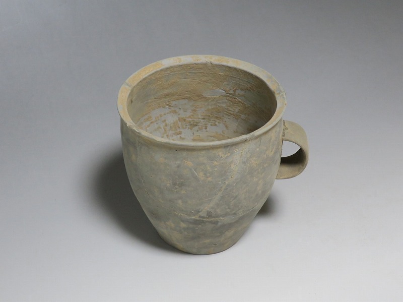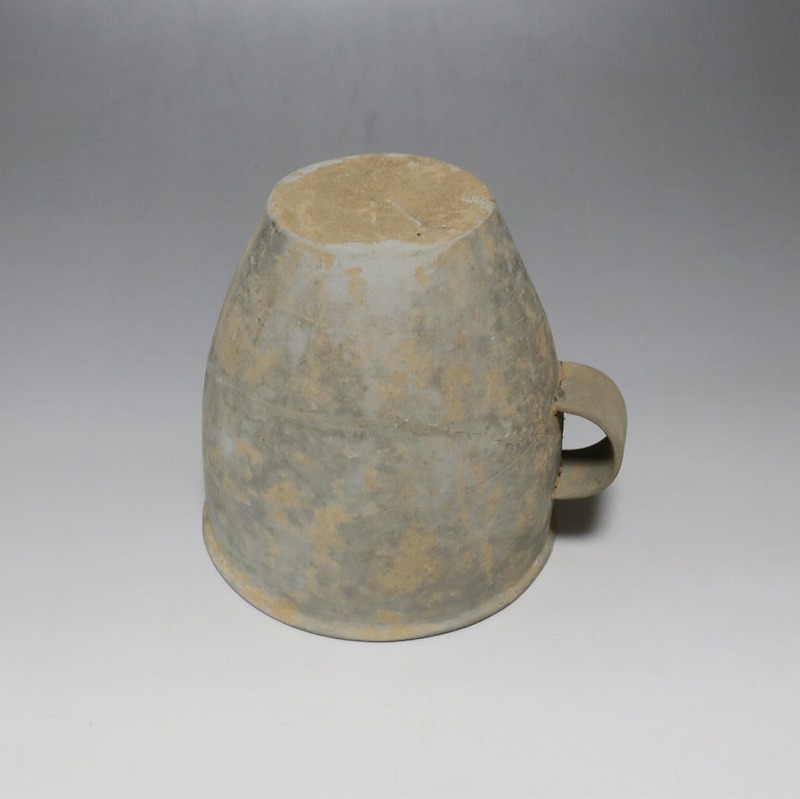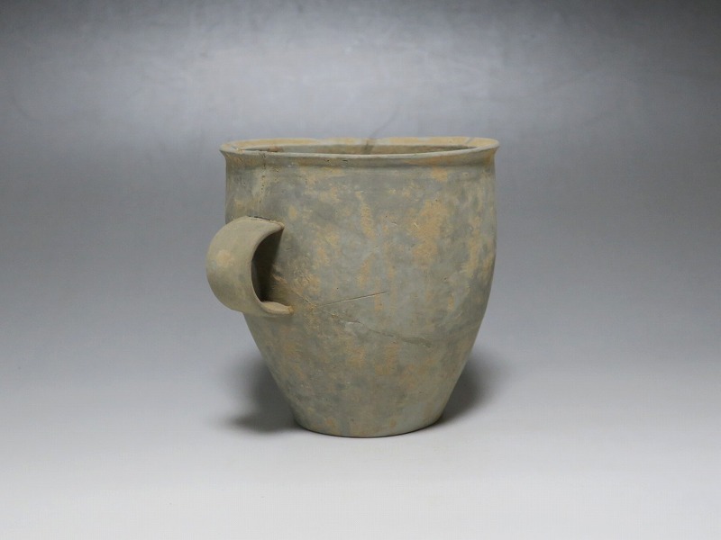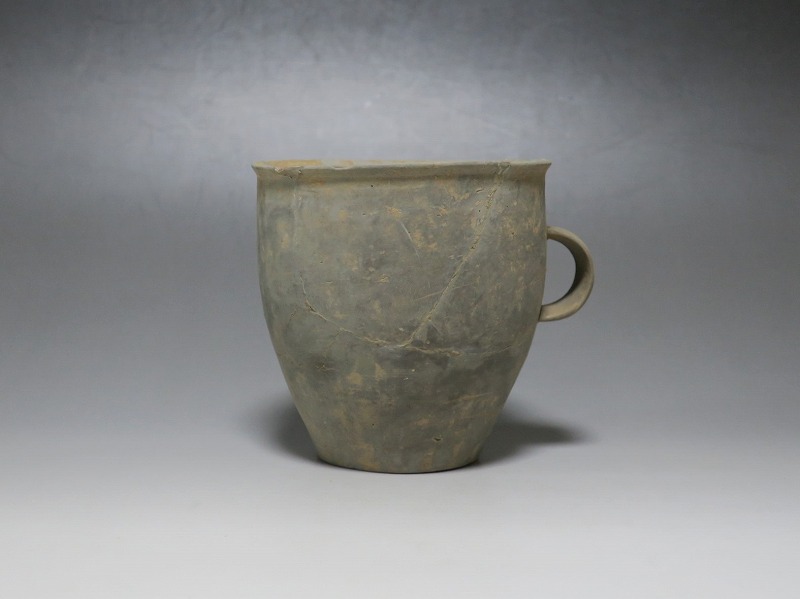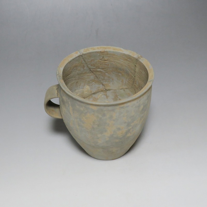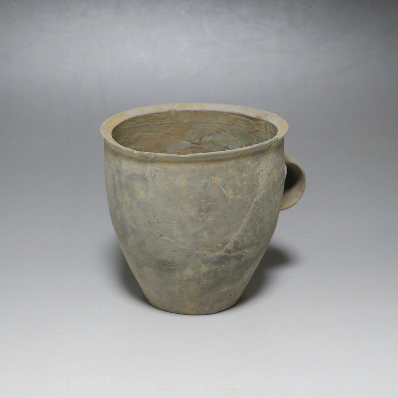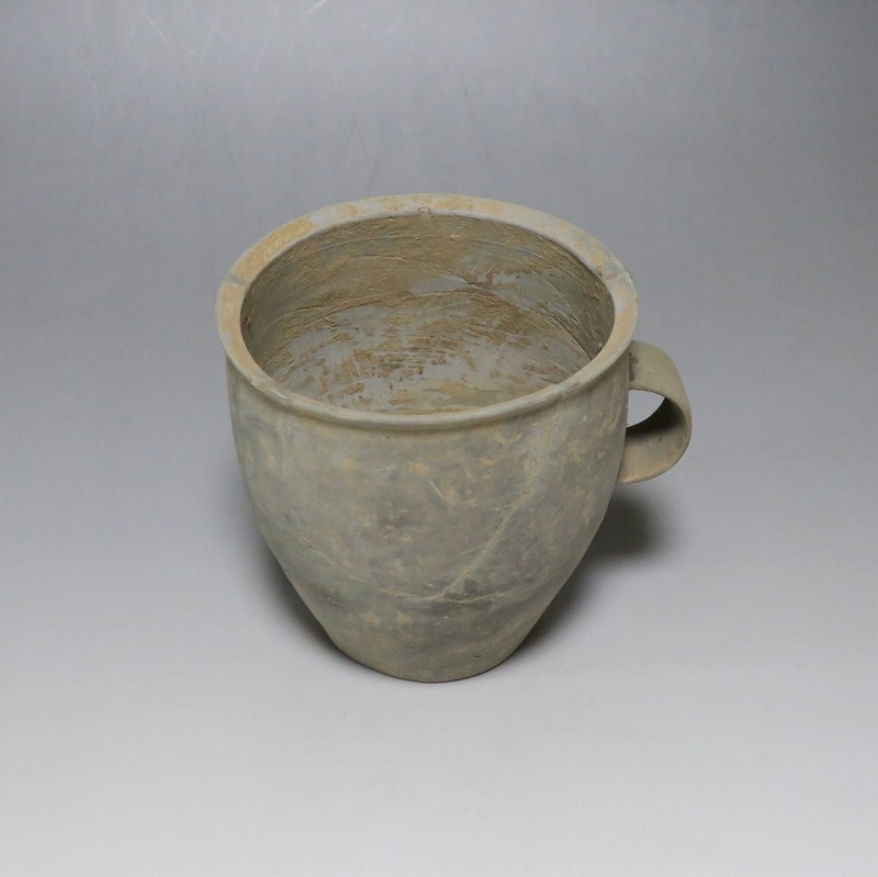口径 約10.3cm/高さ 約10.3cm 発掘時の土が付着し、全体的に直しがあります。状態は写真でご確認ください。 須恵器は4世紀頃、朝鮮半島で焼き始められた硬質陶器(b器)で4世紀後半、日本に伝来しました。最初は朝鮮半島南部から輸入されていましたが、5世紀中頃には日本でも生産が始まります。本品は新羅地域から出土した須恵器の手付きコップ。新羅は騎馬系の民族なので馬乳酒や羊乳酒などを飲む時、本作のようなコップを使用しました。薄手で繊細な感じのする作品です。観賞用、落としを使って花器としてお楽しみください。 | ||