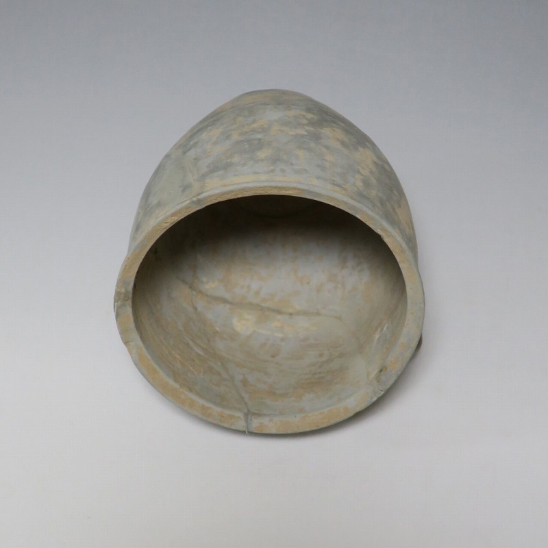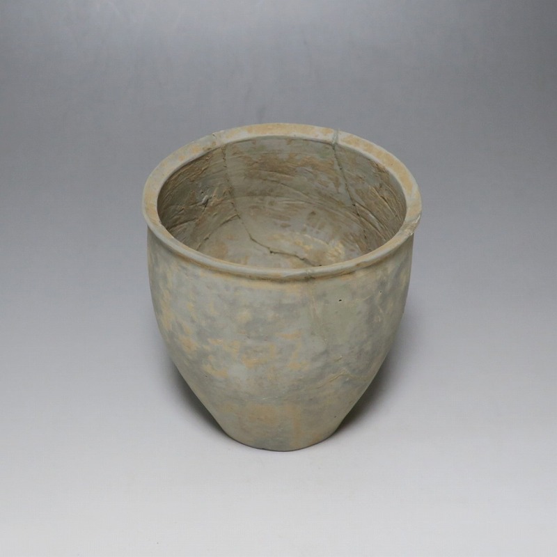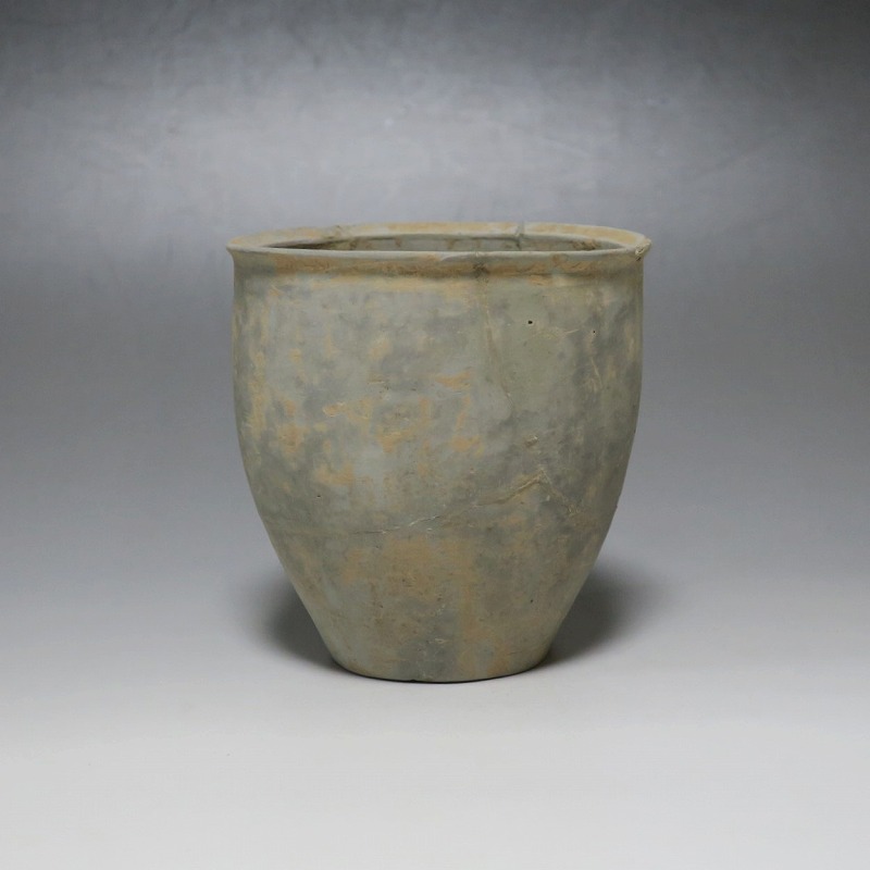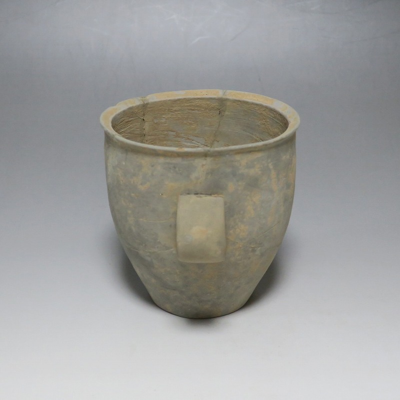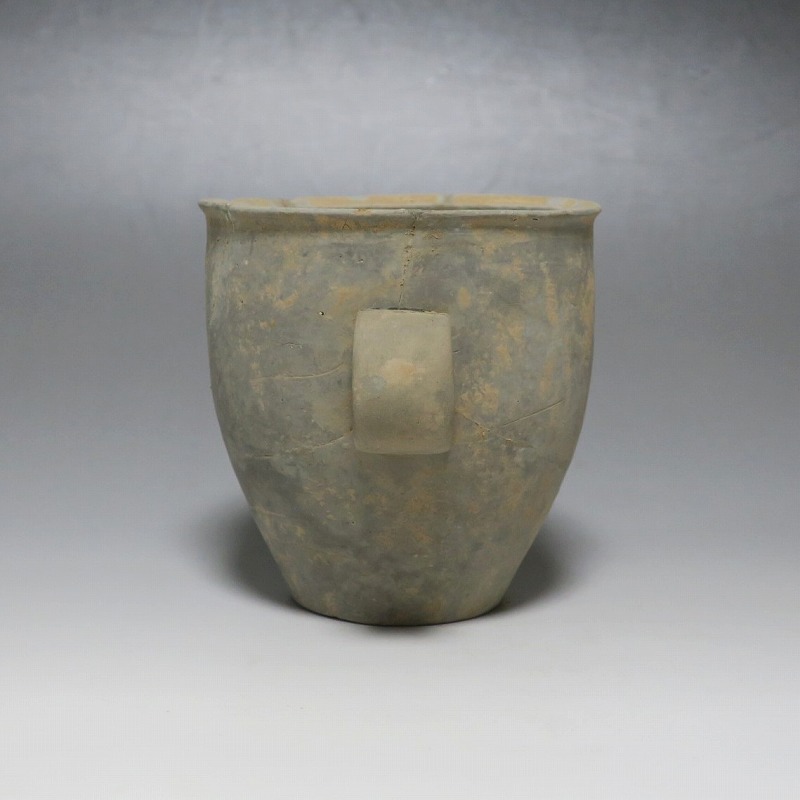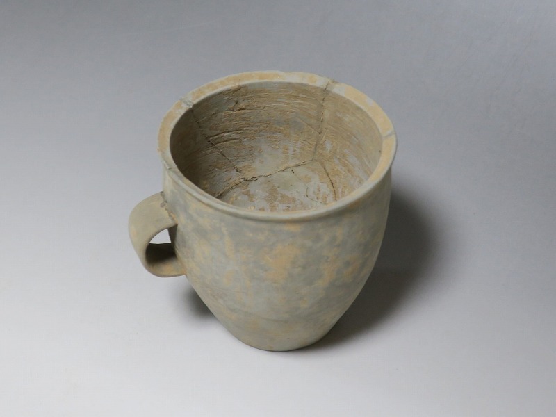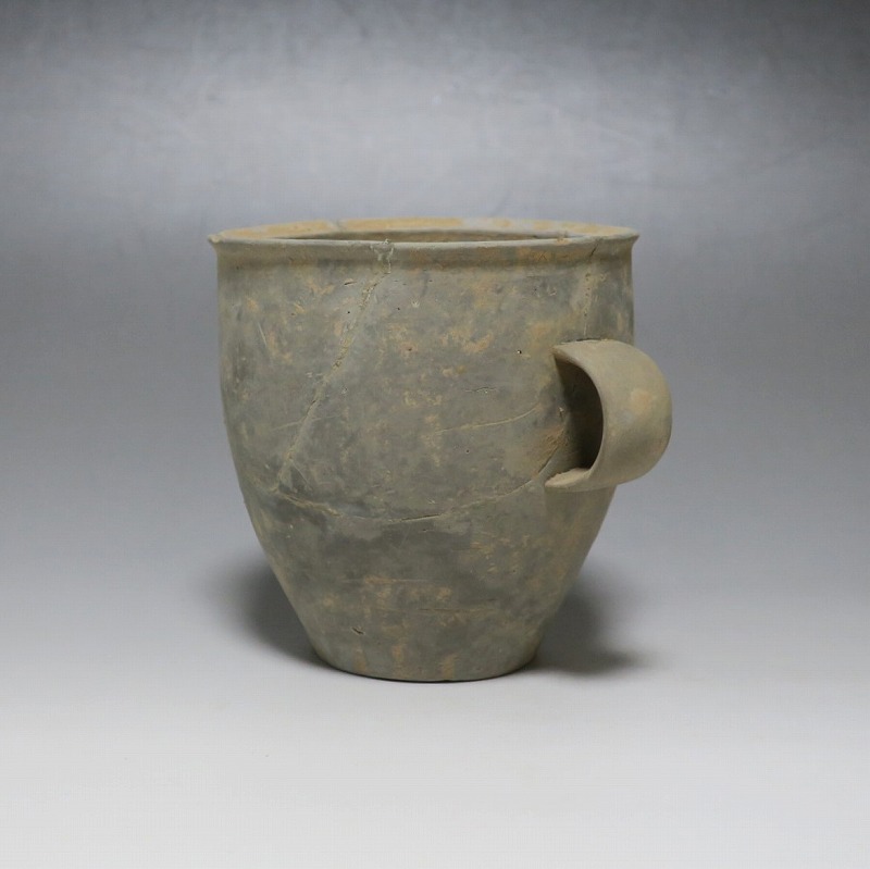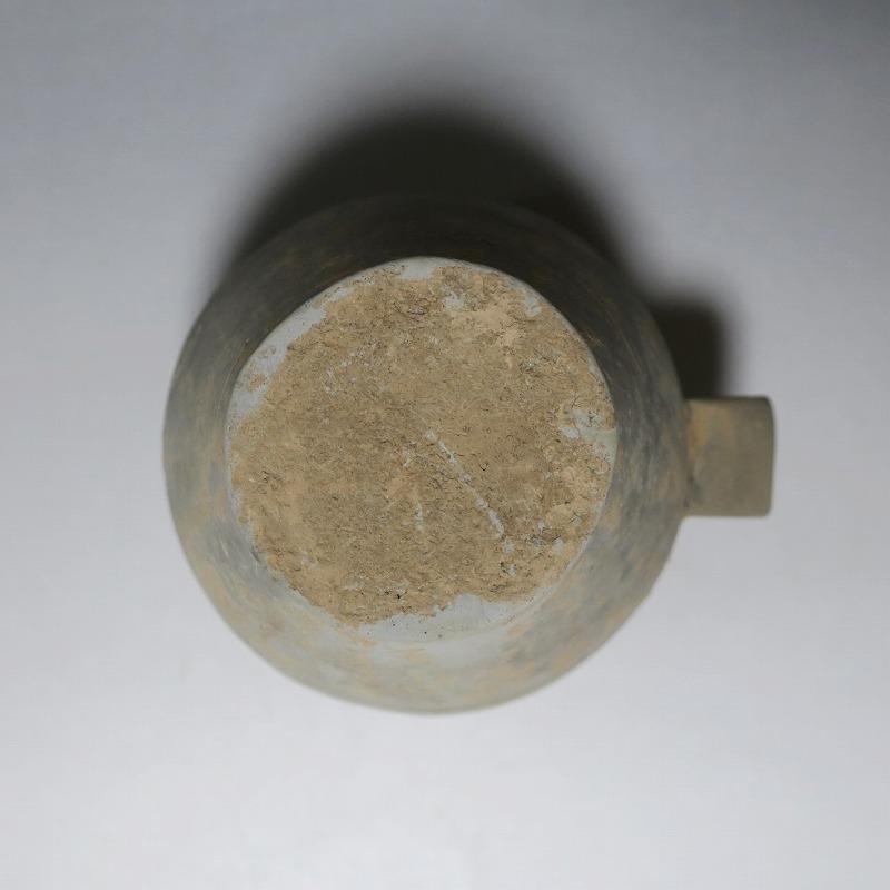 口径 約10.3cm/高さ 約10.3cm 発掘時の土が付着し、全体的に直しがあります。状態は写真でご確認ください。 須恵器は4世紀頃、朝鮮半島で焼き始められた硬質陶器(b器)で4世紀後半、日本に伝来しました。最初は朝鮮半島南部から輸入されていましたが、5世紀中頃には日本でも生産が始まります。本品は新羅地域から出土した須恵器の手付きコップ。新羅は騎馬系の民族なので馬乳酒や羊乳酒などを飲む時、本作のようなコップを使用しました。薄手で繊細な感じのする作品です。観賞用、落としを使って花器としてお楽しみください。 | ||