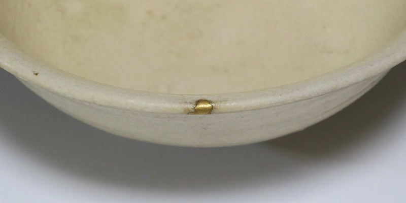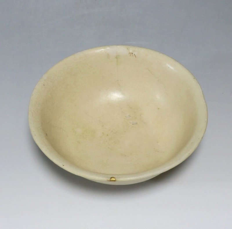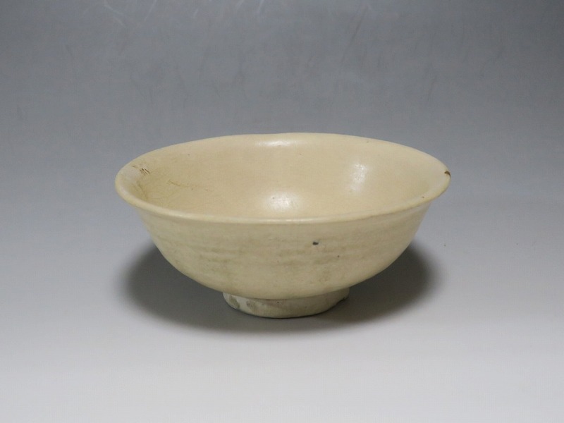 (タイ 15世紀) 商品番号 3176 口径 約13.9cm/高さ 約5.7cm/高台径 約5.5cm 口辺に約5mmの金直し、窯傷や釉ハゲがあります。状態は写真でご確認ください。 スンコロク(宋胡録)は15世紀前後、タイ中北部のスワンカロークで作られた鉄絵、黒釉、青磁などの古陶磁を総称した呼び名です。桃山時代から江戸時代初期にかけて日本に輸入され、香合や茶道具として使用されました。本品は15世紀に作られた白磁の茶碗。同時代、明では白磁が流行していたので、その影響を受けて製作されたのでしょう。日本の御深井焼の起源ともいえる美しい釉薬(簿妙に緑釉かがっています)が掛かっています。象牙色の温かみのある白釉がやわらかい感じのする茶碗。薄茶器、食器としてお楽しみください。 | ||