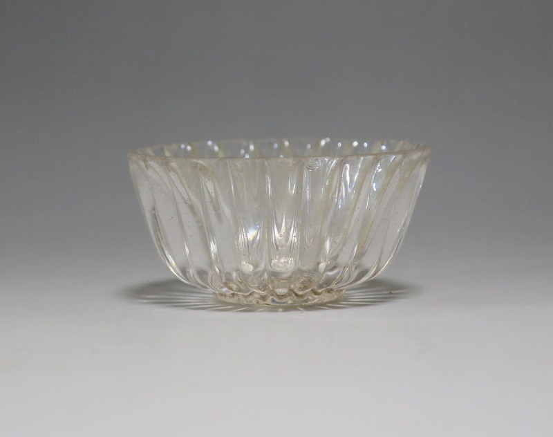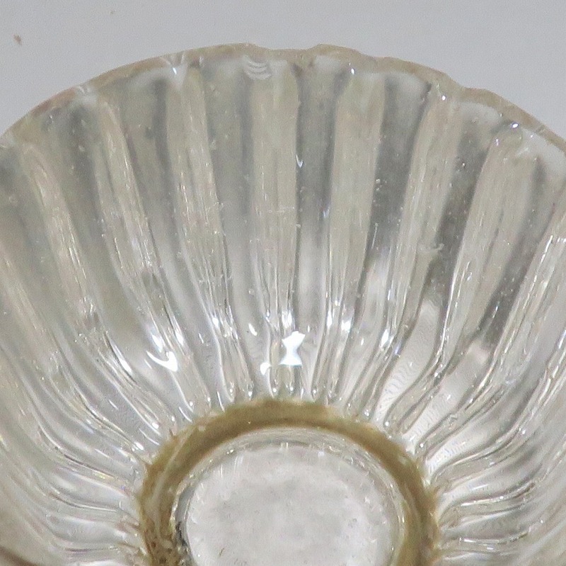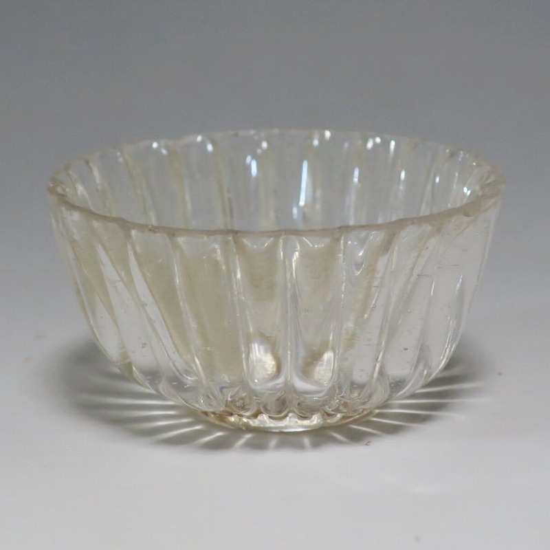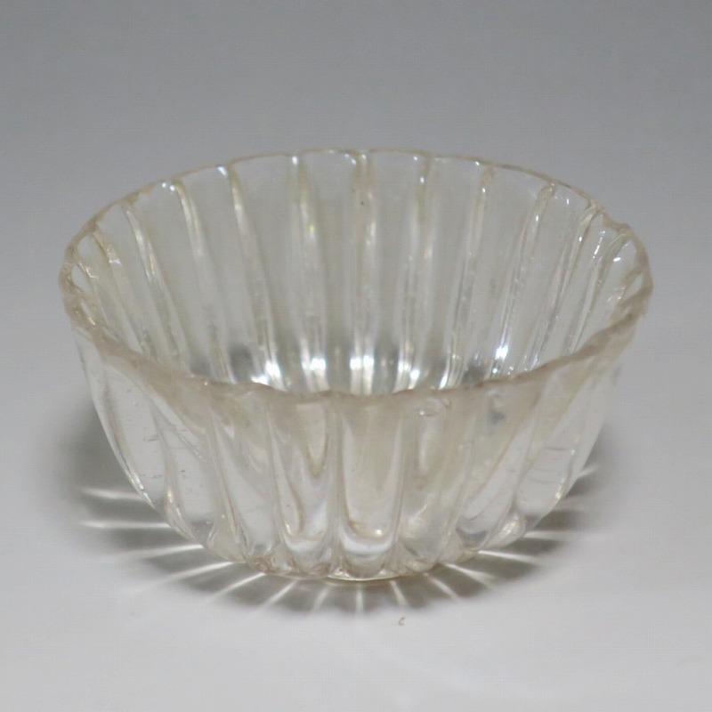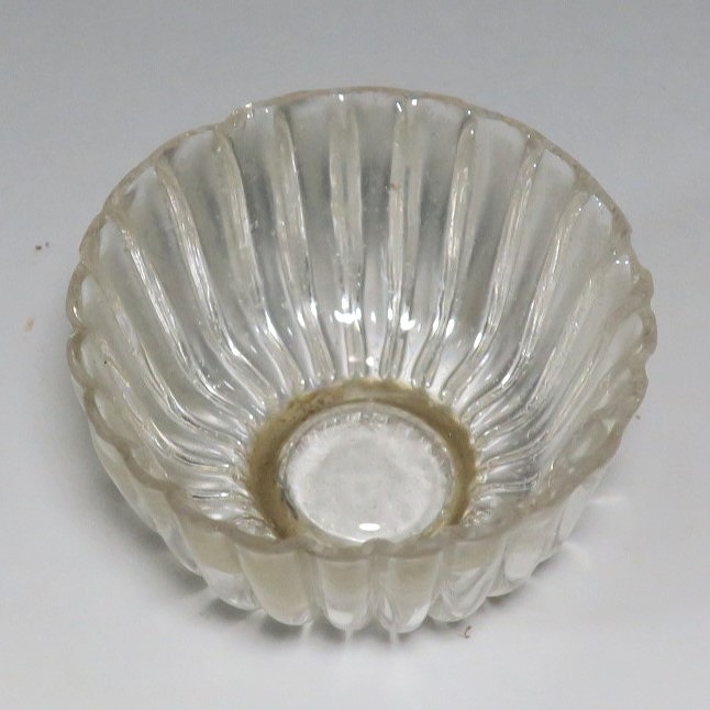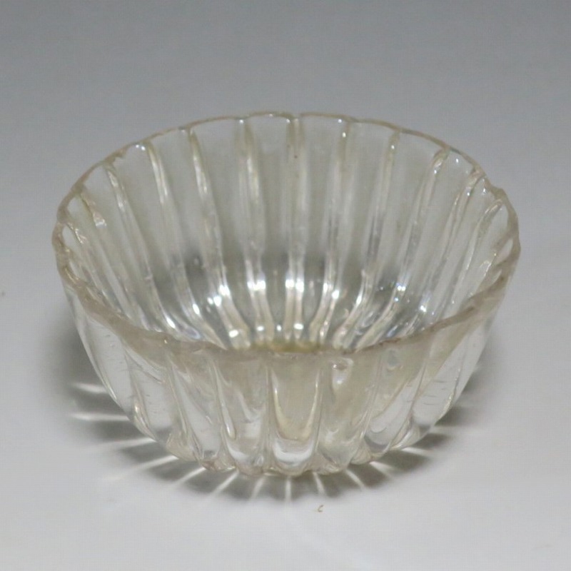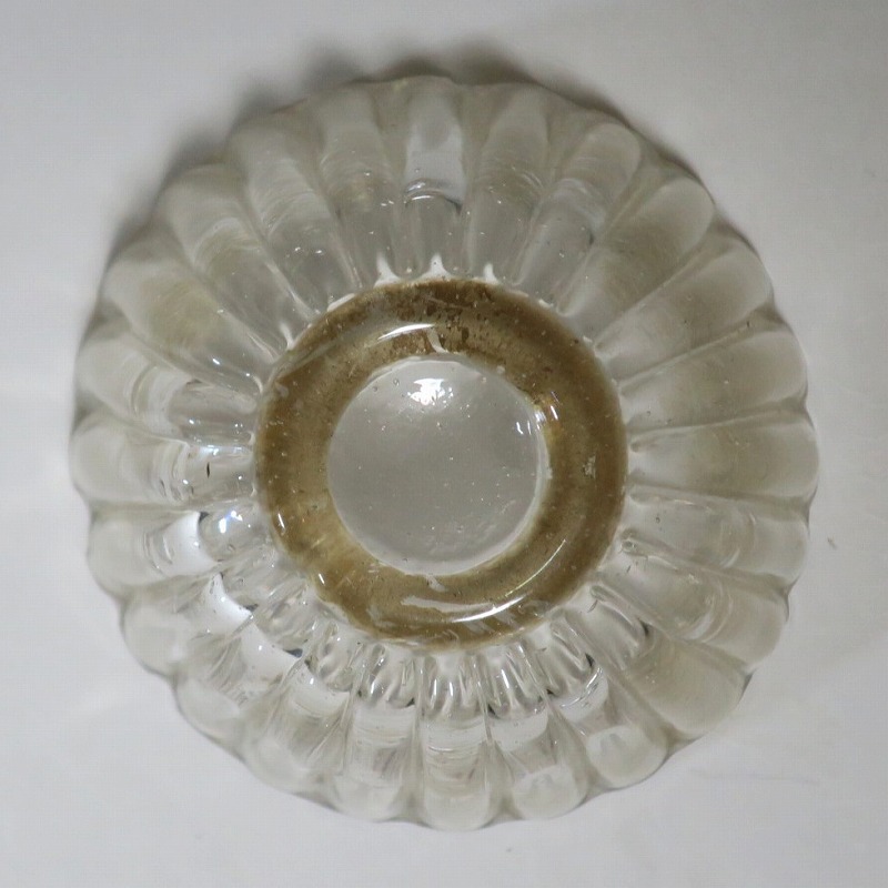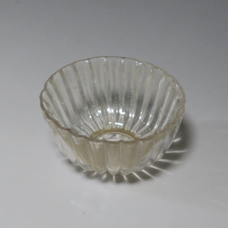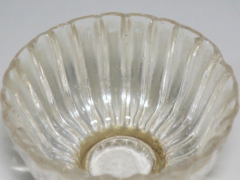 口径 約5.8cm/高さ 約3cm/高台径 約2.5cm 口辺に約5mmの欠けが2カ所、その他約1mm〜2mmのノミホツが複数あります。状態は写真でご確認ください。 日本でガラスの生産が始まったのは享保時代です。江戸の職人が蘭書などを参考に「びいどろ」と呼ばれるガラスを製作しました。江戸中期になるとガラス技術が発展、職人はかんざしや風鈴、万華鏡、金魚鉢など様々な商品を製作するようになります。本品は明治時代初期に製作された型吹きガラスの菊形盃。末尾に掲載した参考写真と同手の透明ガラスの作品です。手取りがずっしりと重く、弾くと金属的な音がします。日本酒器の盃としてお楽しみください。 | ||