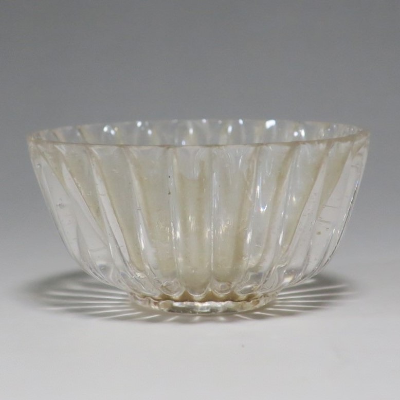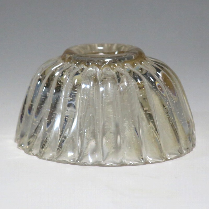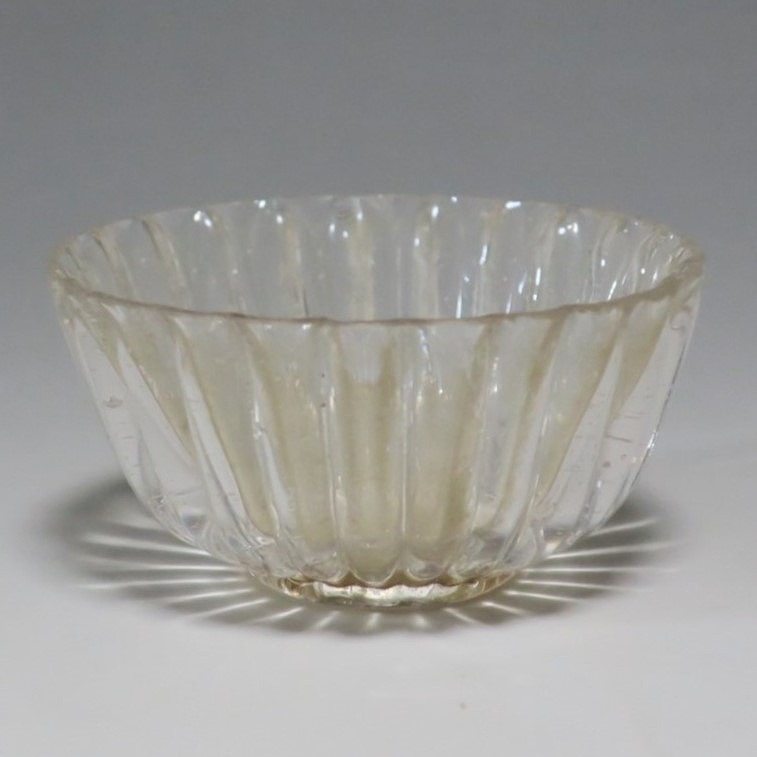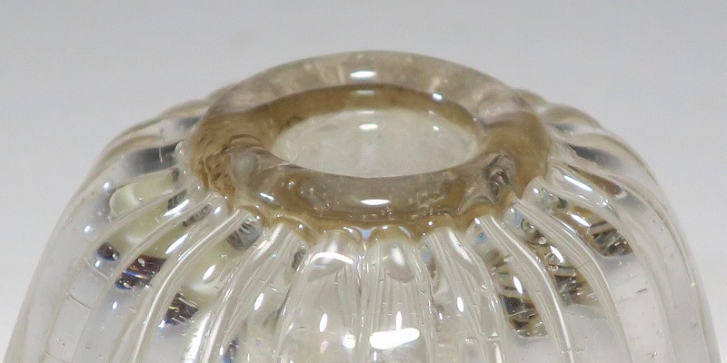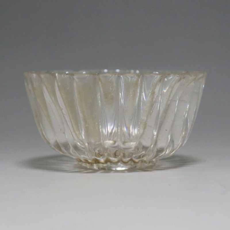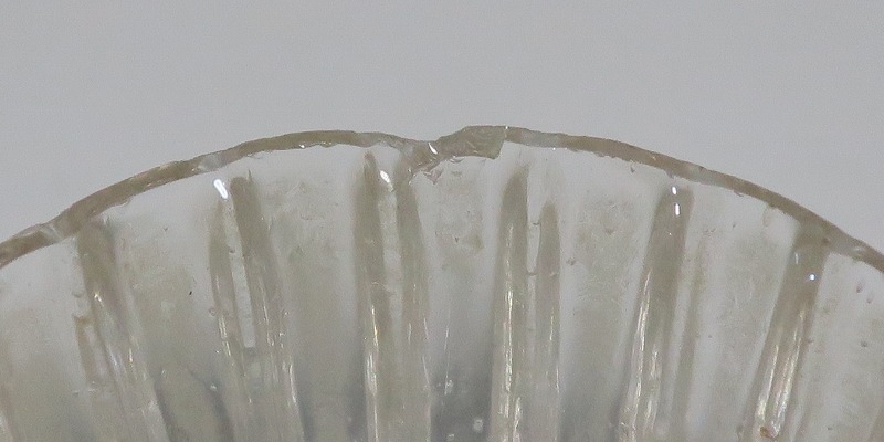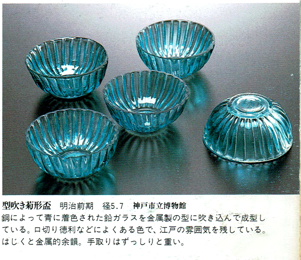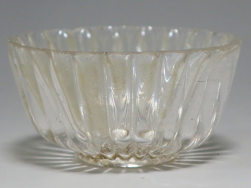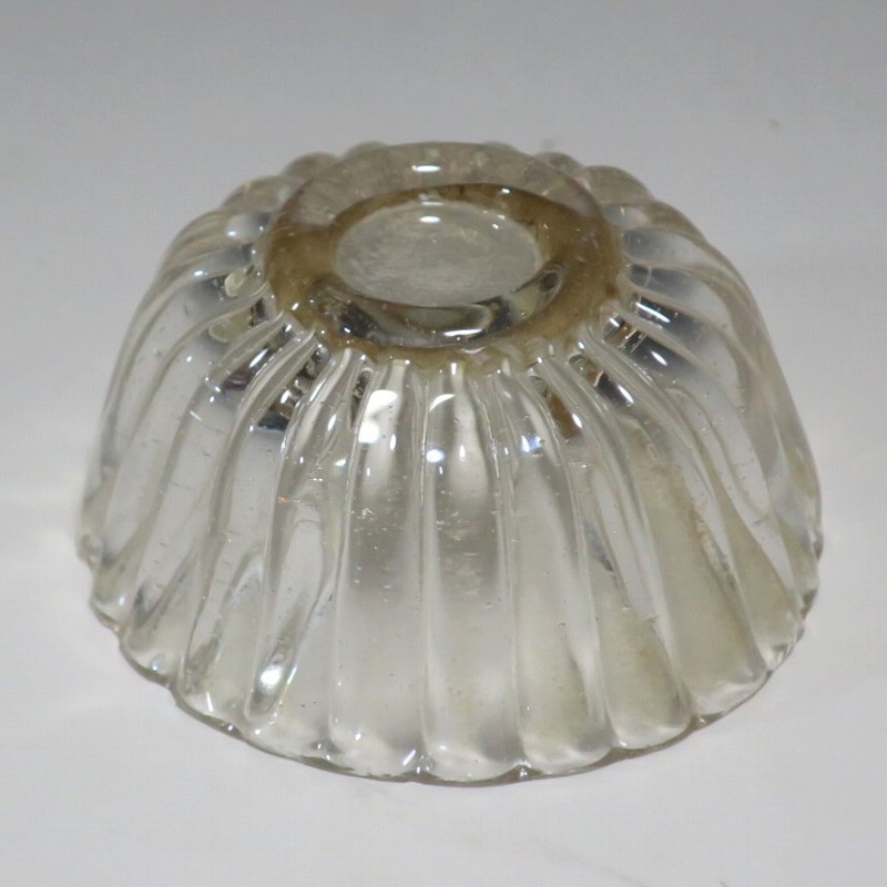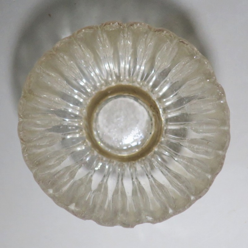 口径 約5.8cm/高さ 約3cm/高台径 約2.5cm 口辺に約5mmの欠けが2カ所、その他約1mm〜2mmのノミホツが複数あります。状態は写真でご確認ください。 日本でガラスの生産が始まったのは享保時代です。江戸の職人が蘭書などを参考に「びいどろ」と呼ばれるガラスを製作しました。江戸中期になるとガラス技術が発展、職人はかんざしや風鈴、万華鏡、金魚鉢など様々な商品を製作するようになります。本品は明治時代初期に製作された型吹きガラスの菊形盃。末尾に掲載した参考写真と同手の透明ガラスの作品です。手取りがずっしりと重く、弾くと金属的な音がします。日本酒器の盃としてお楽しみください。 | ||