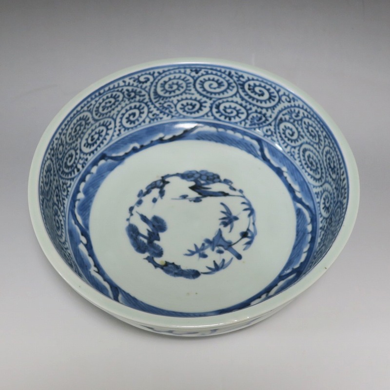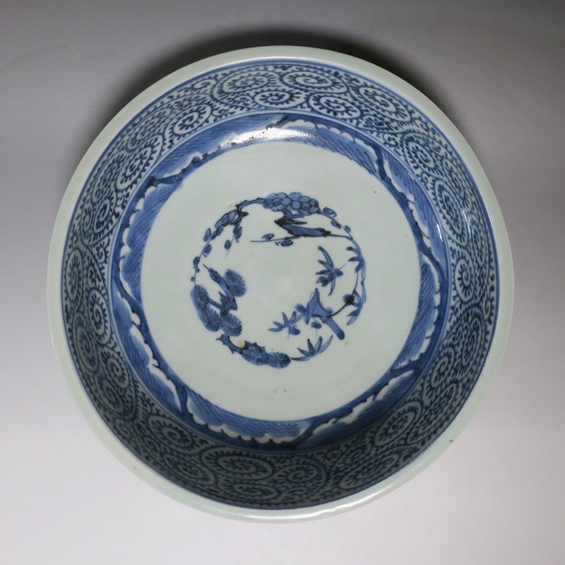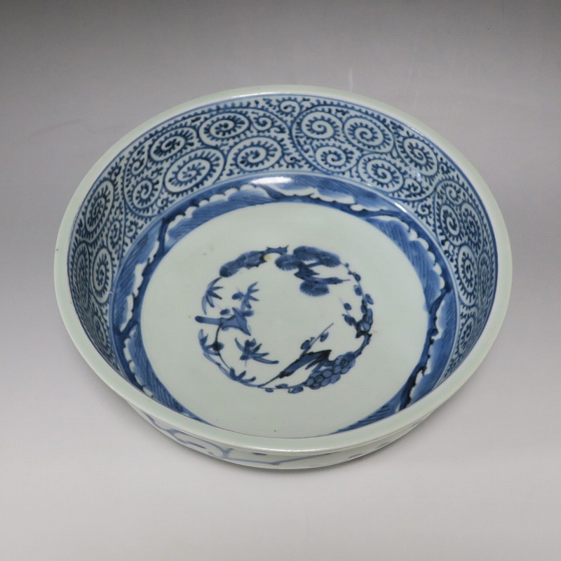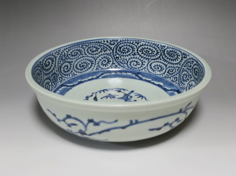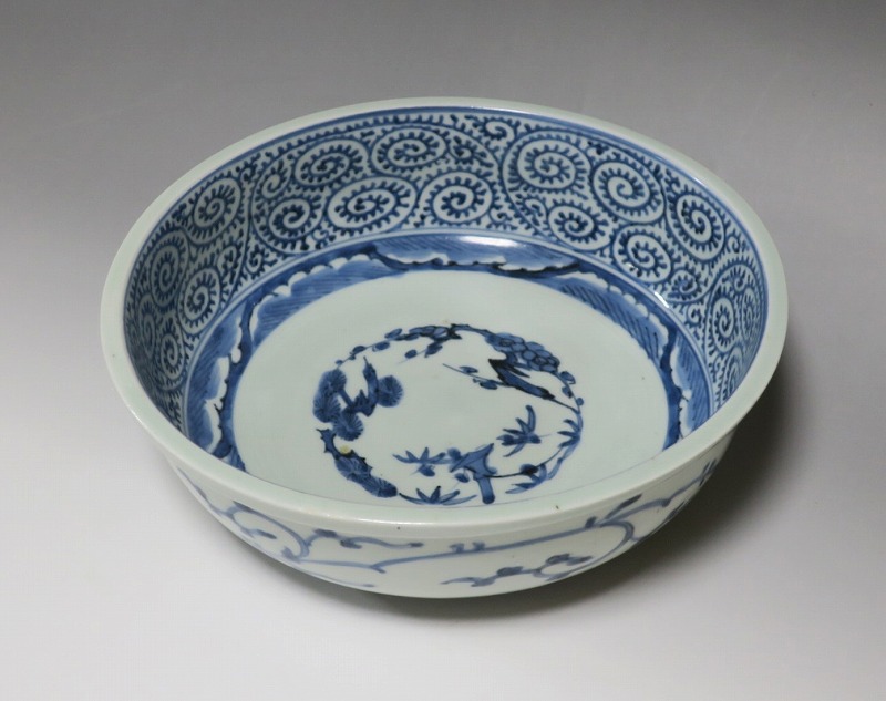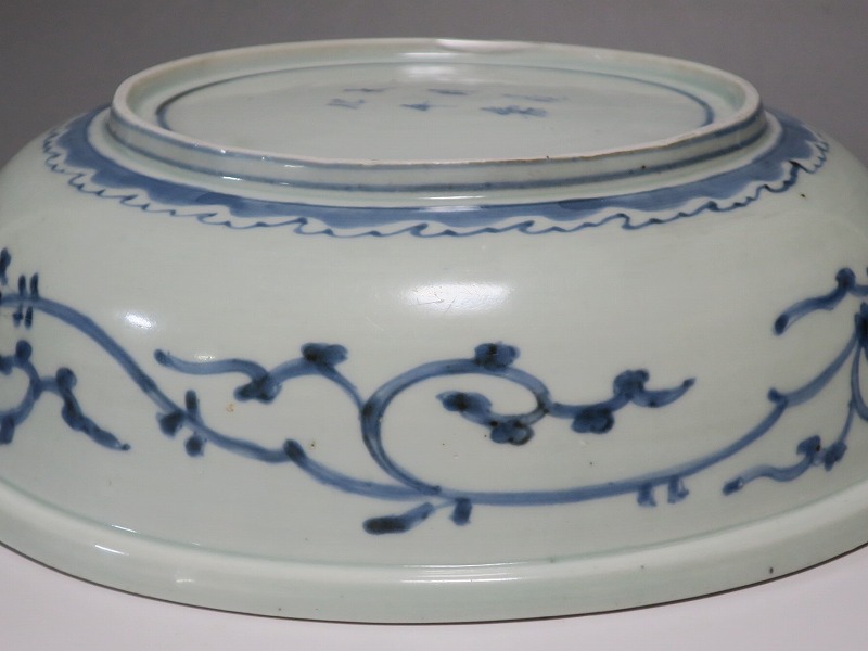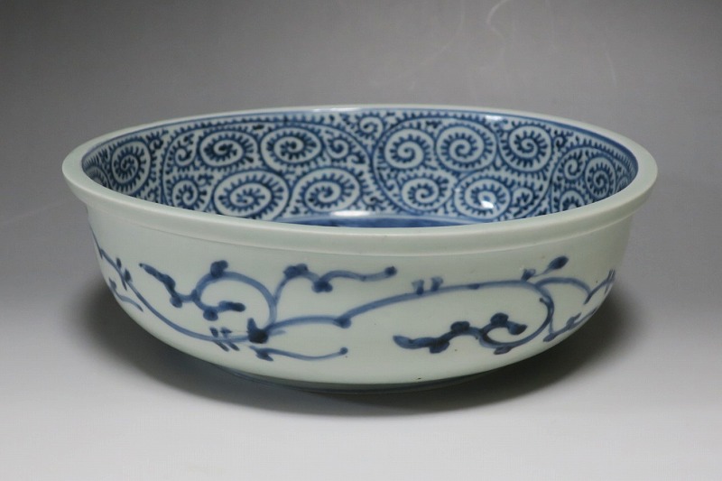(江戸時代中期 宝暦 18世紀中頃) 商品番号 3348 口径 約23.5cm/高さ 約7.5cm/高台径 約14.5cm 高台に約2.8cmの直しがあります。状態は写真でご確認ください。 18世紀前半、徳川吉宗が享保の改革を行うと北前船の拡大によって商品流通が活発になります。また、醤油の発明、漁業の技術改良などが日本人の食生活を一変させ、それに合わせたデザインの食器が開発されました。本品は見込みに染付でたこ唐草をデザインした鉢。たこ唐草は江戸時代、漁労技術の発達により漁獲高を上げた日本人が新鮮な海産物を食すようになったため流行したデザインです。日本ならではの和風デザイン。刺身や野菜を盛ると映えるでしょう。普段使いの食器としてお楽しみください。 | ||