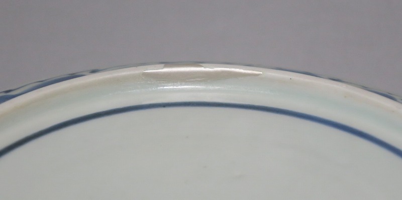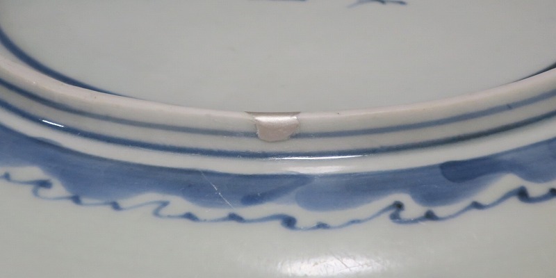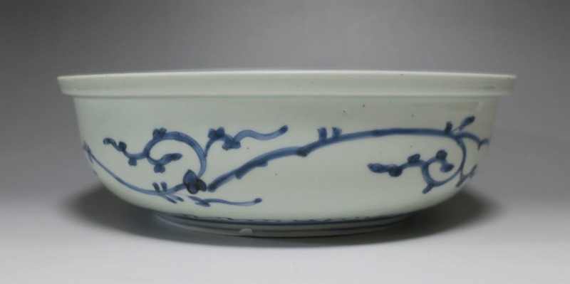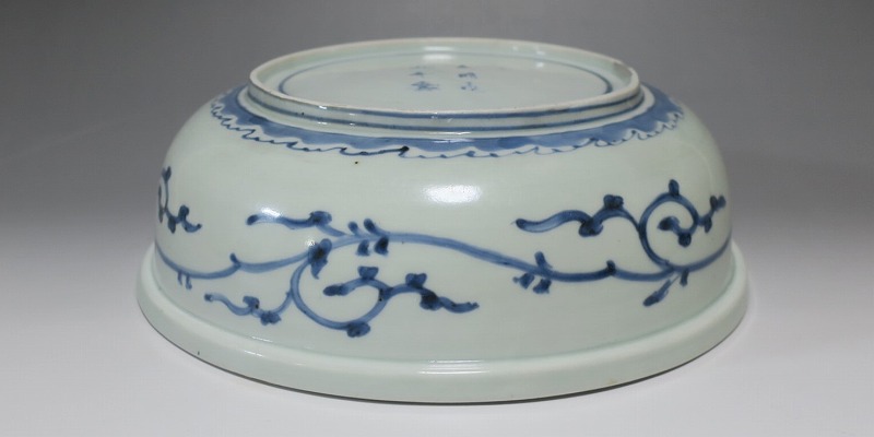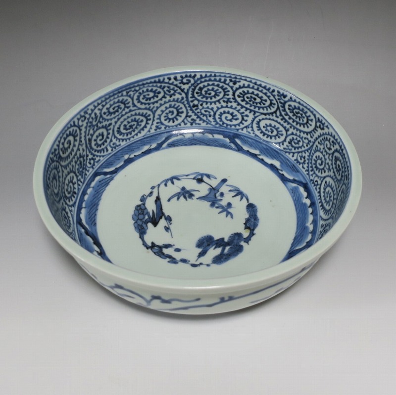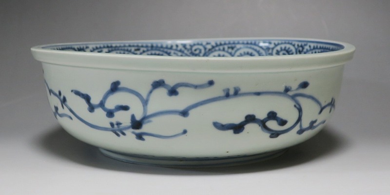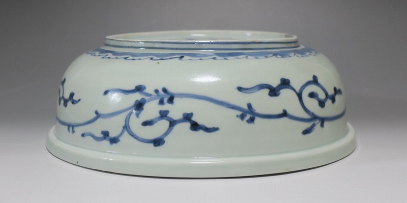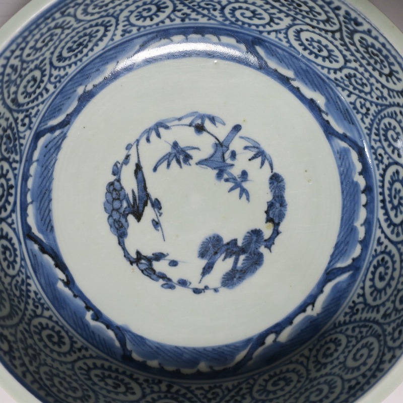 (江戸時代中期 宝暦 18世紀中頃) 商品番号 3348 口径 約23.5cm/高さ 約7.5cm/高台径 約14.5cm 高台に約2.8cmの直しがあります。状態は写真でご確認ください。 18世紀前半、徳川吉宗が享保の改革を行うと北前船の拡大によって商品流通が活発になります。また、醤油の発明、漁業の技術改良などが日本人の食生活を一変させ、それに合わせたデザインの食器が開発されました。本品は見込みに染付でたこ唐草をデザインした鉢。たこ唐草は江戸時代、漁労技術の発達により漁獲高を上げた日本人が新鮮な海産物を食すようになったため流行したデザインです。日本ならではの和風デザイン。刺身や野菜を盛ると映えるでしょう。普段使いの食器としてお楽しみください。 | ||