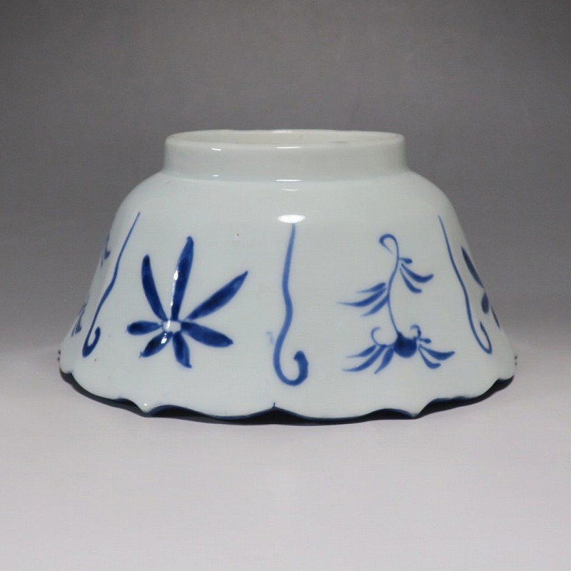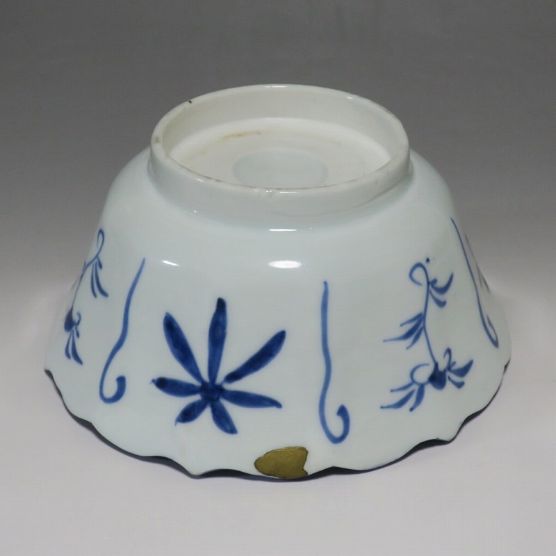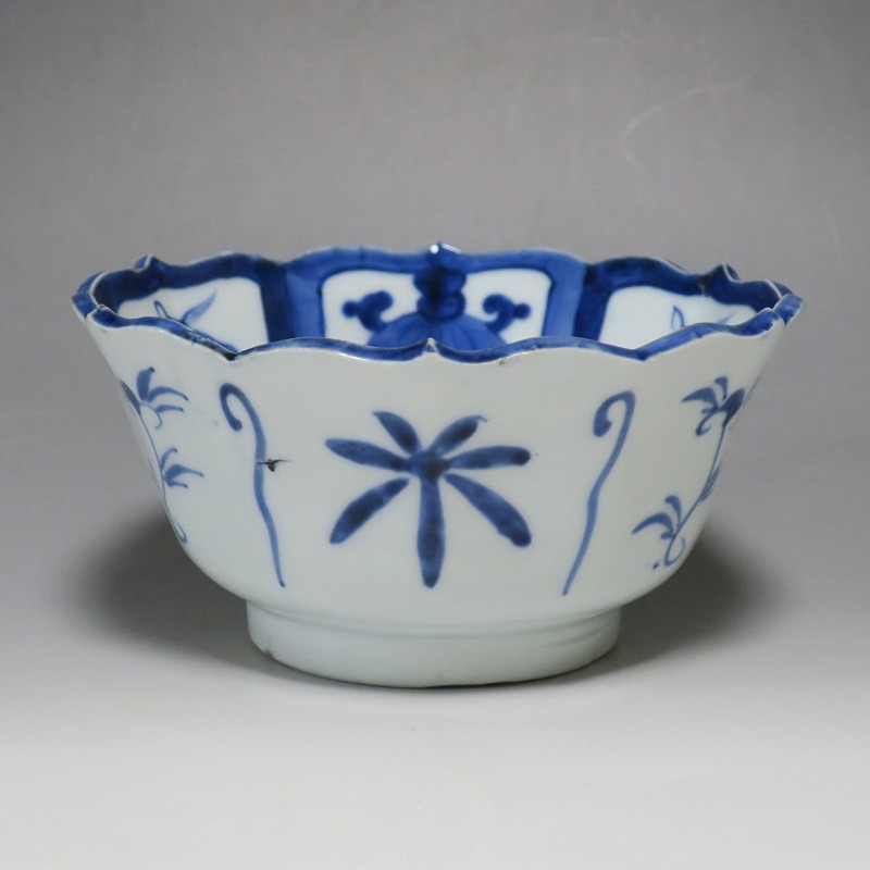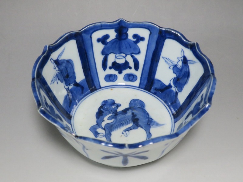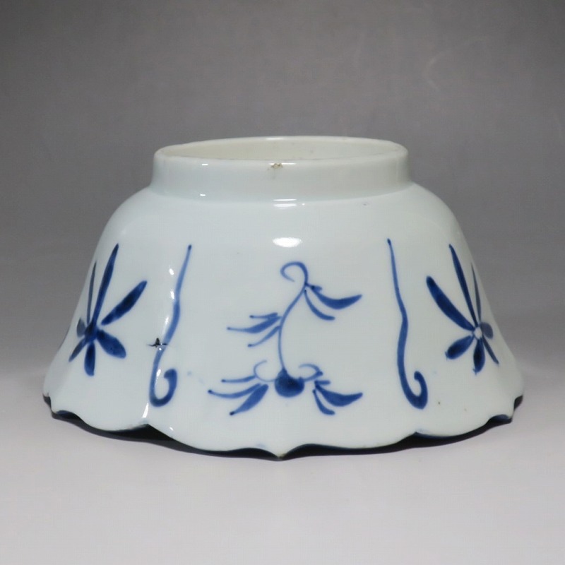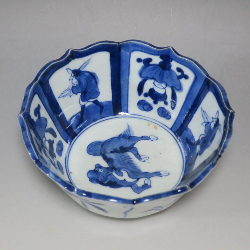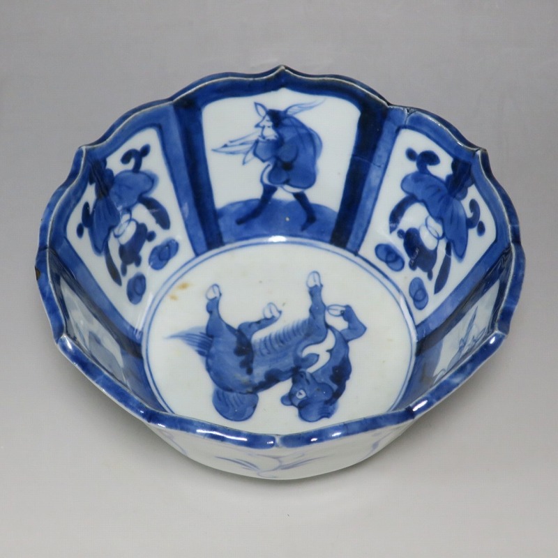 (江戸時代後期 19世紀前半) 商品番号 3369 口径 約17.3cm/高さ 約8.5cm/高台径 約8.8cm 口辺外側に約1.5cmの直しがあります。状態は写真でご確認ください。 19世紀前半、化政時代になると磁器生産が日本各地で始まります。その中でも伊万里焼は他の窯が追随できない品質、時代の流行に対応した作品を製作しました。本品は染付で南蛮人とランプ、洋犬を描いた輪花鉢。当時、南蛮人は海外から文物を運んでくれる吉祥として考えられていました。本品には江戸時代では珍しいランプが描かれています。江戸時代の交易を感じさせてくれる南蛮尽くしといえる作品。インテリア、食器としてお楽しみください。 | ||