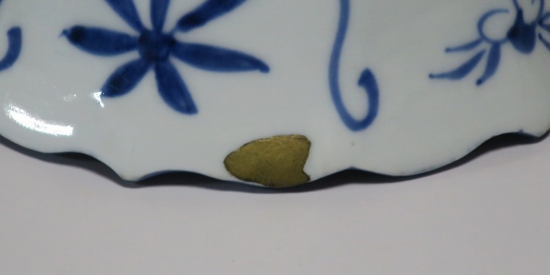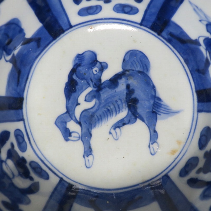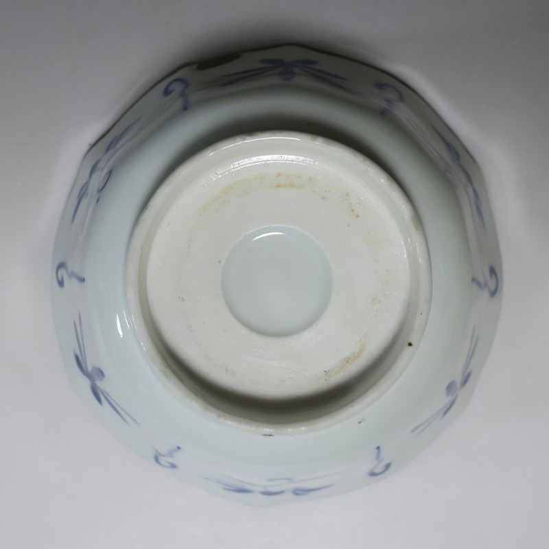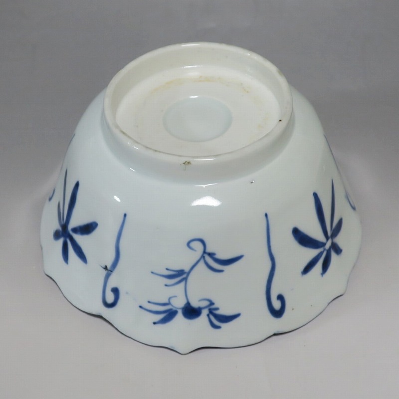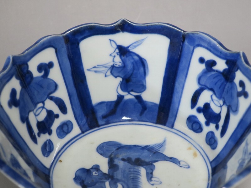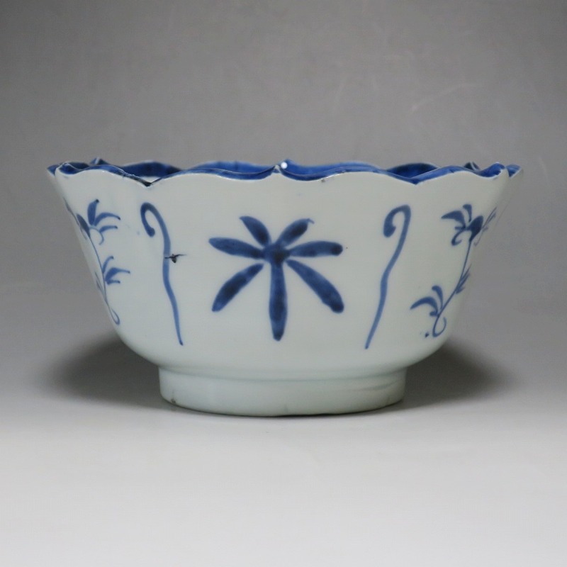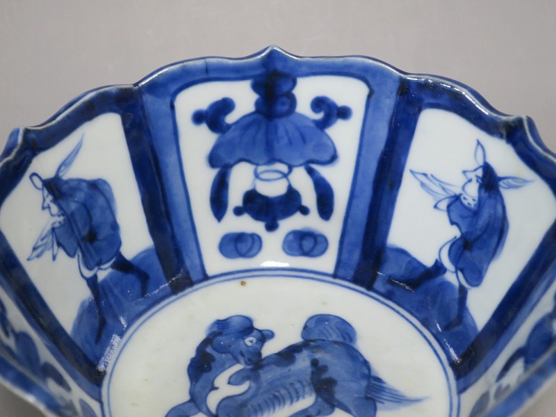 (江戸時代後期 19世紀前半) 商品番号 3369 口径 約17.3cm/高さ 約8.5cm/高台径 約8.8cm 口辺外側に約1.5cmの直しがあります。状態は写真でご確認ください。 19世紀前半、化政時代になると磁器生産が日本各地で始まります。その中でも伊万里焼は他の窯が追随できない品質、時代の流行に対応した作品を製作しました。本品は染付で南蛮人とランプ、洋犬を描いた輪花鉢。当時、南蛮人は海外から文物を運んでくれる吉祥として考えられていました。本品には江戸時代では珍しいランプが描かれています。江戸時代の交易を感じさせてくれる南蛮尽くしといえる作品。インテリア、食器としてお楽しみください。 | ||