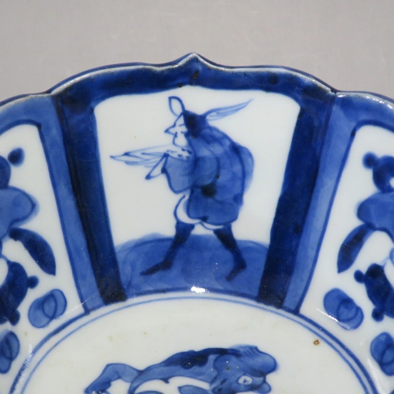 伊万里焼 染付 南蛮人とランプ、洋犬 輪花鉢