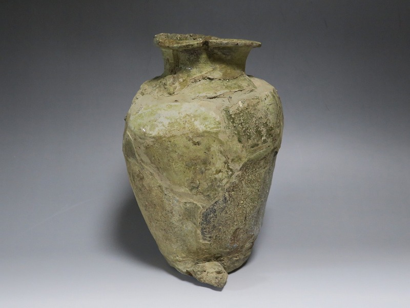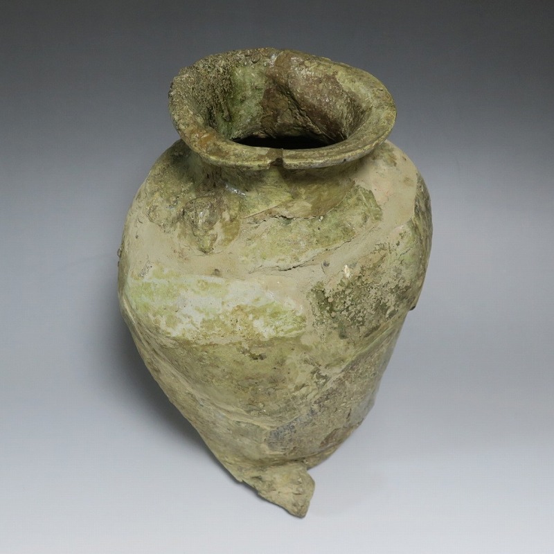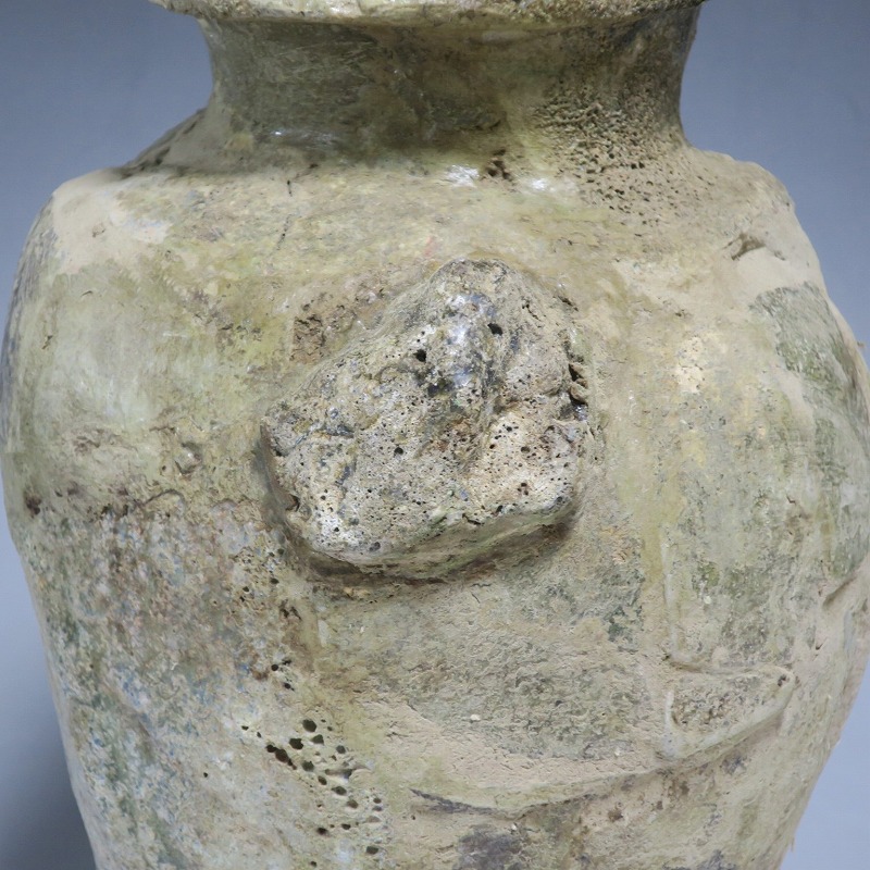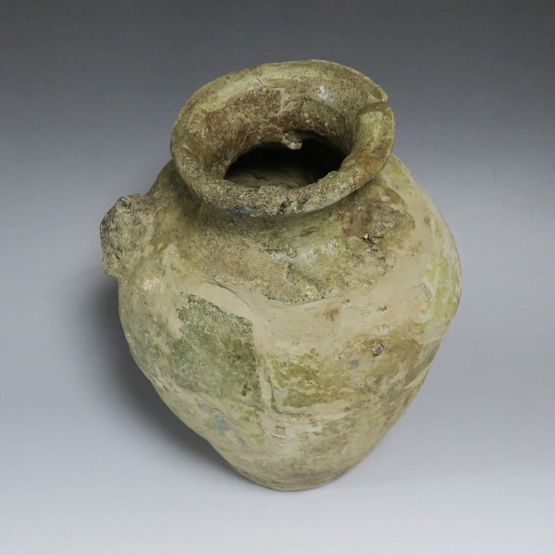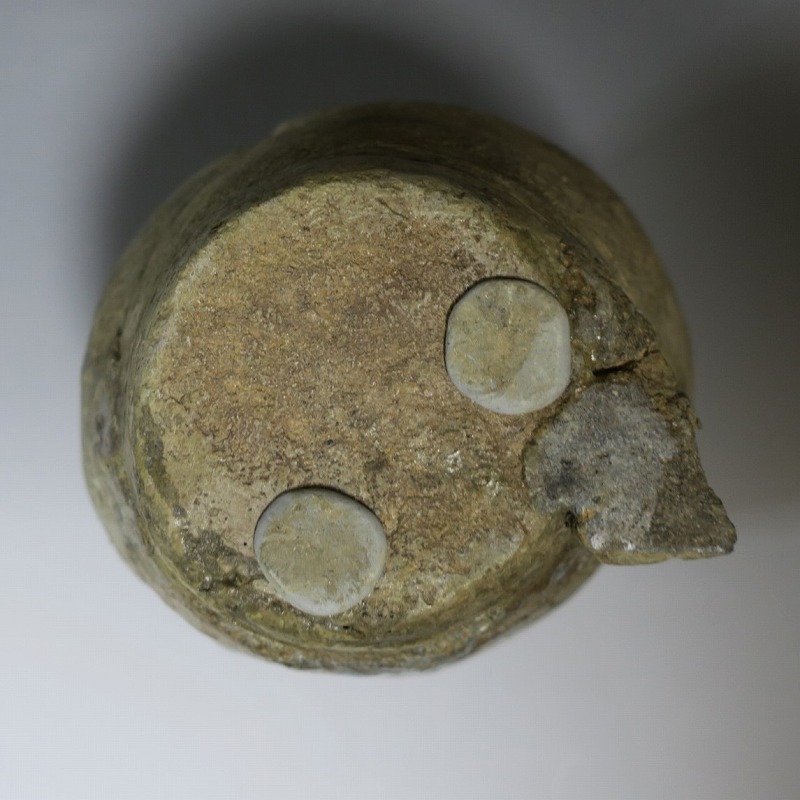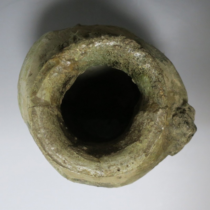 高さ 約27cm/胴径 約20cm 発掘品のため全体的に呼継ぎ直しがあり、底部に座りを安定させるためのパテが付いています。状態は写真でご確認ください。 常滑焼は、愛知県常滑市周辺で平安時代末期から活動している六古窯の一つです。中世から近世にかけて壺や甕などを製作、作品は全国各地で使用されました。本品は物原に廃棄されていた陶片を集めて復元した鎌倉時代の壺。本作のような壺は当時、経典や鏡などの宗教用具を入れる祭器として使用されました。三筋壺の流れを汲む縦長の壺。釉薬の一部が海鼠釉になっている中世陶の雰囲気を感じさせてくれます。落としを使って秋草などを活けると映えるでしょう。 | ||