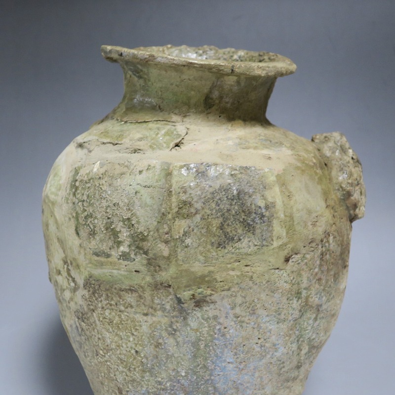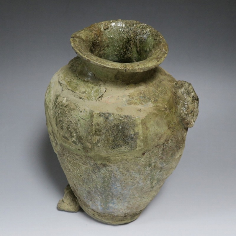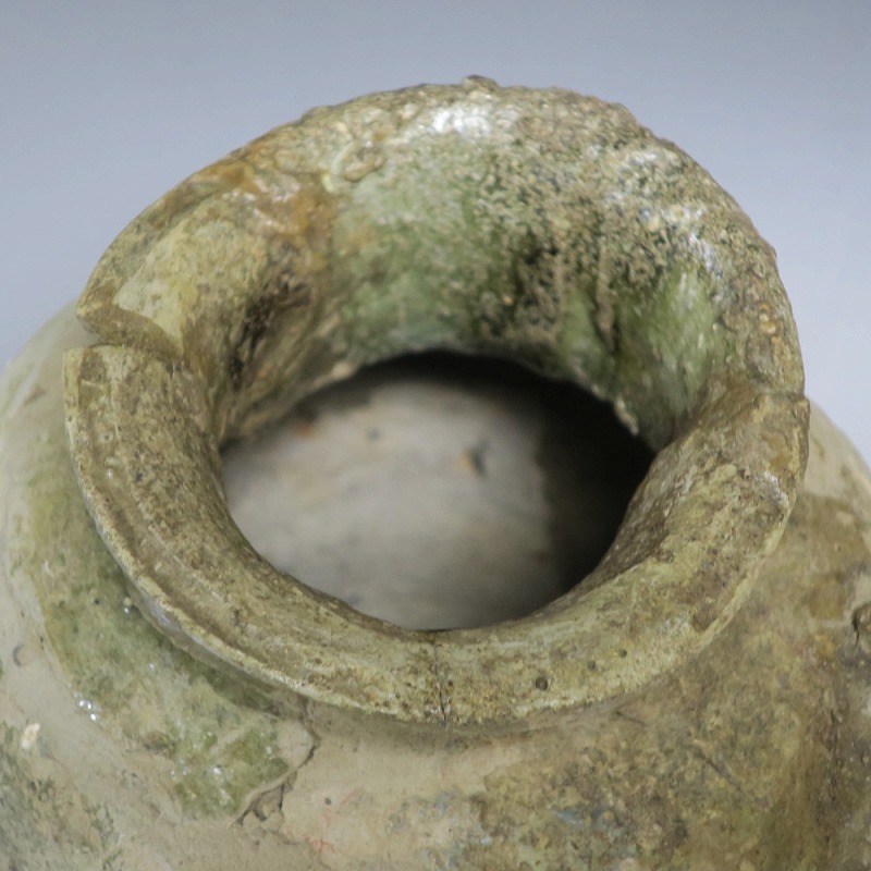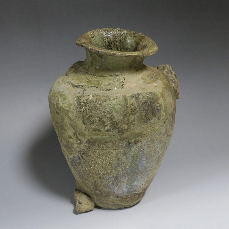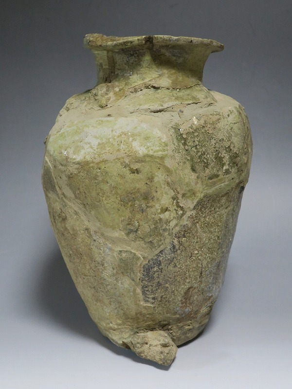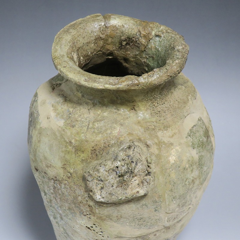 高さ 約27cm/胴径 約20cm 発掘品のため全体的に呼継ぎ直しがあり、底部に座りを安定させるためのパテが付いています。状態は写真でご確認ください。 常滑焼は、愛知県常滑市周辺で平安時代末期から活動している六古窯の一つです。中世から近世にかけて壺や甕などを製作、作品は全国各地で使用されました。本品は物原に廃棄されていた陶片を集めて復元した鎌倉時代の壺。本作のような壺は当時、経典や鏡などの宗教用具を入れる祭器として使用されました。三筋壺の流れを汲む縦長の壺。釉薬の一部が海鼠釉になっている中世陶の雰囲気を感じさせてくれます。落としを使って秋草などを活けると映えるでしょう。 | ||