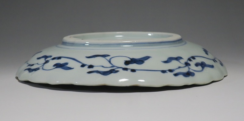 (江戸時代中期 18世紀後半) 商品番号 3554 口径 約18.5cm/高さ 約3cm/高台径 約10cm 窯傷や縁の金彩の擦れがありますが、完品です。状態は写真でご確認ください。 18世紀になると伊万里焼は北前船に乗せられ、日本各地に運ばれるようになります。磁器交易の商人見本帳を持って商家や豪農を訪ね、有田の陶工は注文通りに作品を製作しました。本品は表に色絵で葵と軍配、裏面に染付で唐草文をデザインした六寸皿。見込みの重ね焼きの部分に黄釉が施された部分がある作品です。民芸の雰囲気があるので郷土料理などを盛っても映えるでしょう。普段使いの食器としてお楽しみください。 | ||