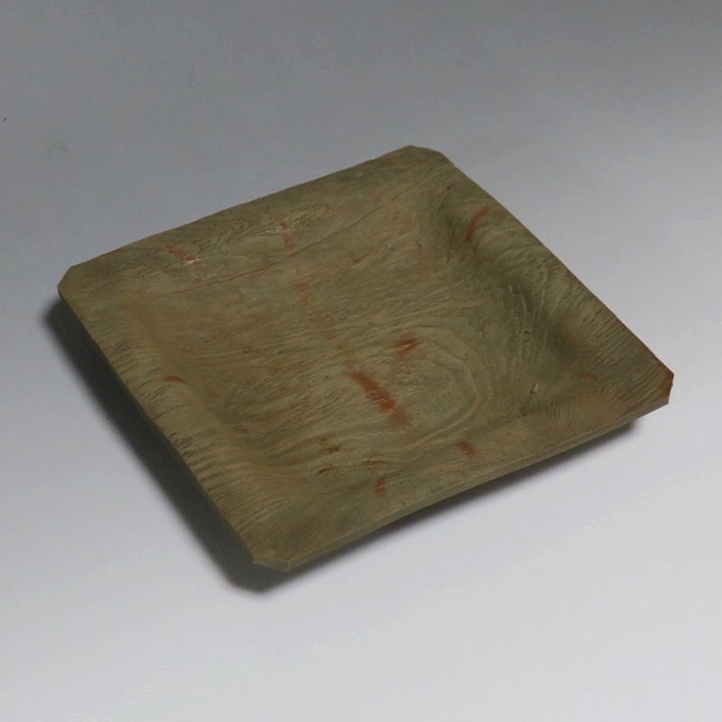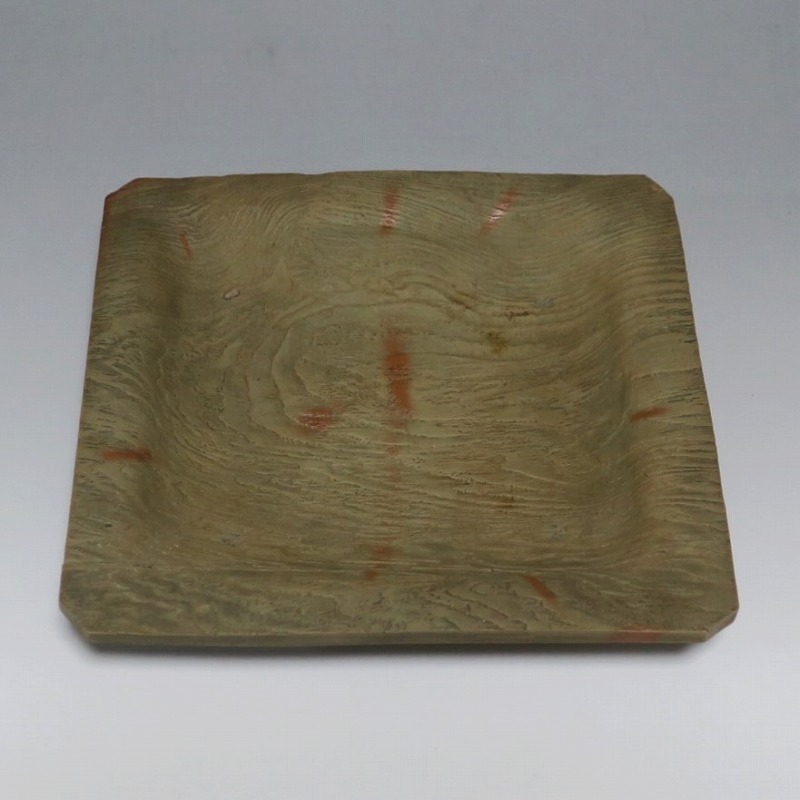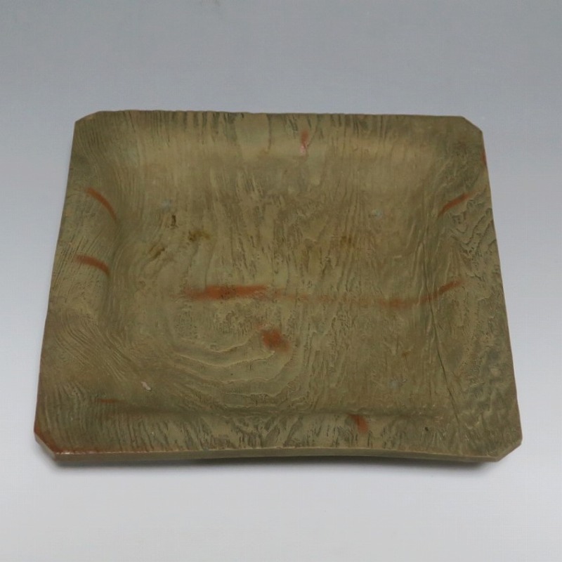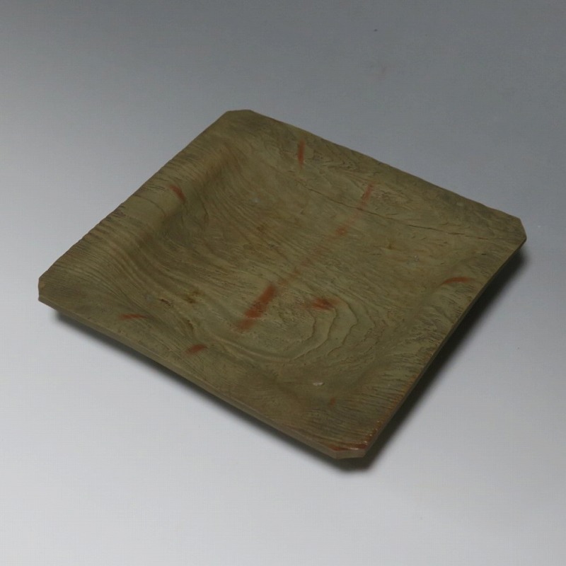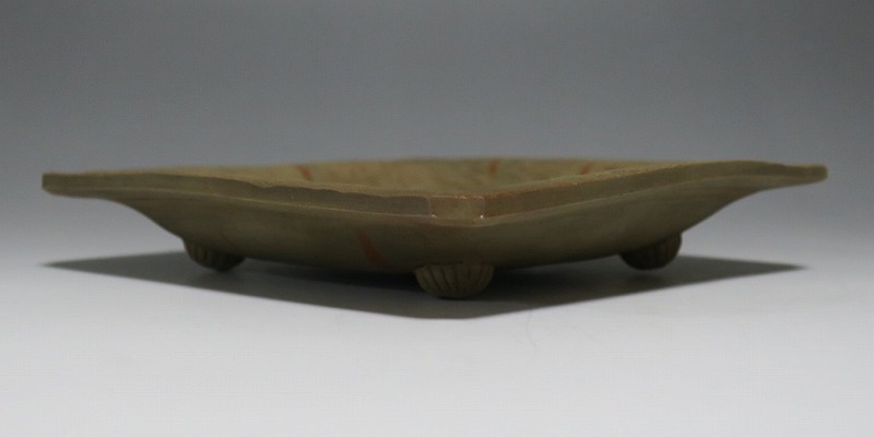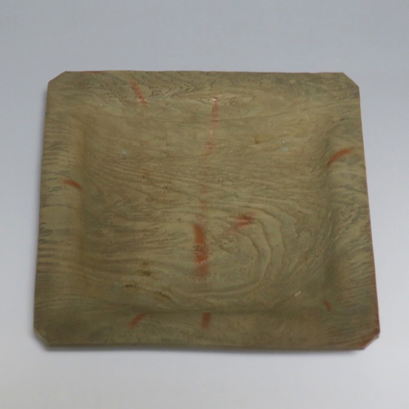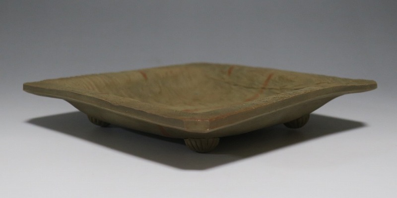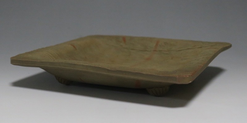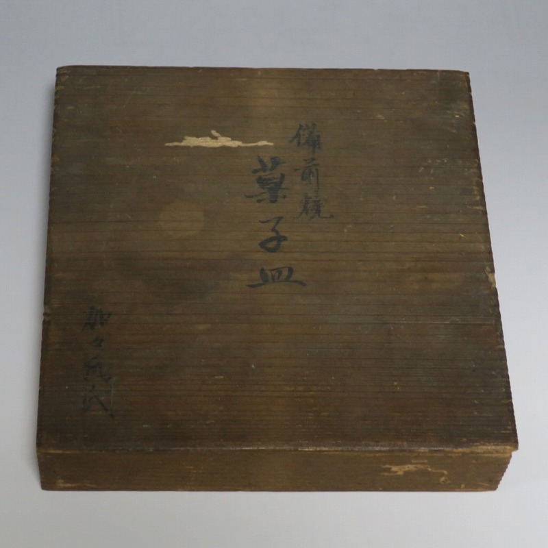 口径 約14cm角/高さ 約2.6cm 窯傷がありますが、総じて良い状態です。状態は写真でご確認ください。 備前焼は、中世から続く六古窯の一つで耐水性のあるb器作品を製作しています。桃山時代になると茶陶の生産を始め、他の窯よりも一段と格が上がりました。本品は明治時代に作られた足付き角皿。箱に「菓子器」とあるように和菓子を盛る皿です。木目のような素地に微妙な火襷が掛かっています。秋らしい枯れた感じのある菓子器です。菓子器の他、食器として使用しても楽しいでしょう。 | ||
