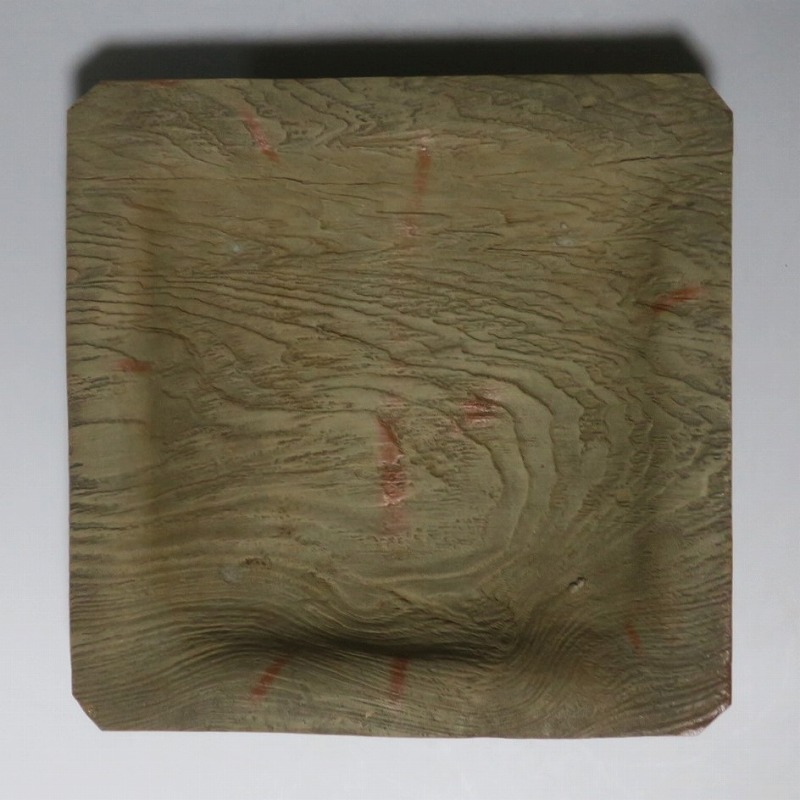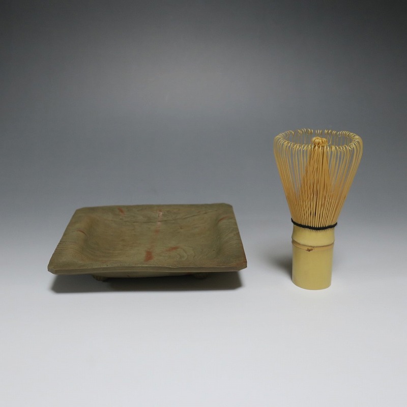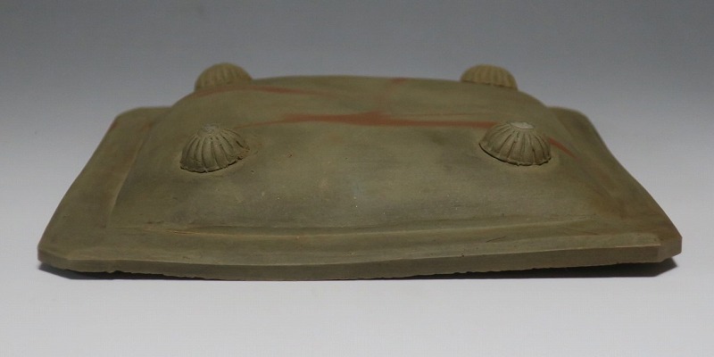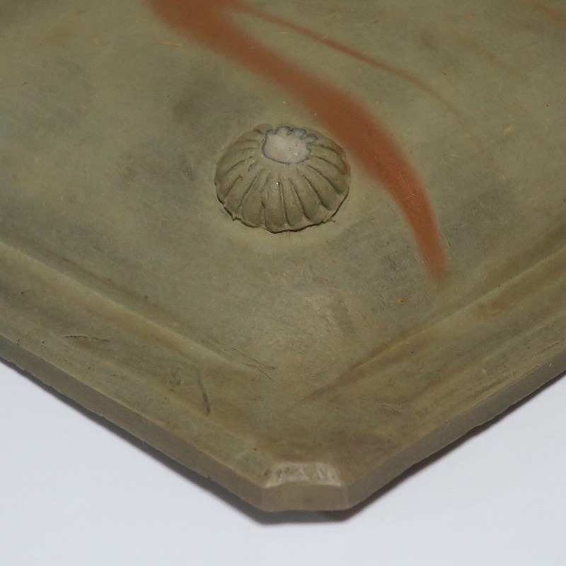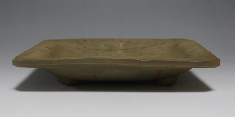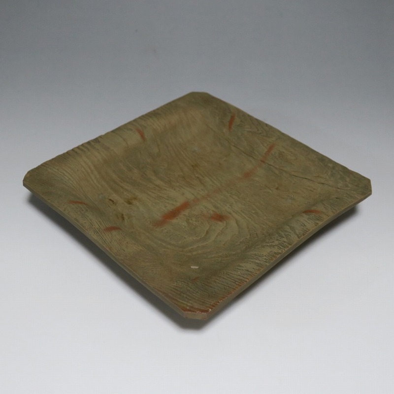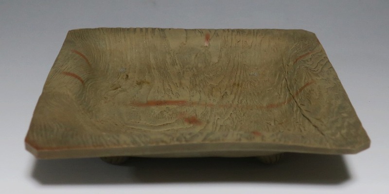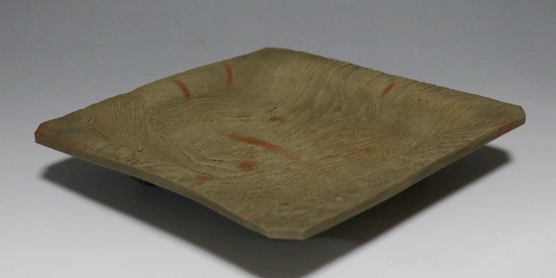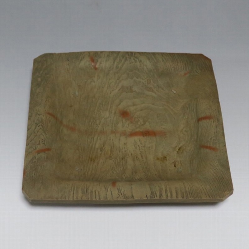 口径 約14cm角/高さ 約2.6cm 窯傷がありますが、総じて良い状態です。状態は写真でご確認ください。 備前焼は、中世から続く六古窯の一つで耐水性のあるb器作品を製作しています。桃山時代になると茶陶の生産を始め、他の窯よりも一段と格が上がりました。本品は明治時代に作られた足付き角皿。箱に「菓子器」とあるように和菓子を盛る皿です。木目のような素地に微妙な火襷が掛かっています。秋らしい枯れた感じのある菓子器です。菓子器の他、食器として使用しても楽しいでしょう。 | ||