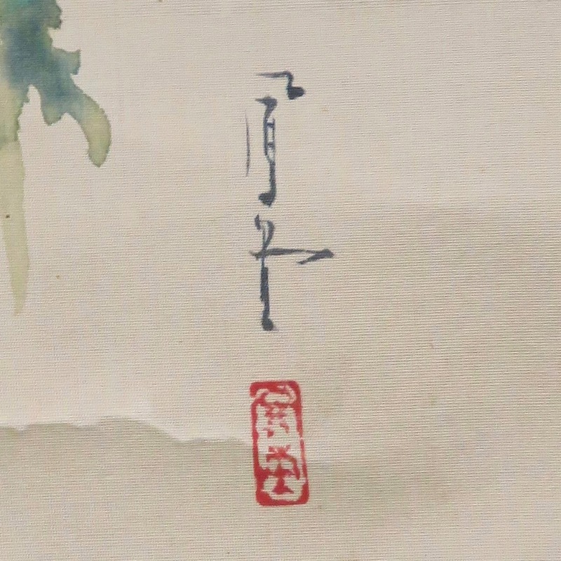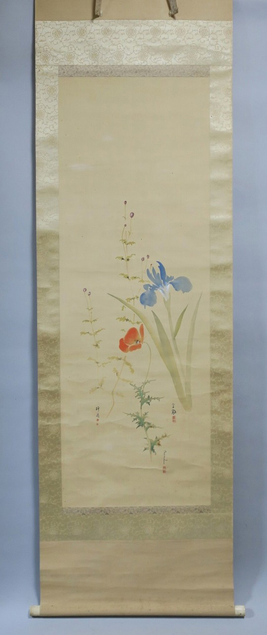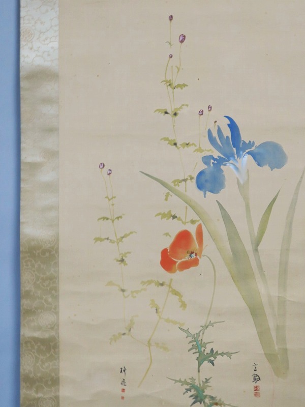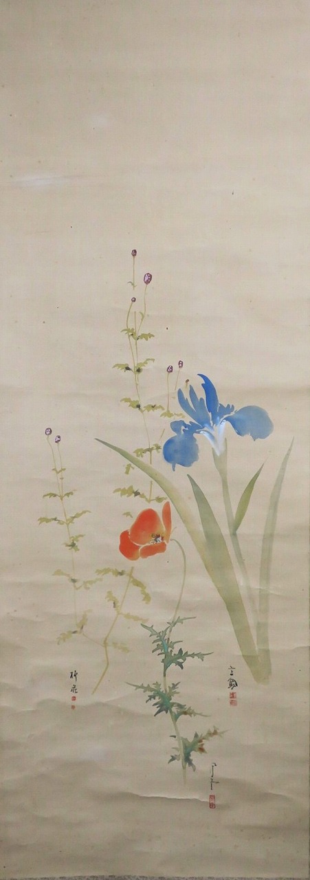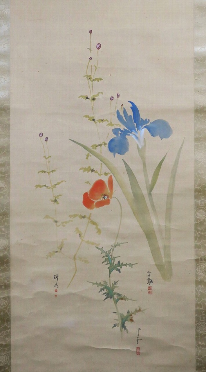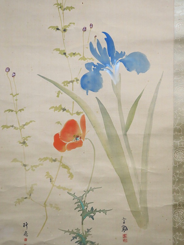 本紙サイズ 縦横 119cm×41cm 絹本肉筆。右の軸先の蓋が欠損し、経年の汚れや染み、折れ、作品の右下(菖蒲の根元)に赤い線の汚れが若干あります。状態は写真でご確認ください。 大正、昭和時代初期に活躍した日本画家の合作です。ワレモコウを描いた伊藤柳荘(いとうりゅうそう、1887年愛知県生まれ)は山本梅莊の弟子、ポピーを描いた前田鳳堂(まえだほうどう、東京生まれ)は野田九浦の弟子です。菖蒲を描いた画家は不明。3人とも花鳥画が得意だったので、本軸を合作したのでしょう。初夏の花が描かれた爽やかな作品。これからの季節にぴったりです。 | ||
