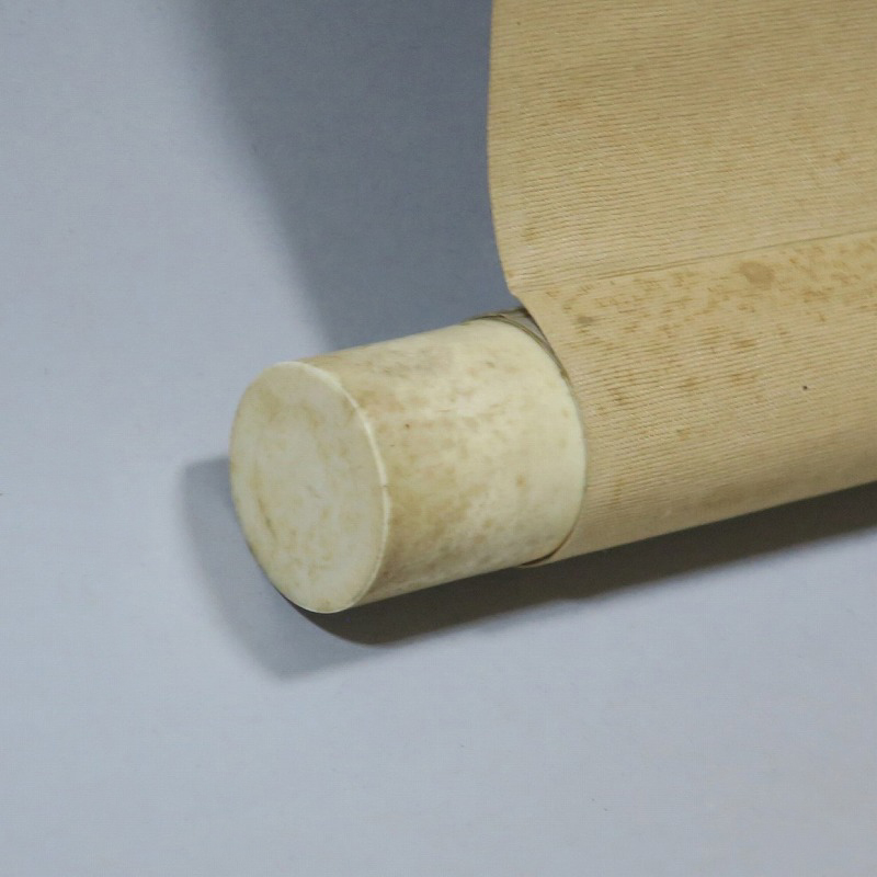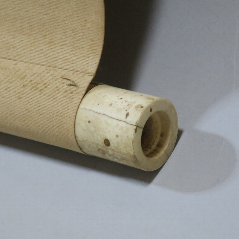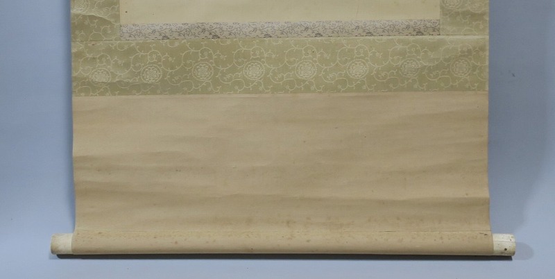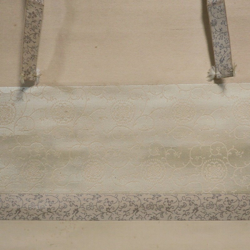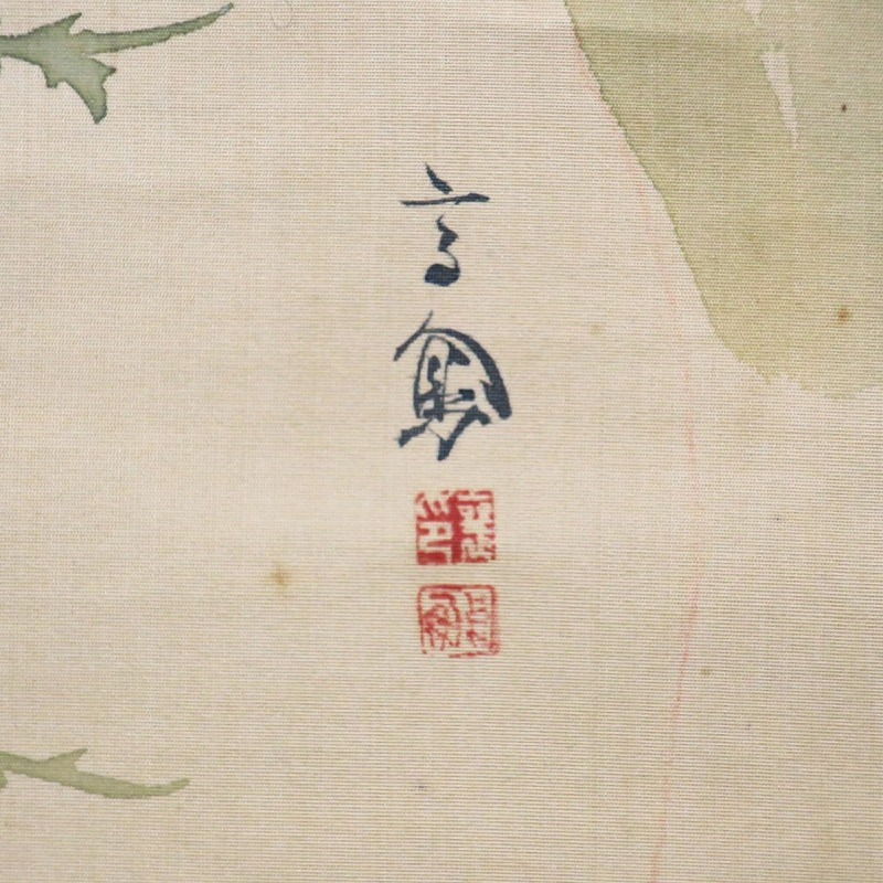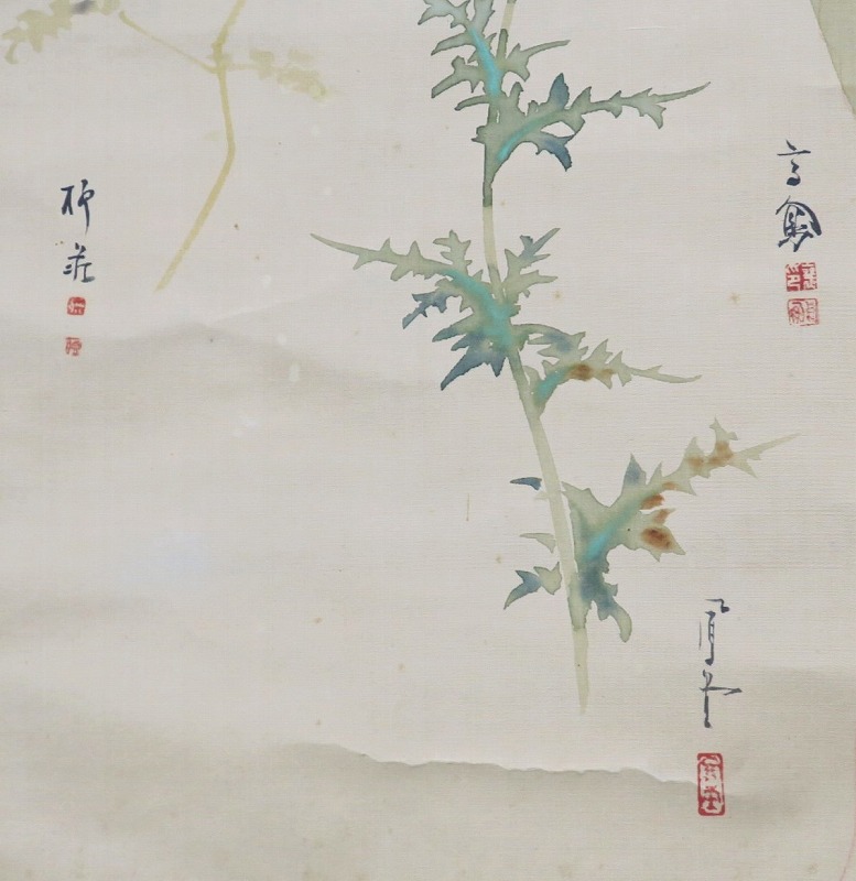 本紙サイズ 縦横 119cm×41cm 絹本肉筆。右の軸先の蓋が欠損し、経年の汚れや染み、折れ、作品の右下(菖蒲の根元)に赤い線の汚れが若干あります。状態は写真でご確認ください。 大正、昭和時代初期に活躍した日本画家の合作です。ワレモコウを描いた伊藤柳荘(いとうりゅうそう、1887年愛知県生まれ)は山本梅莊の弟子、ポピーを描いた前田鳳堂(まえだほうどう、東京生まれ)は野田九浦の弟子です。菖蒲を描いた画家は不明。3人とも花鳥画が得意だったので、本軸を合作したのでしょう。初夏の花が描かれた爽やかな作品。これからの季節にぴったりです。 | ||
