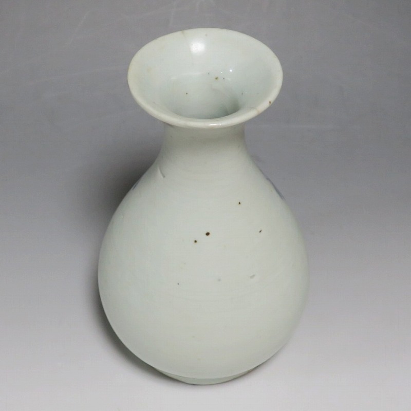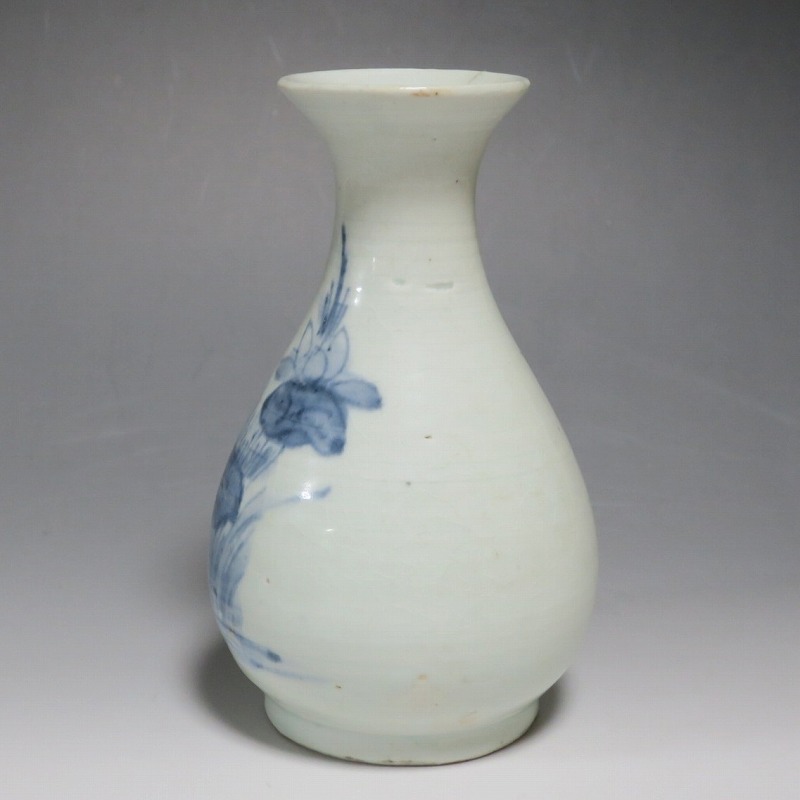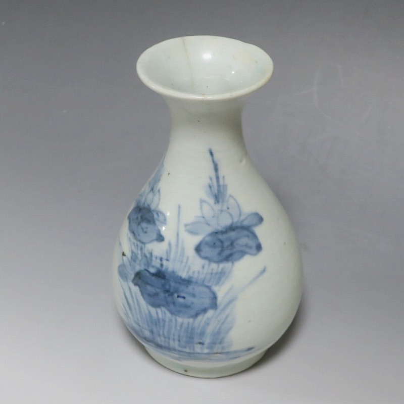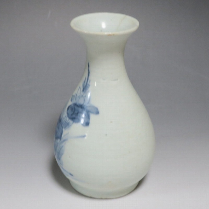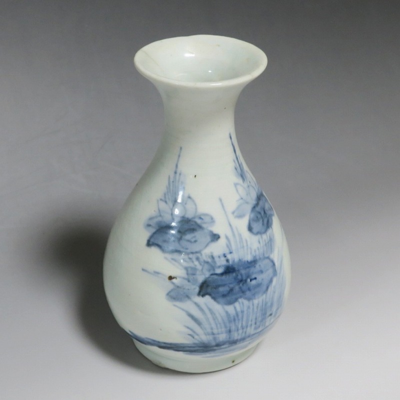 高さ 約17.3cm/胴径 約10.3cm 口辺から約1.5cmと3cmのニュウ、高台に約1cmの直し、下部にカンニュウがあります。状態は写真でご確認ください。 苗代川焼は16世紀末、鹿児島の串木野に移住した朴平意の一団が創設した窯です。 苗代川焼には「黒もん」と呼ばれる日常雑器と「しろもん」と呼ばれる陶器や磁器があります。本品は南京皿山窯で作られた太い首部を持った染付磁器の徳利。他の窯にはない珍しい造形の徳利です。参考写真の花生に似ているので、本来は花生として作られた作品かもしれません。珍品です。サイズが良いので日本酒、焼酎用の徳利として使用できるでしょう。 | ||