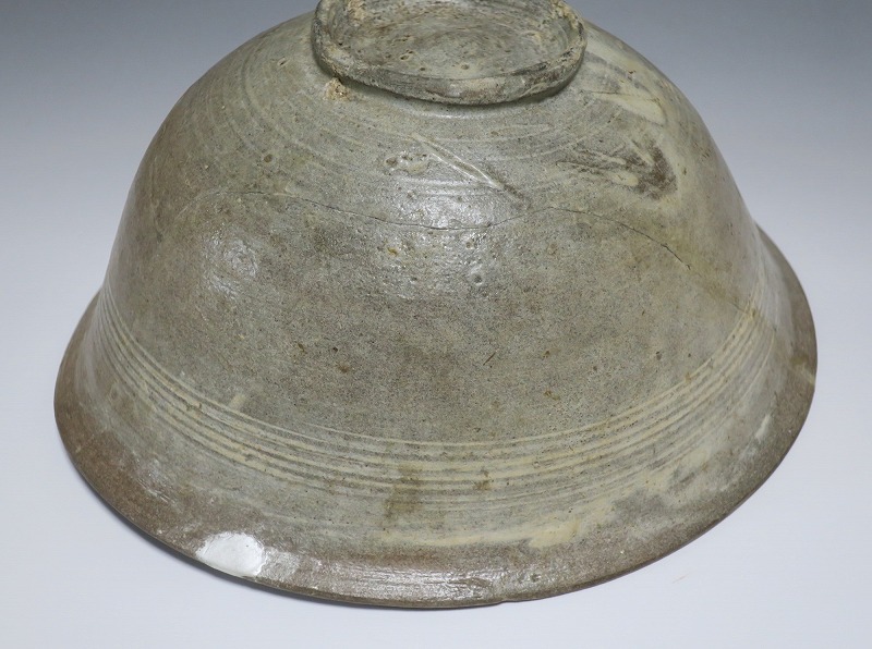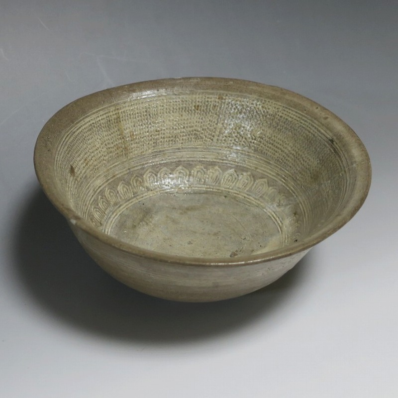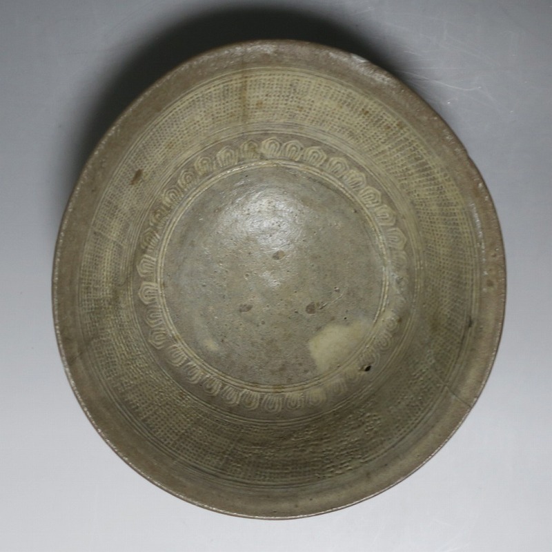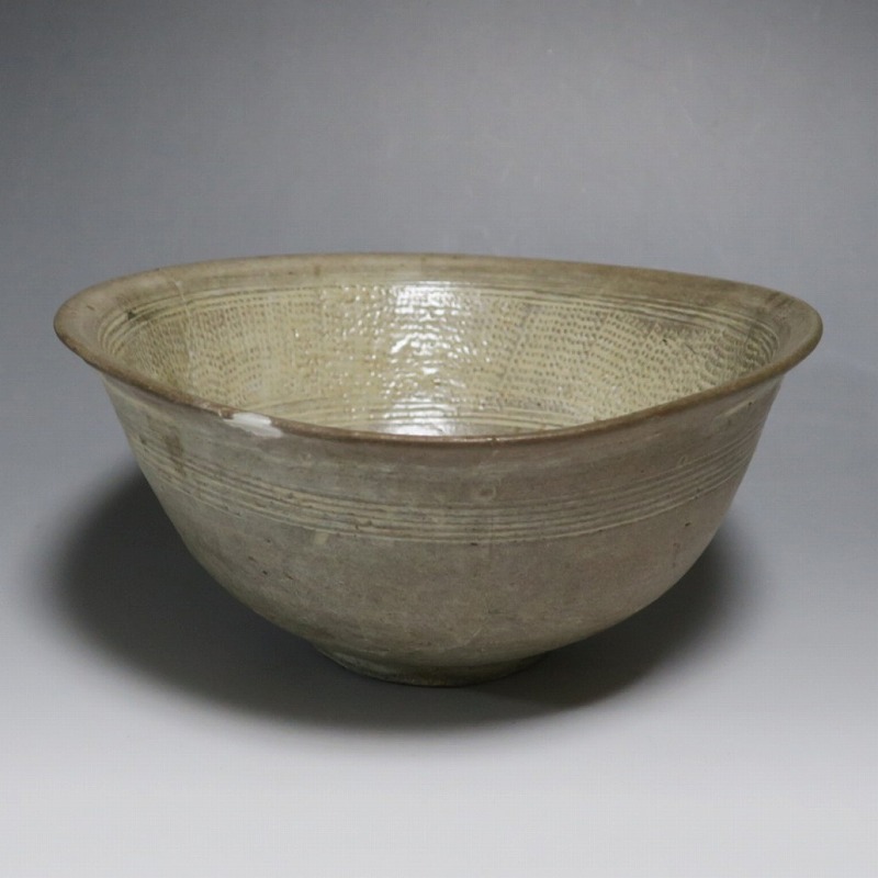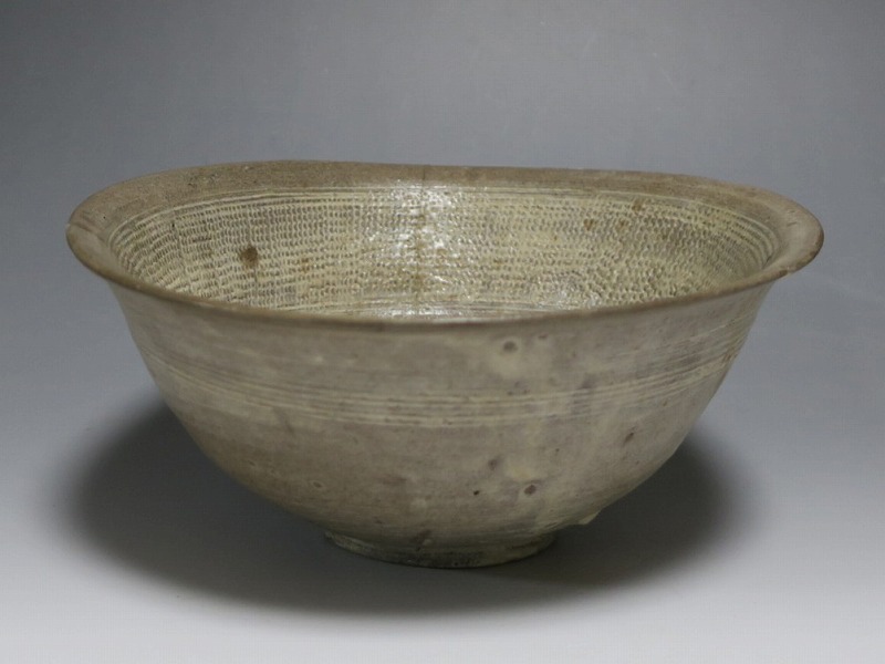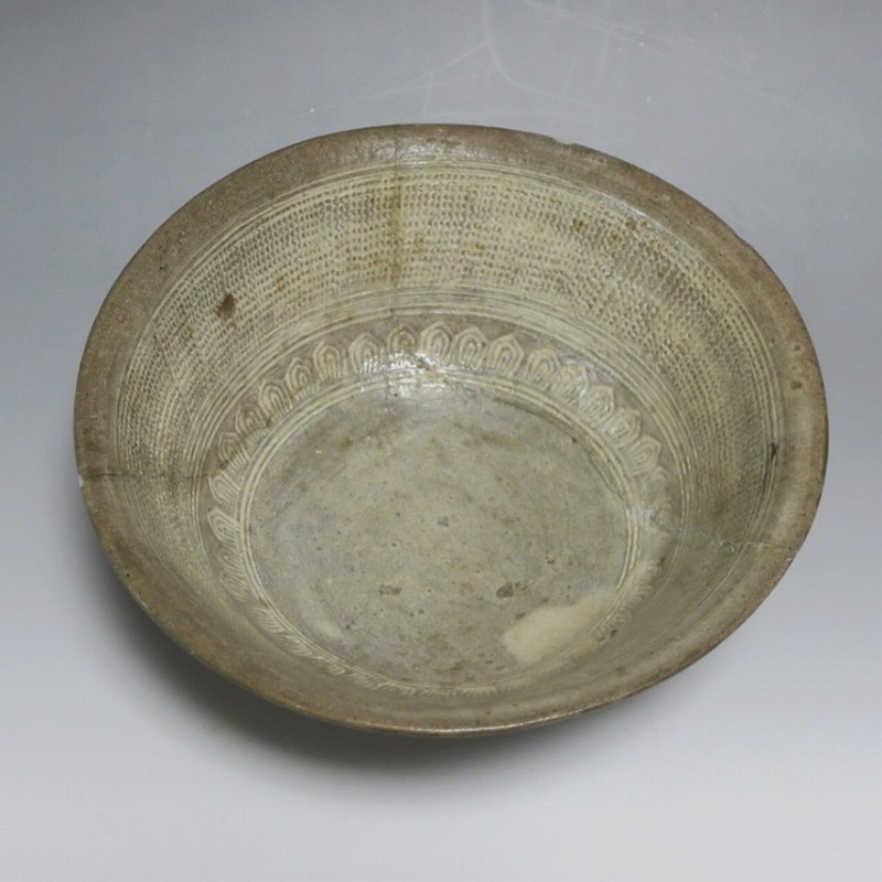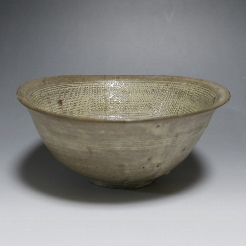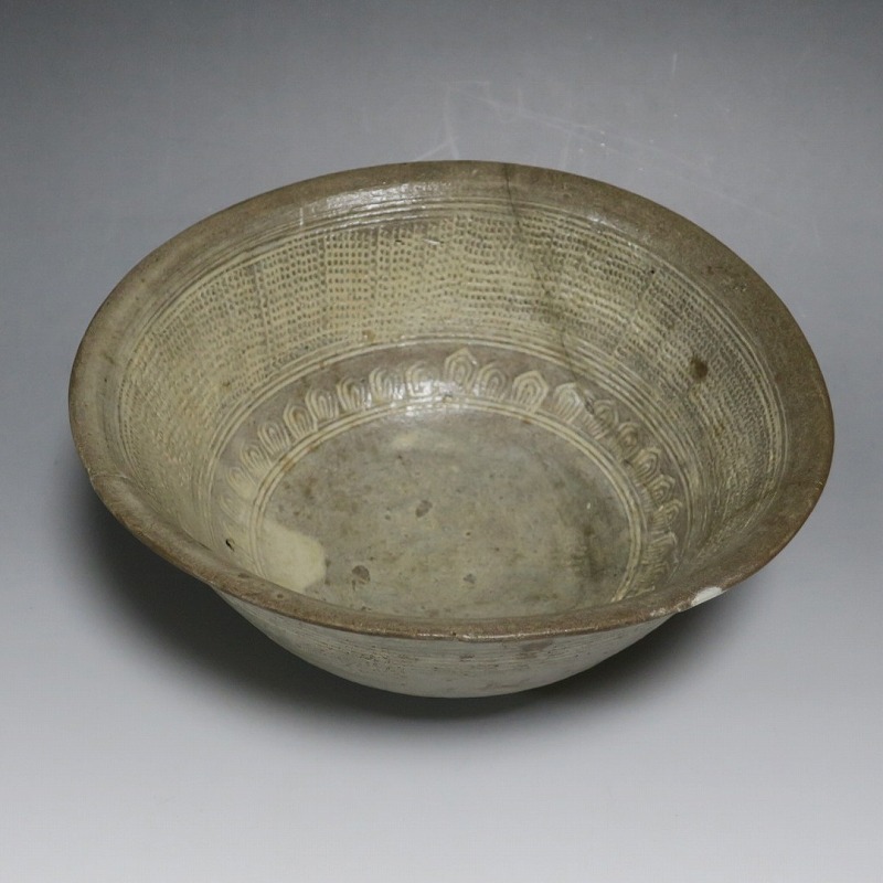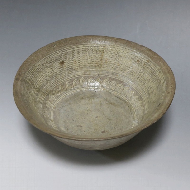 (李朝時代前期 15世紀) 商品番号 3780 口径 約21cm〜19.5cm/高さ 約9.5cm/高台径 約6.5cm 大きく3つに割れ、全体的に修理が施されています。状態は写真でご確認ください。 高麗から李朝に政権が交代した14世紀、粉青沙器と呼ばれる新しい様式の焼物が出現します。灰釉、刷毛目、井戸などの多様な粉青沙器は独特の味わいがあるので古美術品として人気があります。本品は白象嵌で輪線花文を施した鉢。ゆがんだ造形、直しが景色となっている迫力のある作品です。食器というよりもオブジェ、花器として使用すると面白いでしょう。 | ||