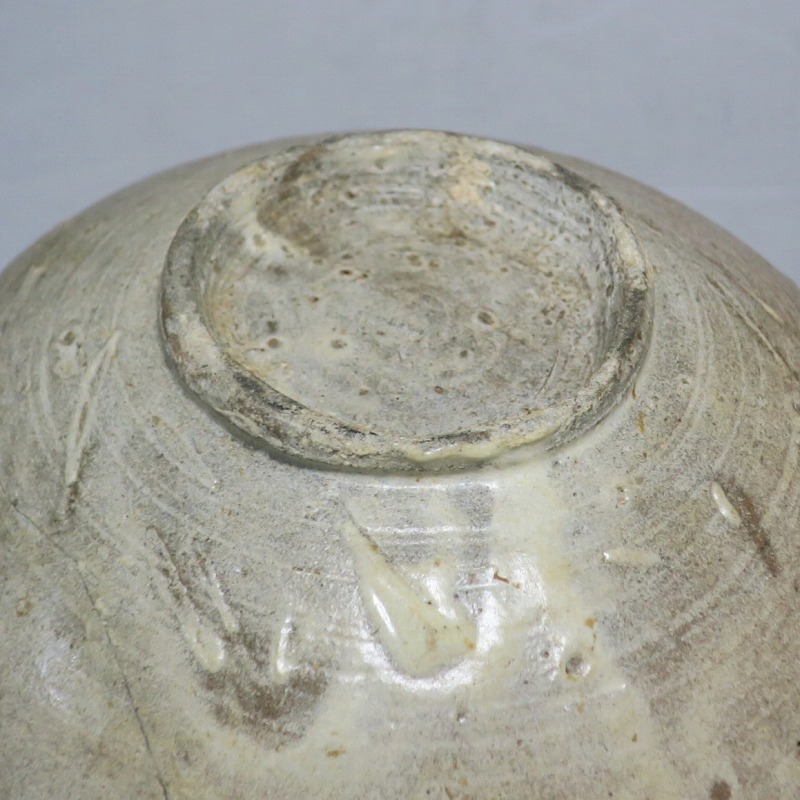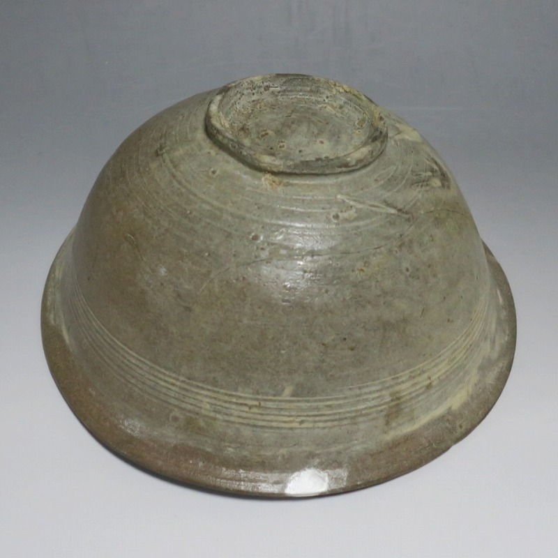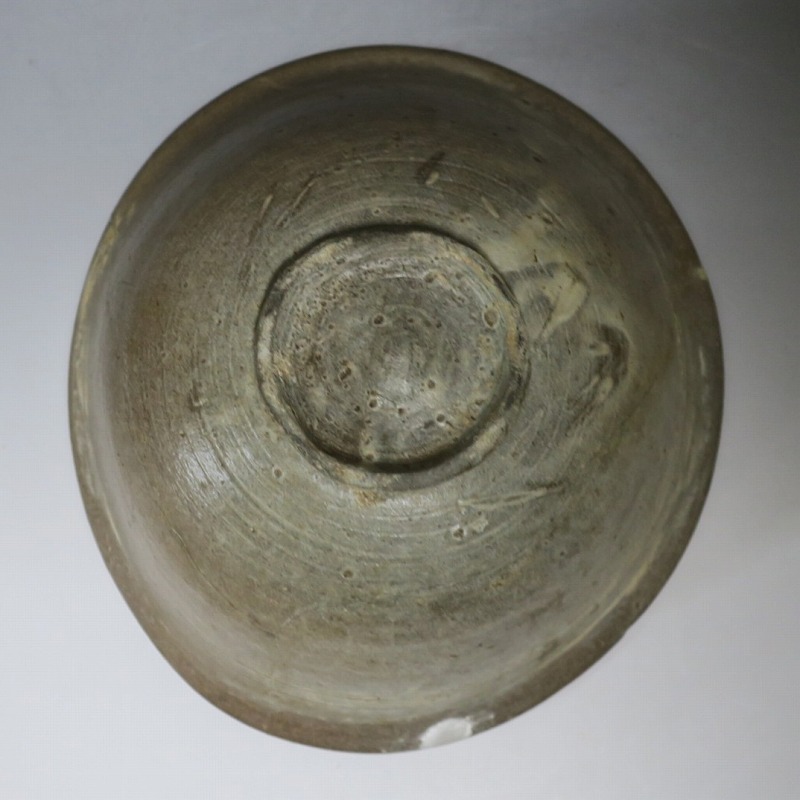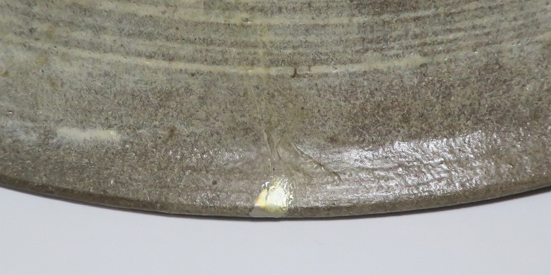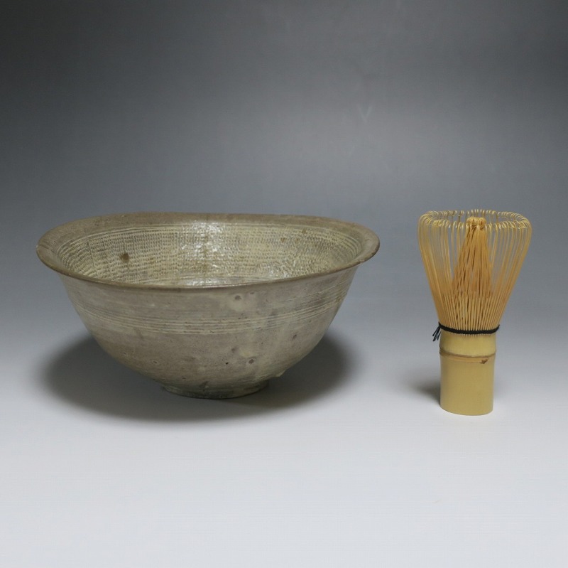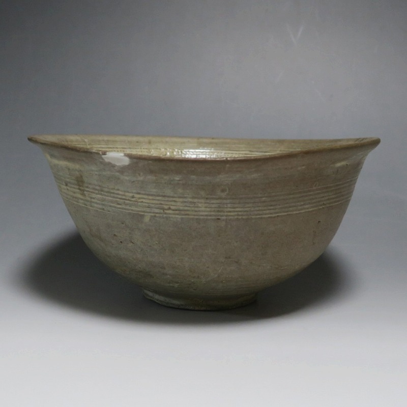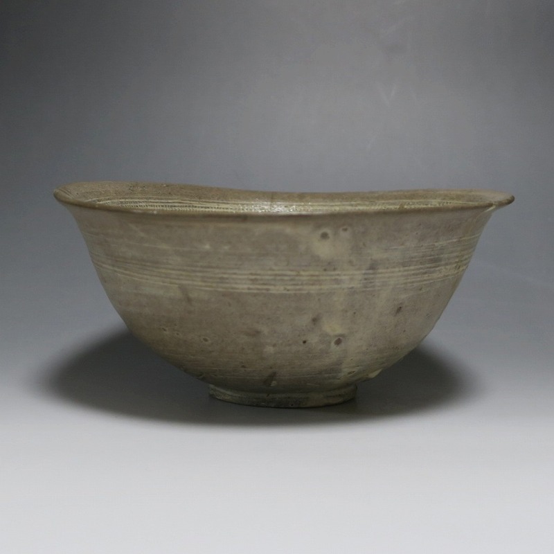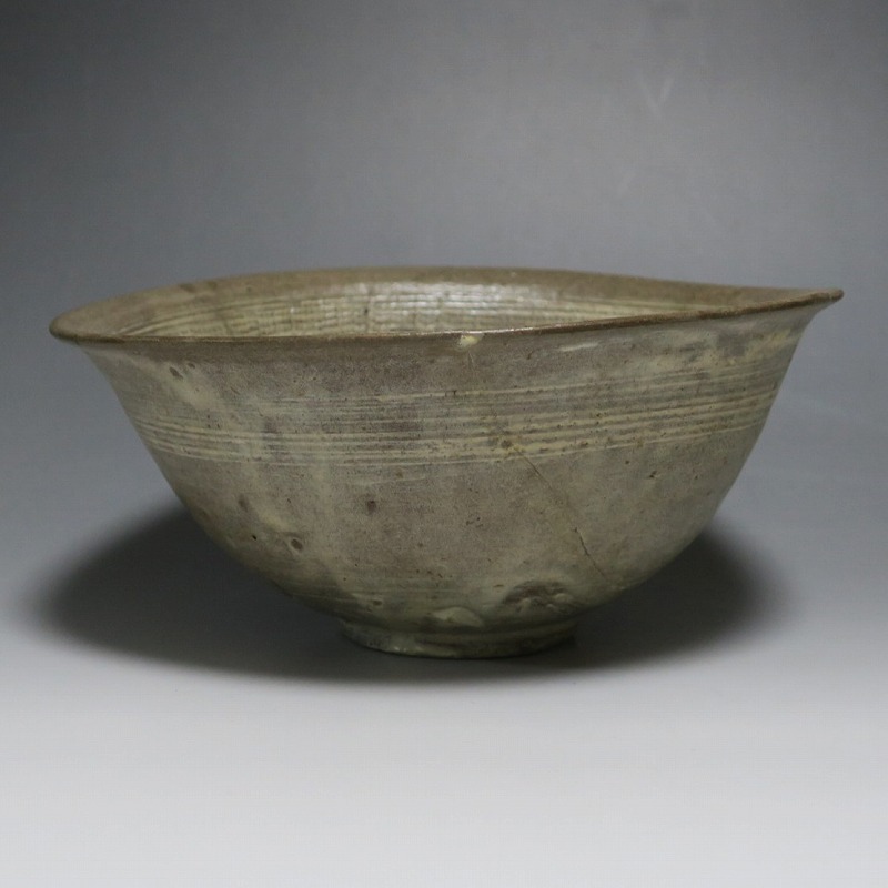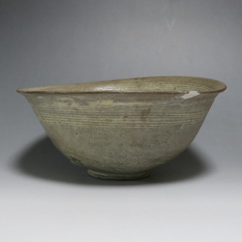 (李朝時代前期 15世紀) 商品番号 3780 口径 約21cm〜19.5cm/高さ 約9.5cm/高台径 約6.5cm 大きく3つに割れ、全体的に修理が施されています。状態は写真でご確認ください。 高麗から李朝に政権が交代した14世紀、粉青沙器と呼ばれる新しい様式の焼物が出現します。灰釉、刷毛目、井戸などの多様な粉青沙器は独特の味わいがあるので古美術品として人気があります。本品は白象嵌で輪線花文を施した鉢。ゆがんだ造形、直しが景色となっている迫力のある作品です。食器というよりもオブジェ、花器として使用すると面白いでしょう。 | ||