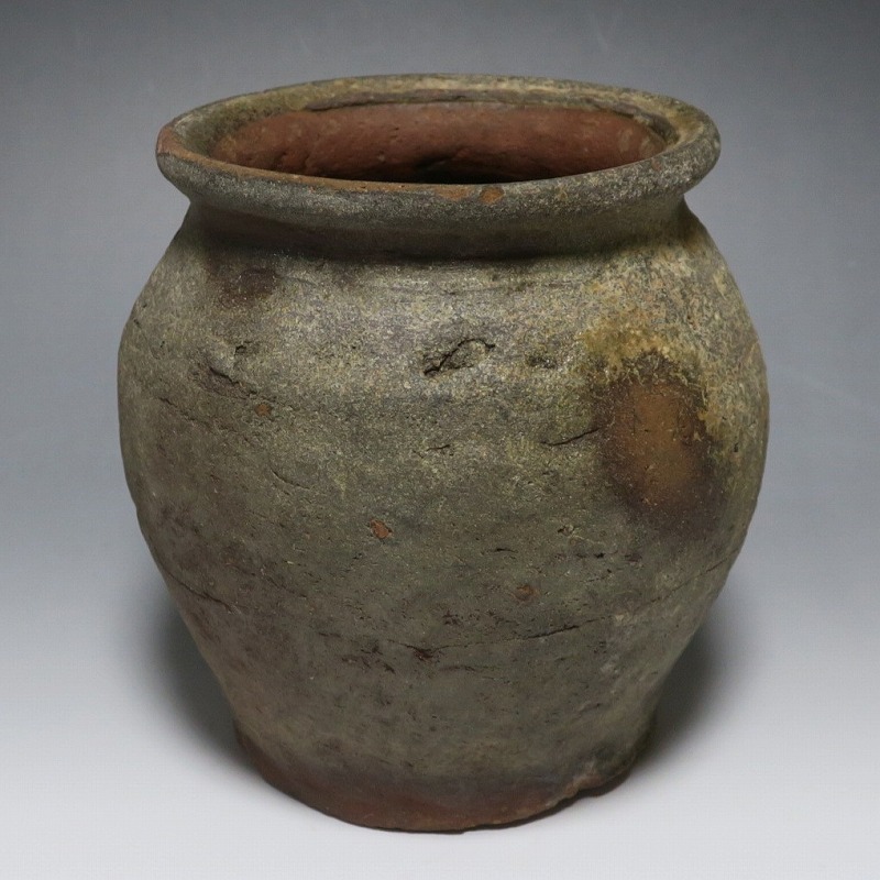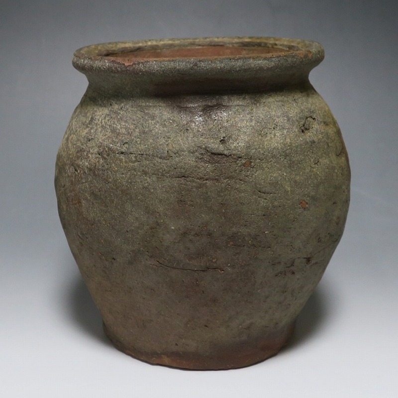 高さ 約19cm/胴径 約19cm 胴部から底部にかけてニュウがあり、水が漏れます。花器として使用する際は落としをご利用ください。内側に水漏れ防止の漆が塗られた跡があり、底部が若干ぐらつきます。状態は写真でご確認ください。 常滑焼は、愛知県常滑市周辺で平安時代末期から活動している六古窯の一つです。中世から近世にかけて壺や甕などの作品を生産、日本各地で使用されました。本品は江戸時代中期に作られた壺。種壺などに使用されていたものです。胴部のぼたもち模様が本作の個性となっています。落としをして花器としても使用できる侘びた作品です。 | ||