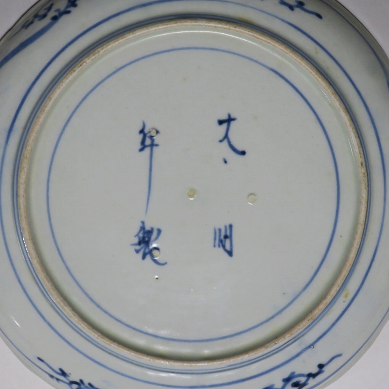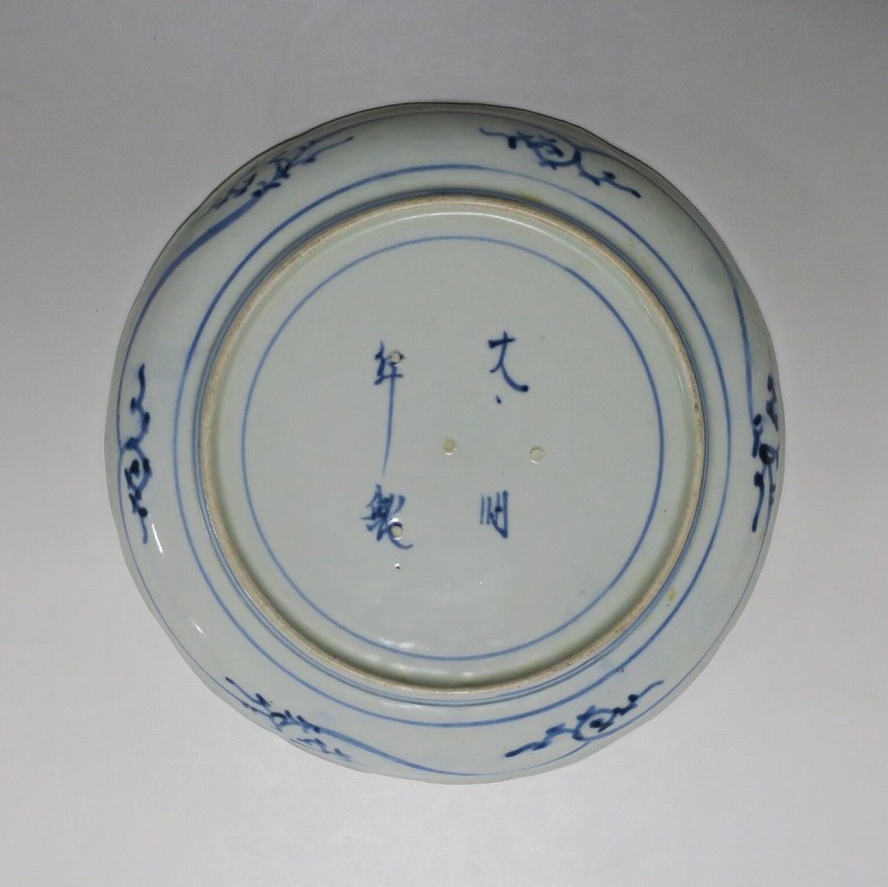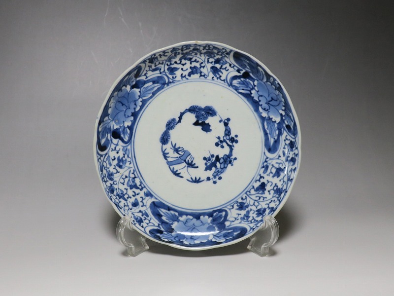 (江戸時代中期 宝暦 18世紀中頃) 商品番号 3821 口径 約19cm/高さ 約2.3cm/高台径 約13cm 窯傷はありますが、完品です。状態は写真でご確認ください。 江戸時代中期になると伊万里焼の作品は北前船に乗せられ、各地の町に運ばれるようになります。磁器交易の商人たちは見本帳を持って各地の商家や豪農を訪ね、注文を受けた有田の職人たちはそれに沿って作品を製作しました。本品は染付の牡丹唐草草六寸皿。江戸時代の人たちは耐水性の強いこのような食器に野菜や魚介など懐石料理を盛っていました。当時の高級品です。普段使いの食器としてお楽しみください。 | ||