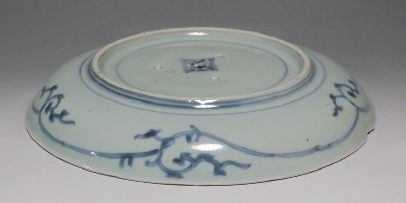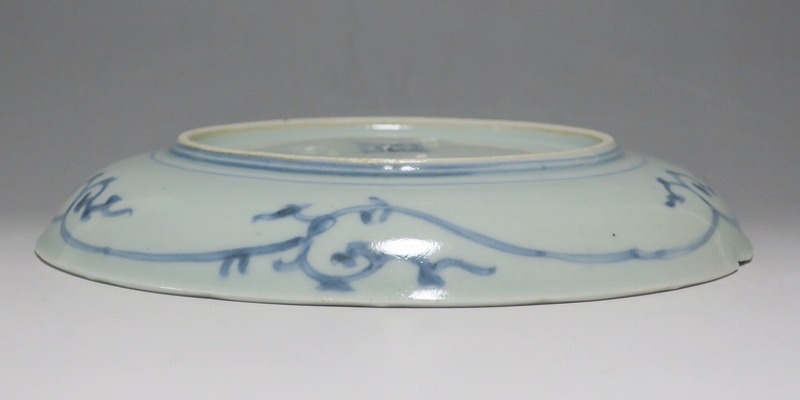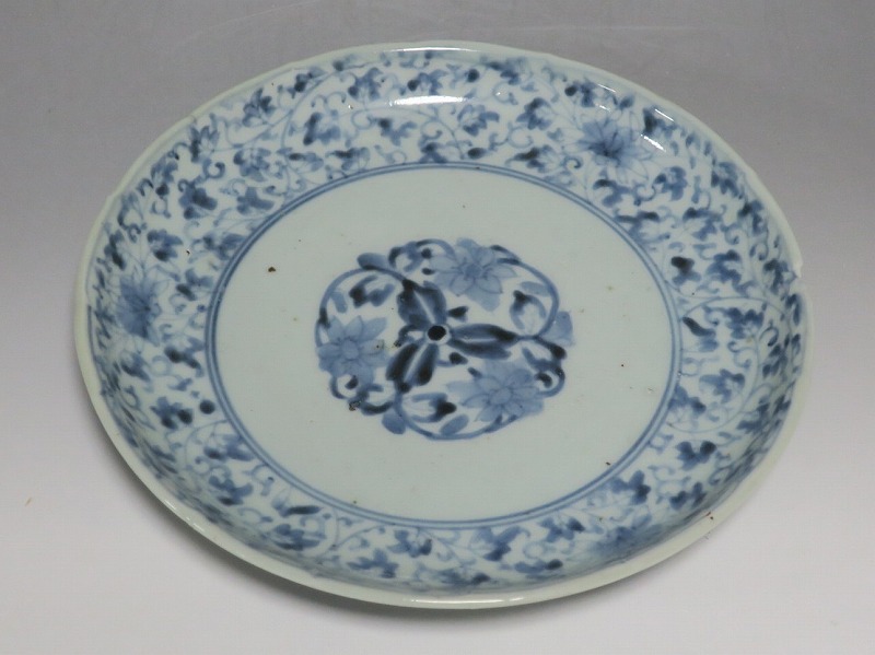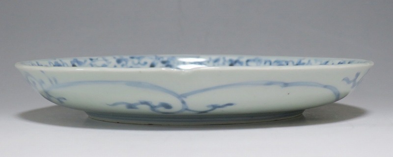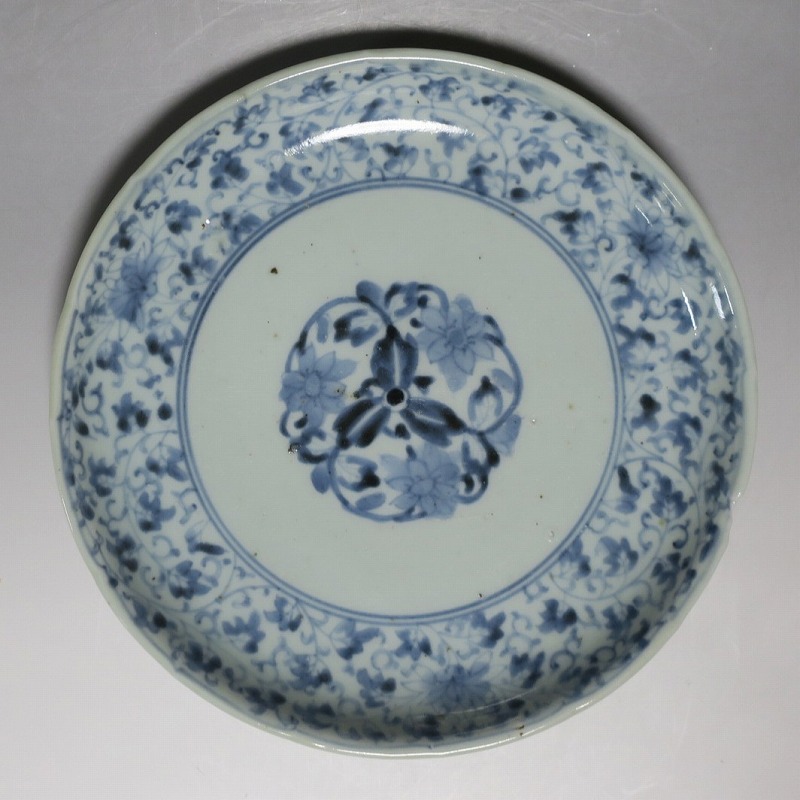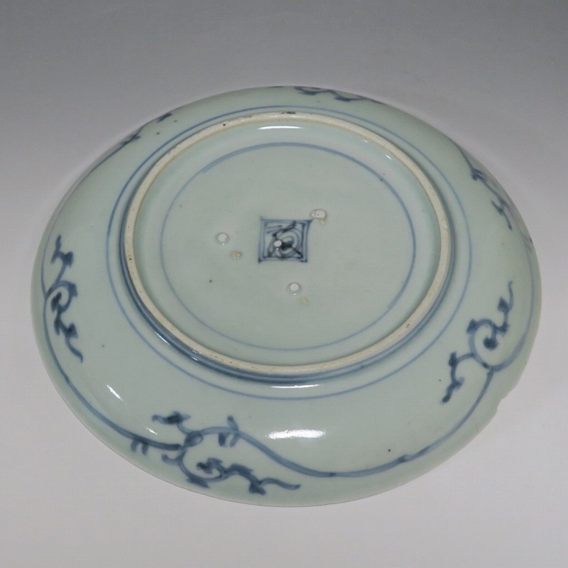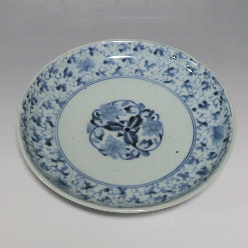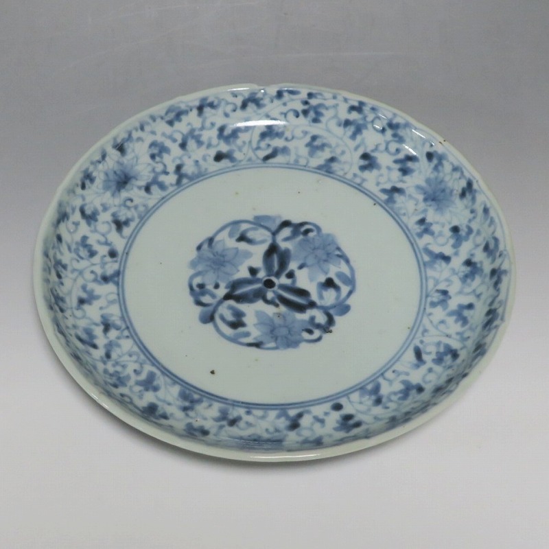 (江戸時代中期 18世紀中頃) 商品番号 3831 口径 約20.3cm/高さ 約3.3cm/高台径 約12.5cm 口辺の一部に窯キズがありますが、釉薬が掛かっています。状態は写真でご確認ください。 18世紀前半、徳川吉宗が享保の改革を行うと北前船などの活用によって商品流通が活発になります。また醤油の発明、漁労の発展が日本人の食生活を一変させ、それに合わせた新しい様式の食器も開発されるようになりました。本品は宝暦(1751〜1764年)様式の染付の唐草七寸皿。元々、唐草文は西アジアのデザインですが、花唐草文は江戸時代に日本で独自に発展した模様です。当時、たこ唐草は魚介類を、花唐草には野菜料理などを盛ったと考えられます。素朴な感じがする七寸皿。気軽に使えるカジュアルな器です。 | ||