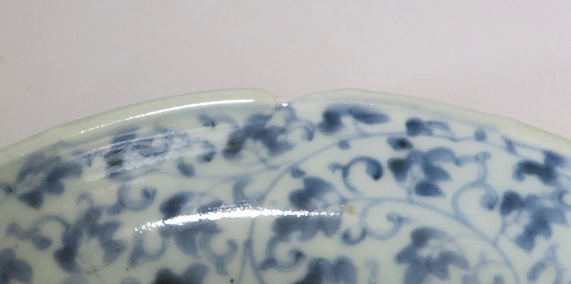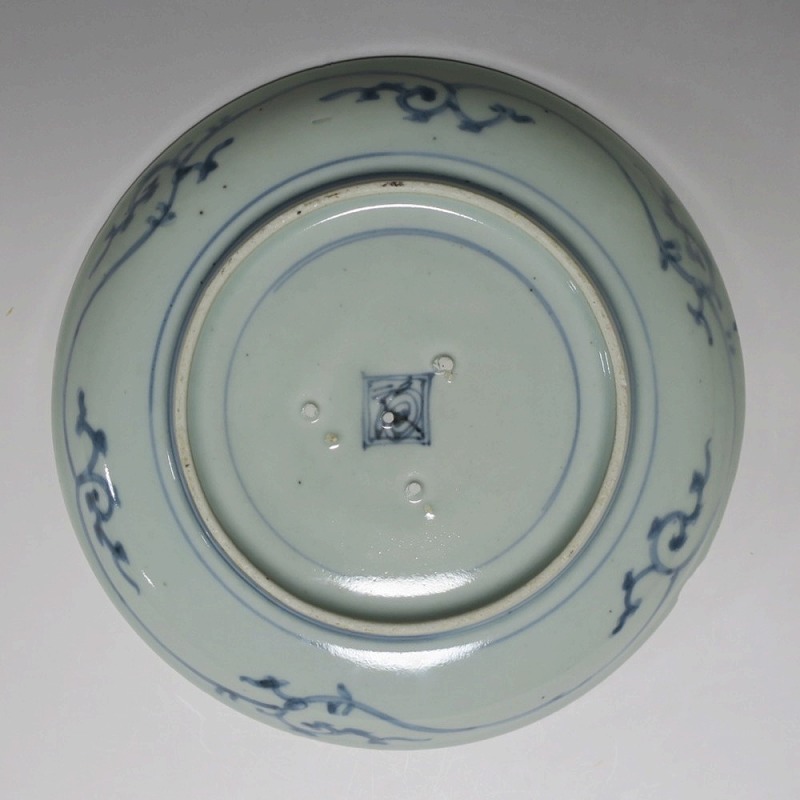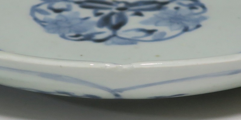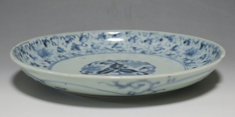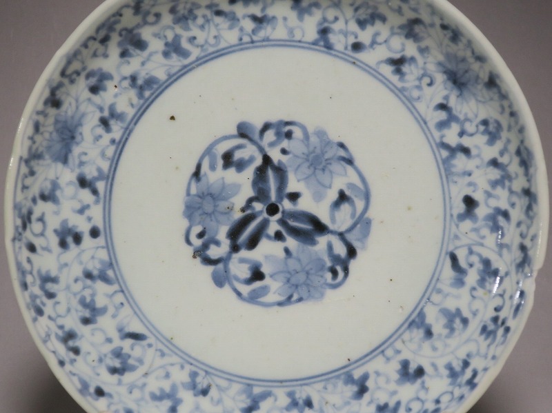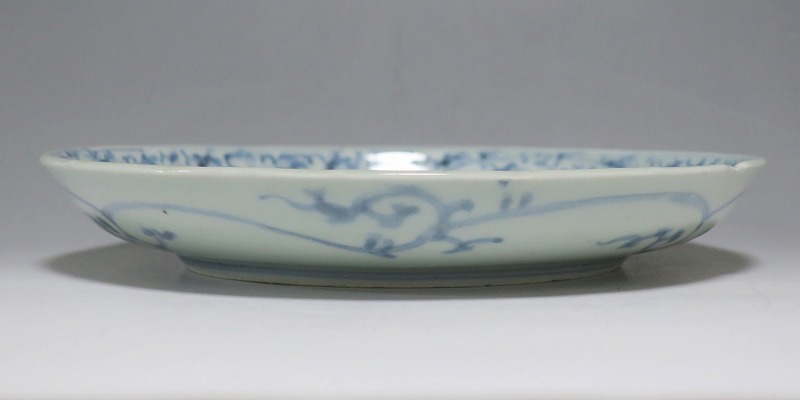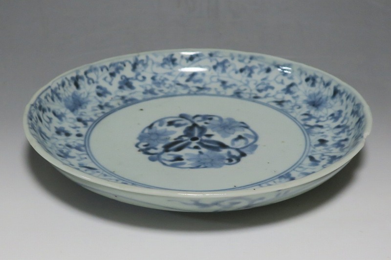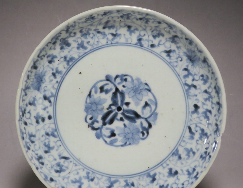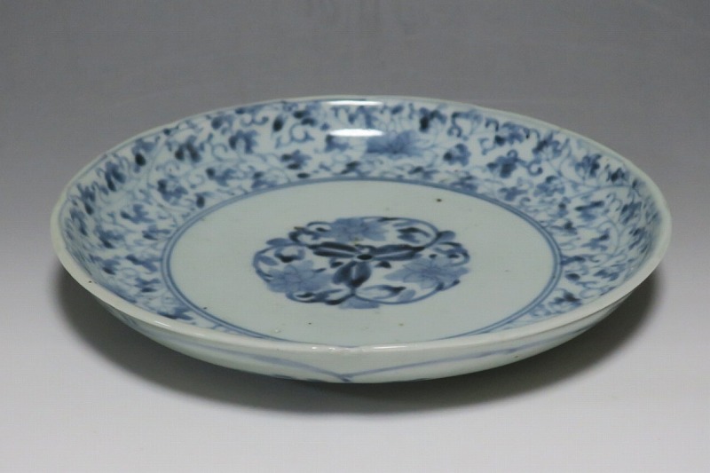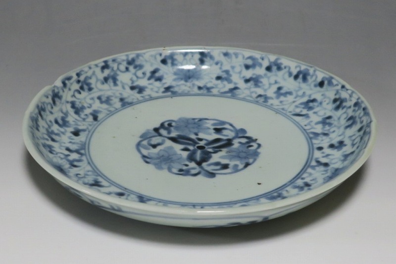 (江戸時代中期 18世紀中頃) 商品番号 3831 口径 約20.3cm/高さ 約3.3cm/高台径 約12.5cm 口辺の一部に窯キズがありますが、釉薬が掛かっています。状態は写真でご確認ください。 18世紀前半、徳川吉宗が享保の改革を行うと北前船などの活用によって商品流通が活発になります。また醤油の発明、漁労の発展が日本人の食生活を一変させ、それに合わせた新しい様式の食器も開発されるようになりました。本品は宝暦(1751〜1764年)様式の染付の唐草七寸皿。元々、唐草文は西アジアのデザインですが、花唐草文は江戸時代に日本で独自に発展した模様です。当時、たこ唐草は魚介類を、花唐草には野菜料理などを盛ったと考えられます。素朴な感じがする七寸皿。気軽に使えるカジュアルな器です。 | ||