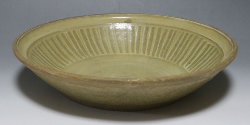 (タイ 15世紀) 商品番号 3921 口径 約28.5cm/高さ 約6cm/高台径 約17cm 窯傷がありますが、総じて良い状態です。状態は写真でご確認ください。 パーン窯は15世紀前後、北部タイで活動した窯です。当時、タイにはスンコロク窯、スコータイ窯など多くの良質な陶磁器を製作する窯がありますが、パーン窯は独特の青磁作品を製作しました。本品は淡いライトグリーン色の釉薬が掛かったしのぎ文のある尺皿。シンプルなデザインのモダンな感じがする作品です。古格、落ち着いた雰囲気があります。エスニック料理の食器としてお楽しみください。 | ||