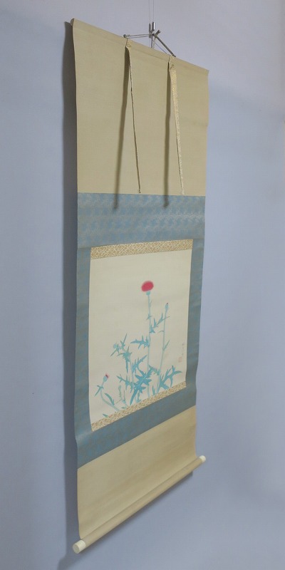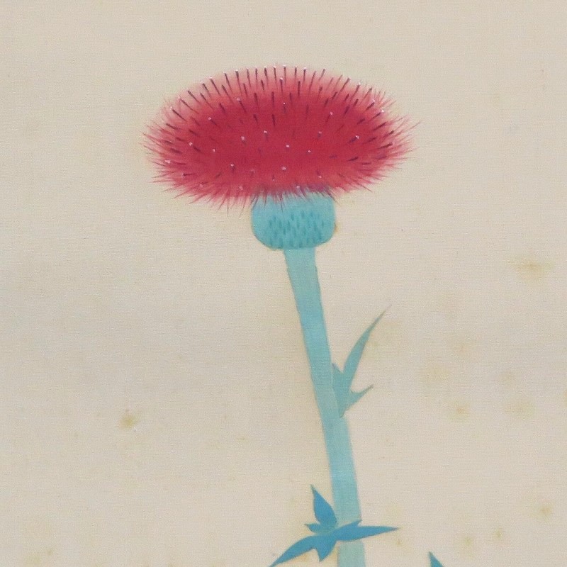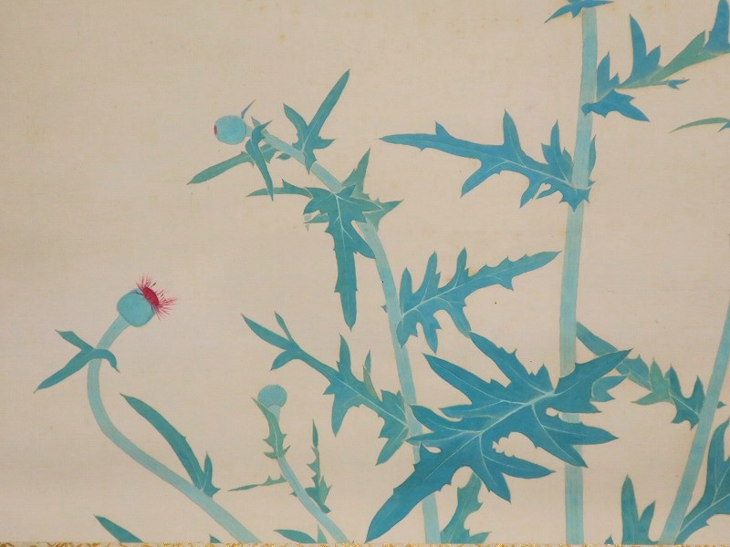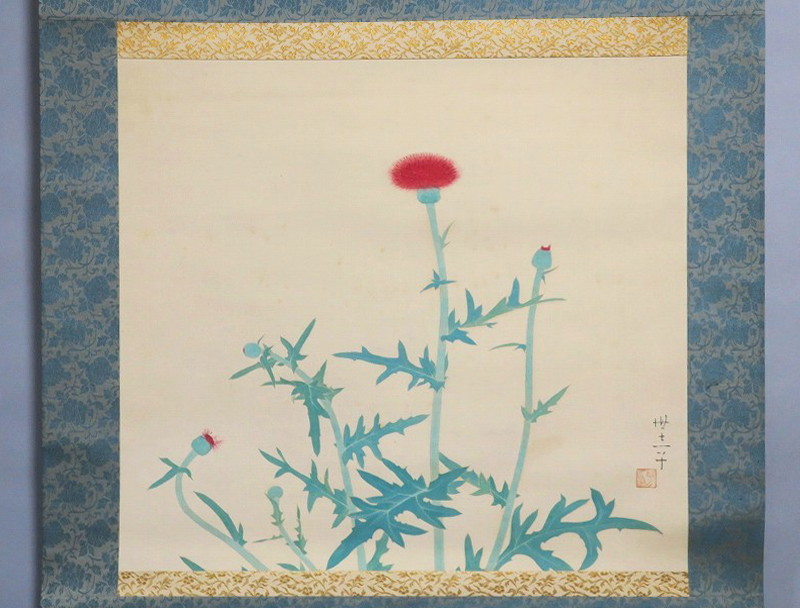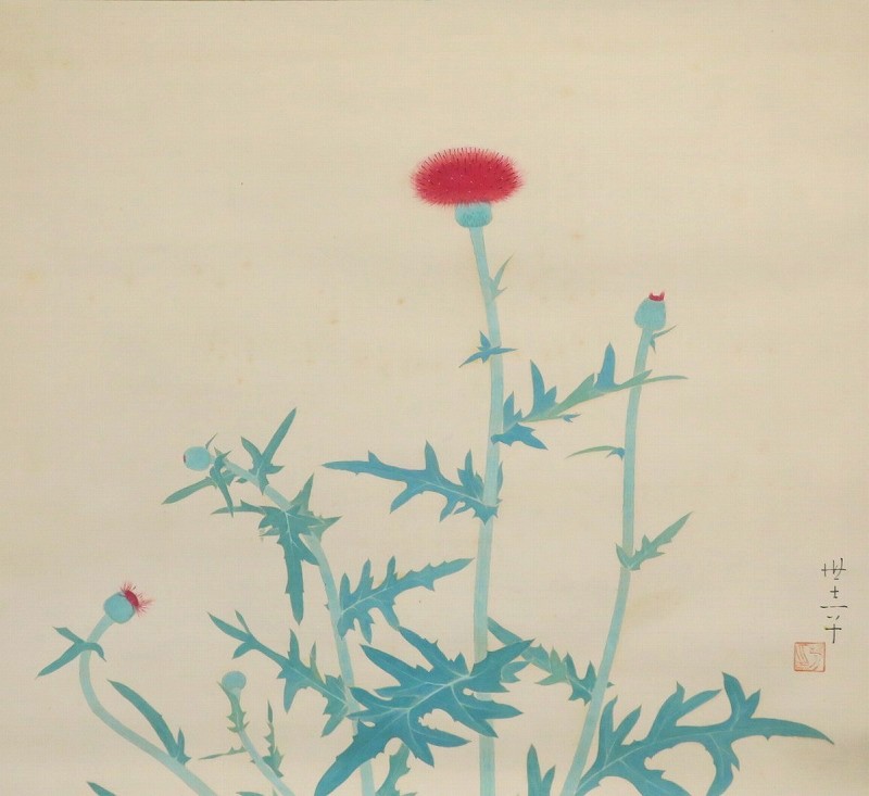中村世志子(1912-1977)は昭和時代に活躍した中堅日本画家です。中村貞以に師事、日本美術院院友として活動しました。本作は花アザミを描いた軸。花アザミと余白の関係が生かされた軸です。優しい女流画家の繊細な感性が表現されています。花アザミの季節に床の間に掛けてお楽しみください。