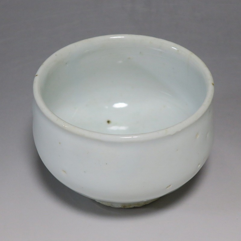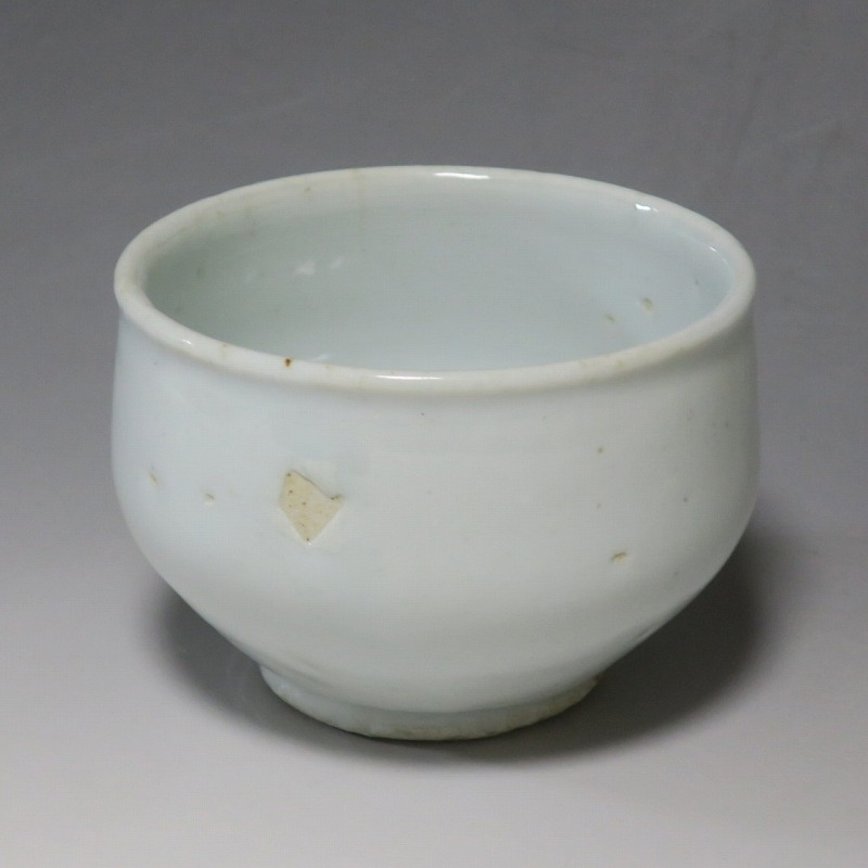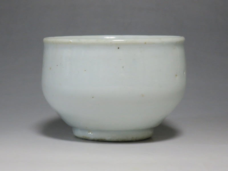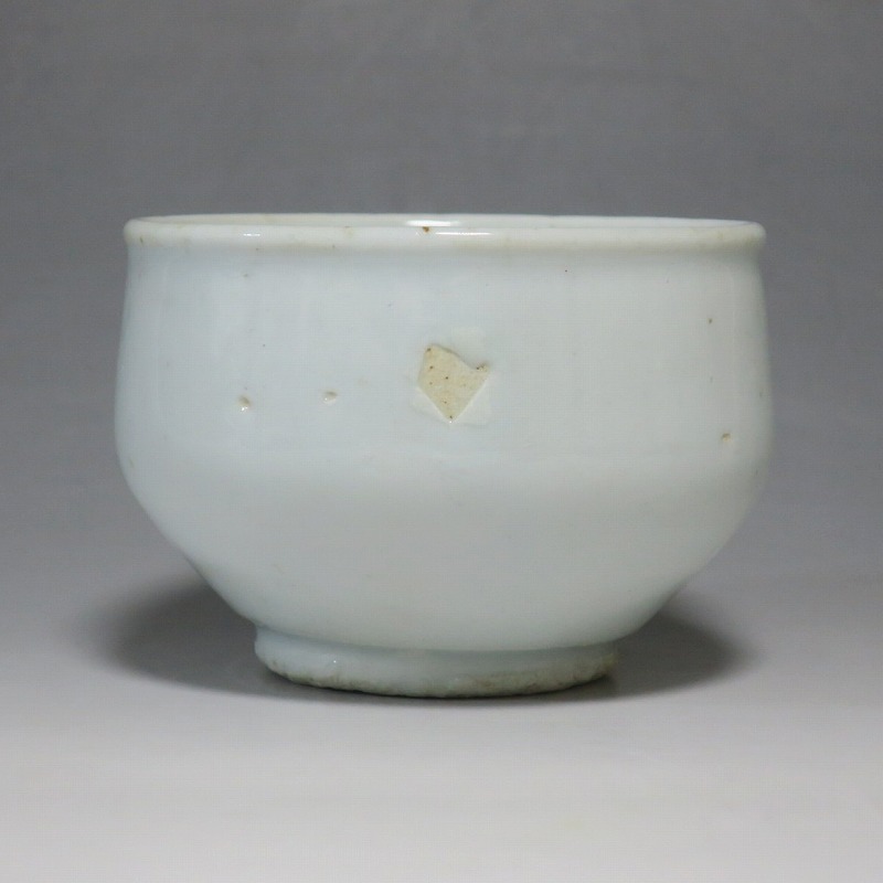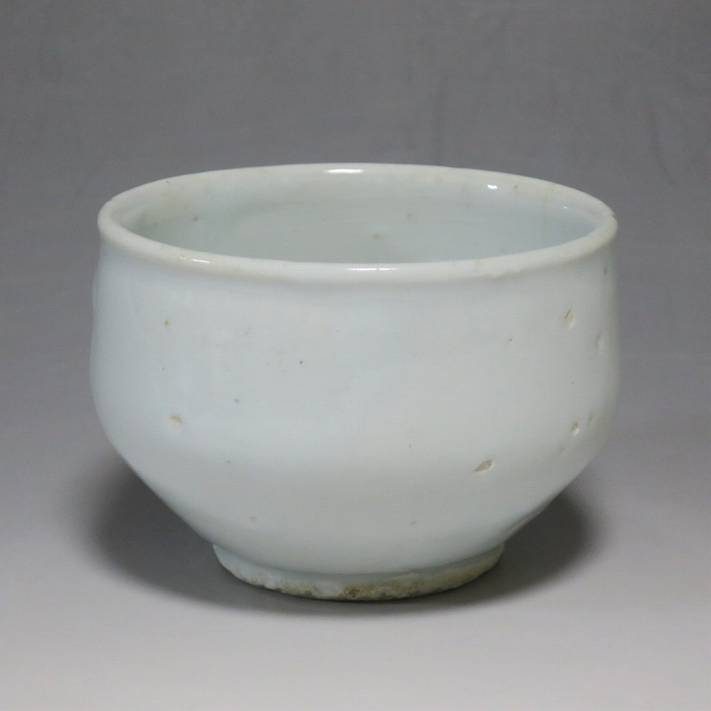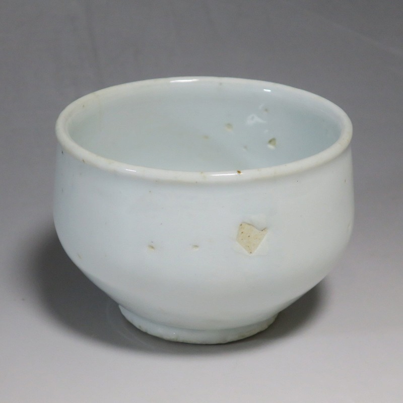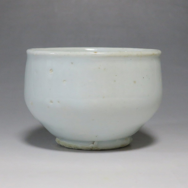 (李朝時代後期 19世紀中頃) 商品番号 3973 口径 約9.5cm/高さ 約6.8cm/高台径 約5.5cm 口辺に約3cmのニュウが1本、窯傷や釉ハゲがあります。状態は写真でご確認ください。 14世紀末、李氏朝鮮が成立すると国の色を明に倣って白としました。その頃から李朝では白磁が多数生産されるようになります。本品は19世紀中頃に作られた白磁の小服茶碗。白色が美しい作品です。製作当時は、汁を入れる食器などに使われていたのでしょう。抹茶碗の他、料理を盛る器としても楽しめそうです。 | ||