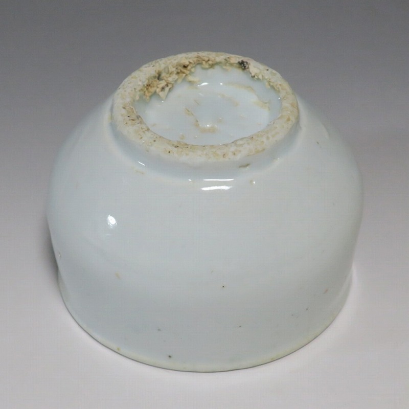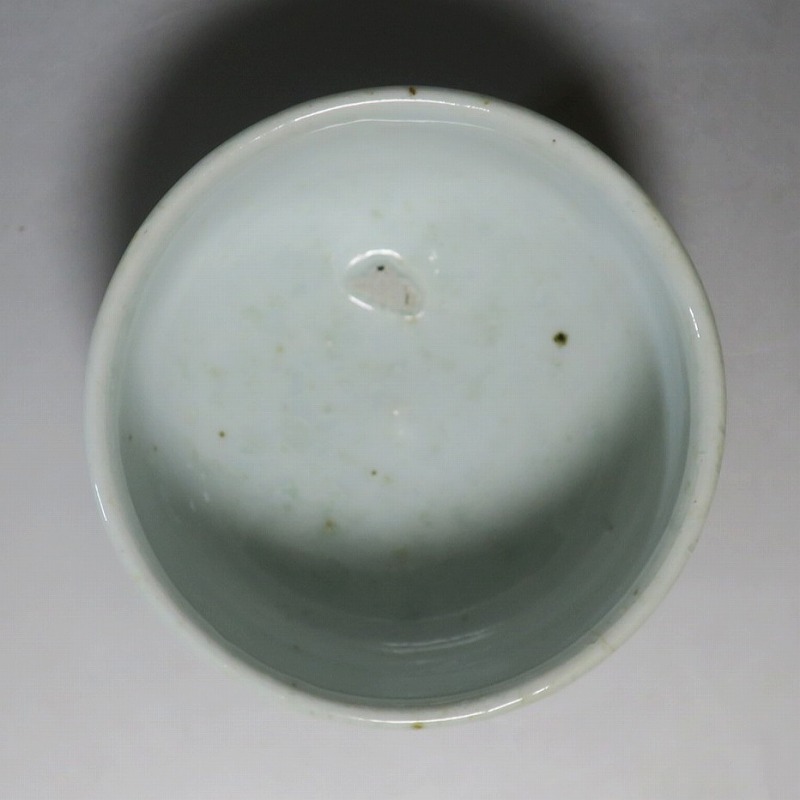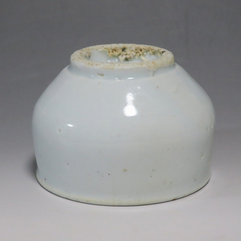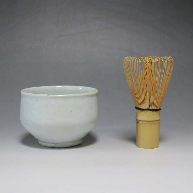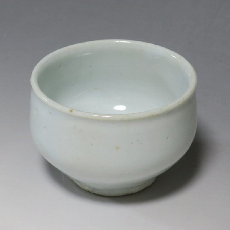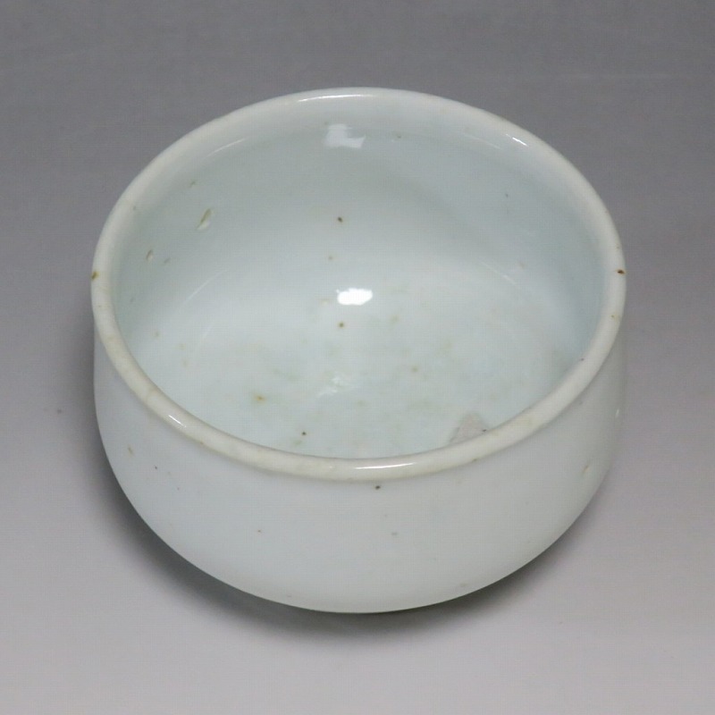 (李朝時代後期 19世紀中頃) 商品番号 3973 口径 約9.5cm/高さ 約6.8cm/高台径 約5.5cm 口辺に約3cmのニュウが1本、窯傷や釉ハゲがあります。状態は写真でご確認ください。 14世紀末、李氏朝鮮が成立すると国の色を明に倣って白としました。その頃から李朝では白磁が多数生産されるようになります。本品は19世紀中頃に作られた白磁の小服茶碗。白色が美しい作品です。製作当時は、汁を入れる食器などに使われていたのでしょう。抹茶碗の他、料理を盛る器としても楽しめそうです。 | ||