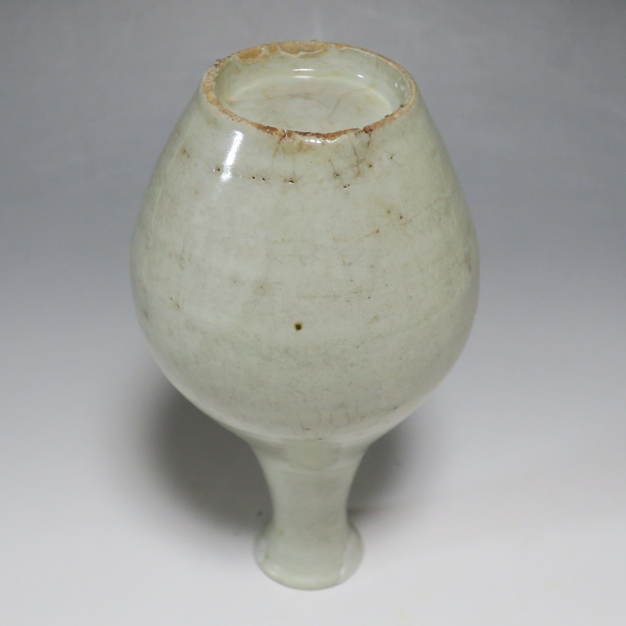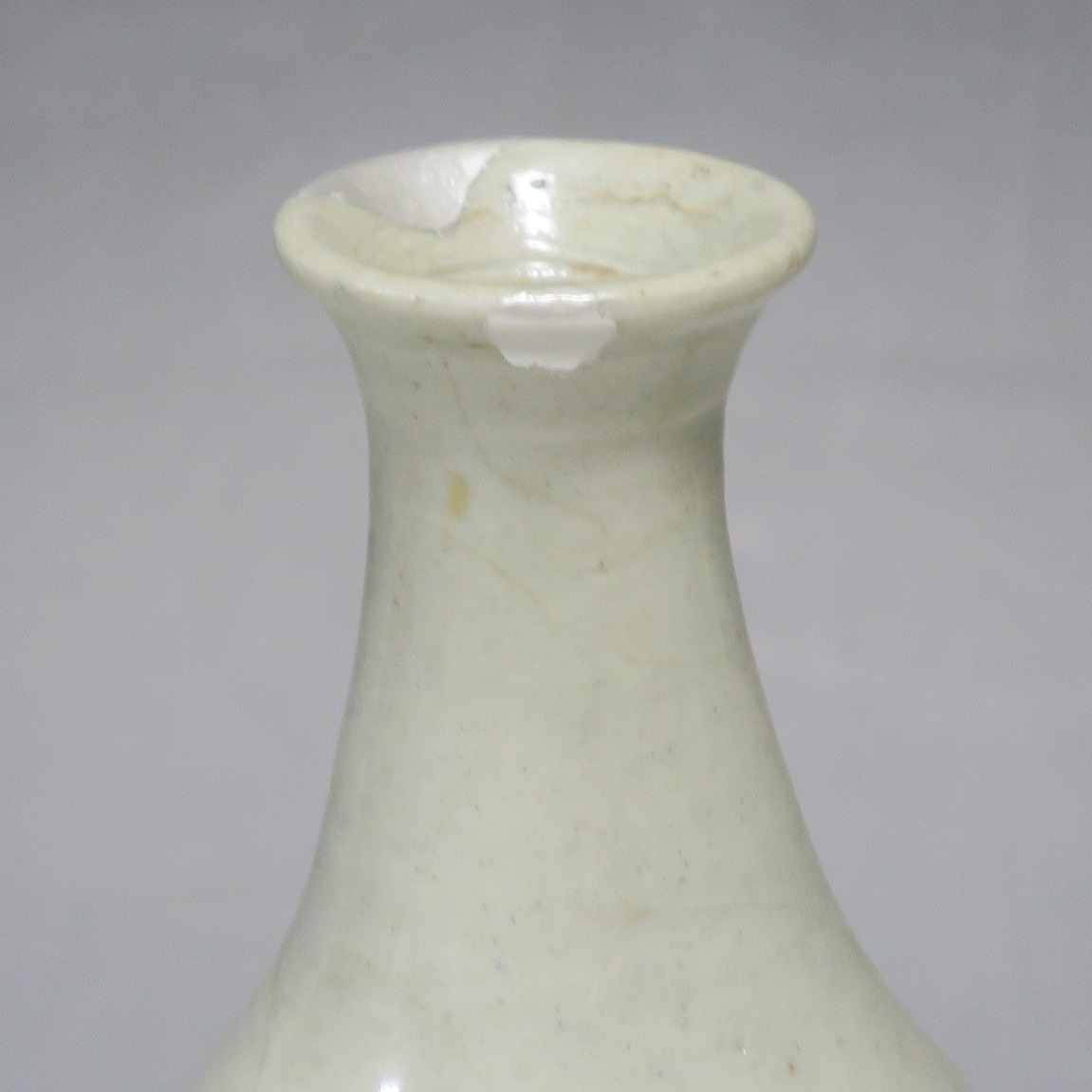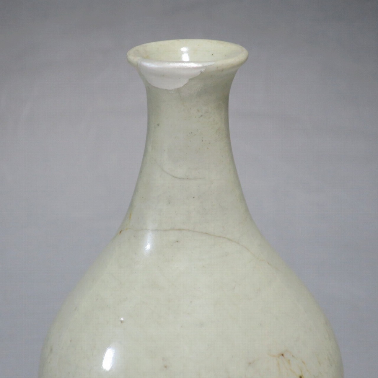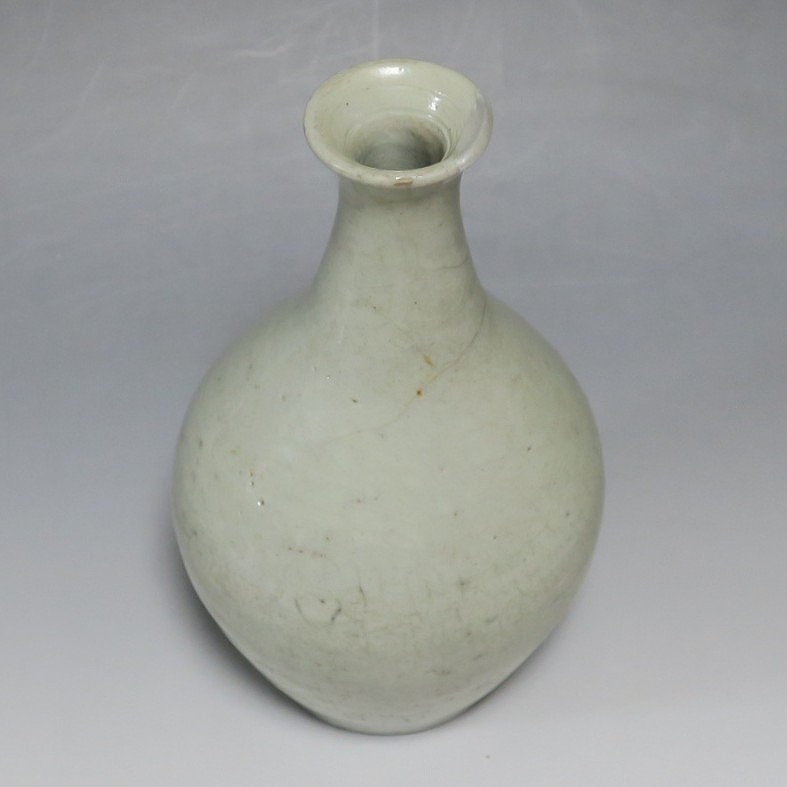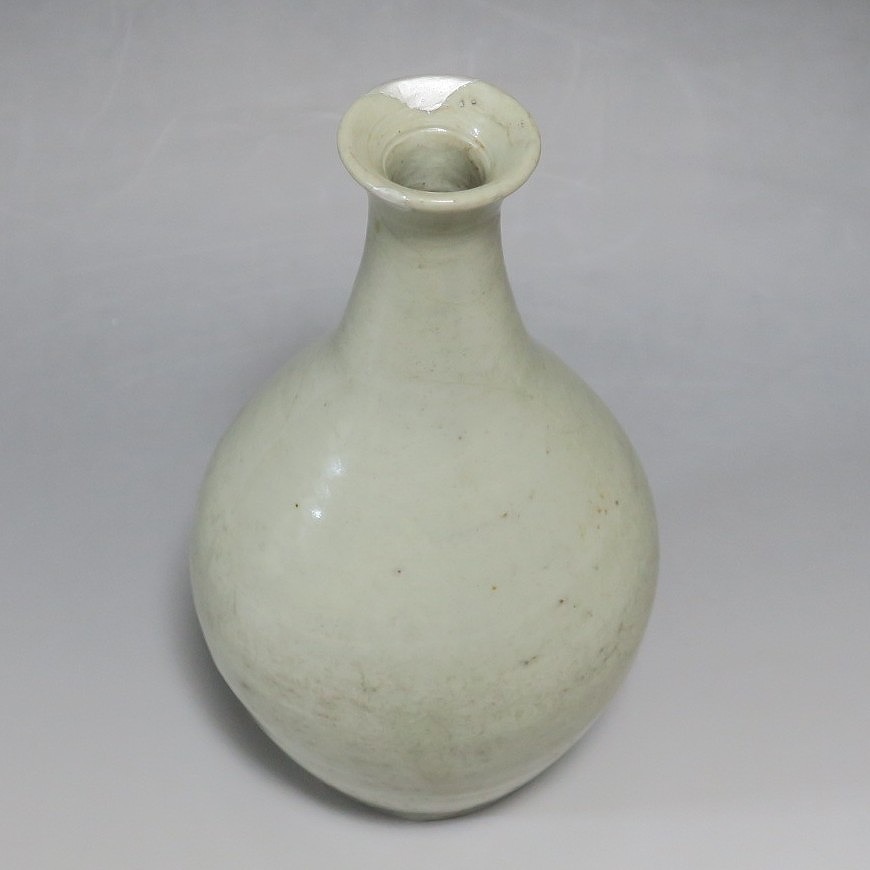 高さ 約17.4cm/胴径 約10cm 経年の汚れがつき、口辺に約1cmと8mmの銀直し、高台に窯傷、所々カンニュウがあります。状態は写真でご確認ください。 砥部焼は、1750年頃に愛媛県伊予郡砥部町に開かれた窯です。18世紀後半に磁器焼成に成功、1818年に良質の陶石(川登石)を発見した後、作品の質が向上し、有田と並ぶ一大磁器生産地となりました。本品は18世紀後半に北川毛窯で製作された白磁の徳利。高台を見ると鉄分の多い赤土が使われているので本品が北川毛窯産であることがわかります。お預け徳利サイズの清楚な作品。酒器の他、インテリア、花器としてお楽しみください。 | ||