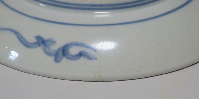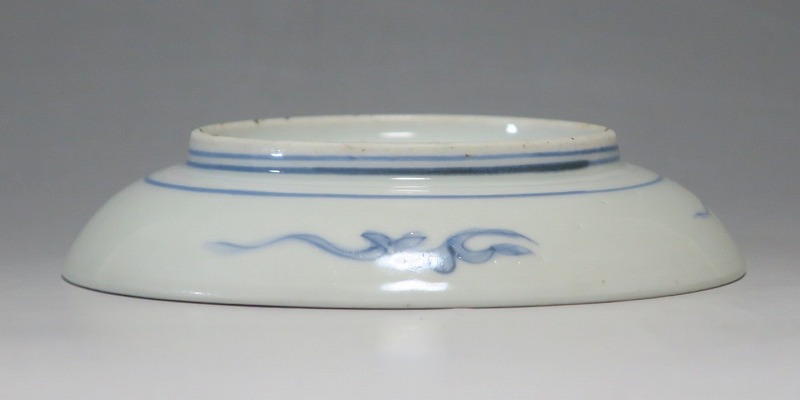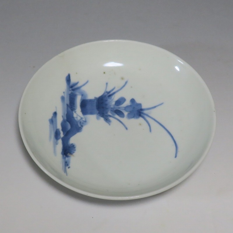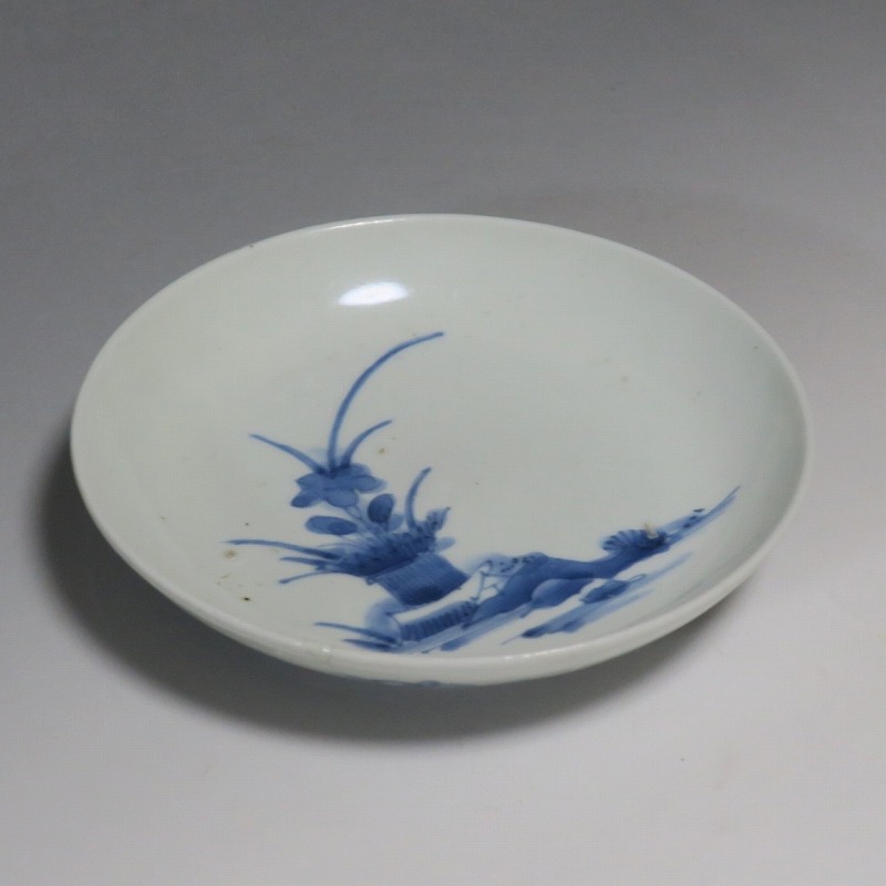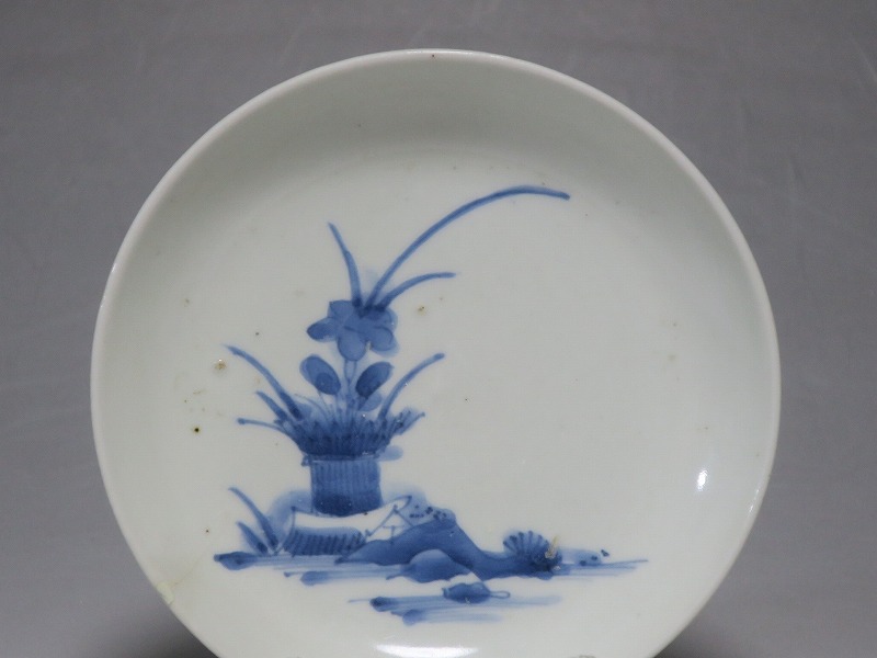 (江戸時代前期 17世紀後半) 商品番号 3991 口径 約12.5cm/高さ 約2.5cm/高台径 約7.5cm 口辺から約3cmのニュウ、4mmの直し、若干のフリモノや使用による擦り傷があります。状態は写真でご確認ください。 藍九谷焼は、初期伊万里時代を経た1650年代に有田周辺で製作された伊万里焼の総称です。初期伊万里は中国磁器の写しですが、藍九谷時代には和風柄が主流となりました。本品は柿右衛門窯で製作された藍九谷の植物文の小皿。余白を活かした洒落た作品です。直しがありますが食器として使用できます。料理を盛ると映えそうな可愛い小皿。インテリア、食器としてお楽しみください。 | ||