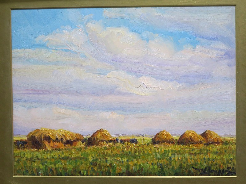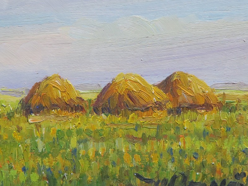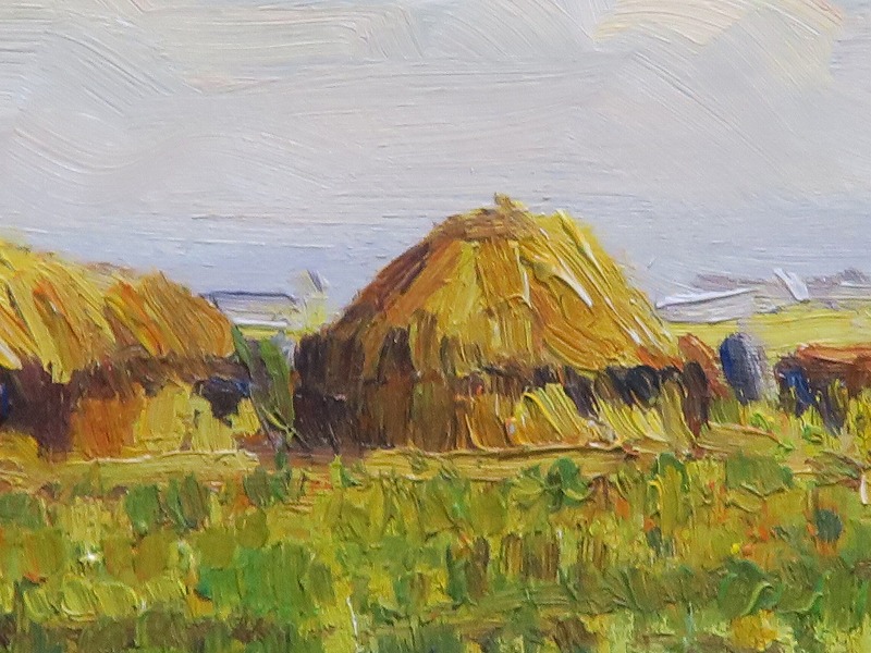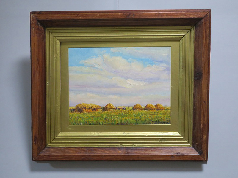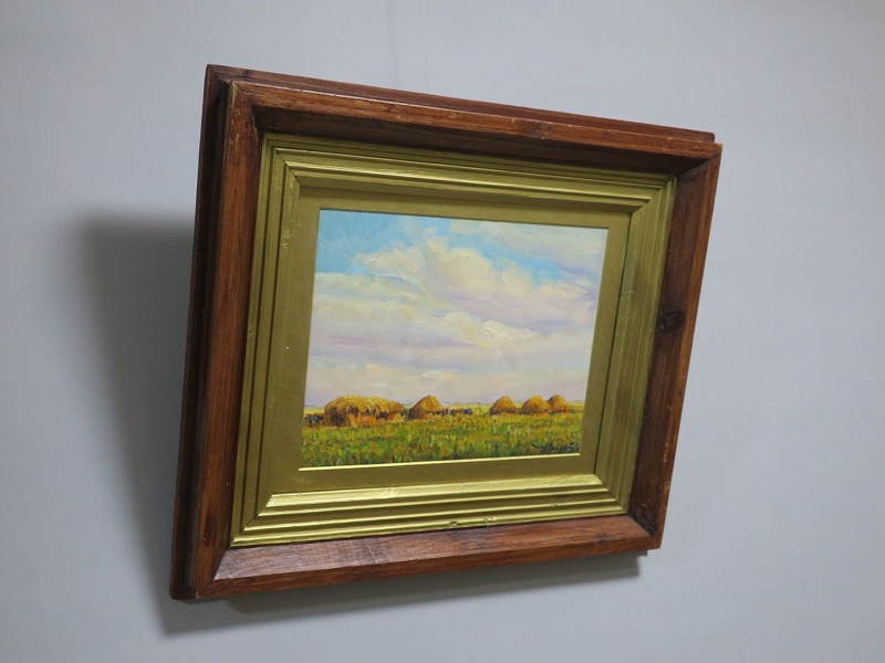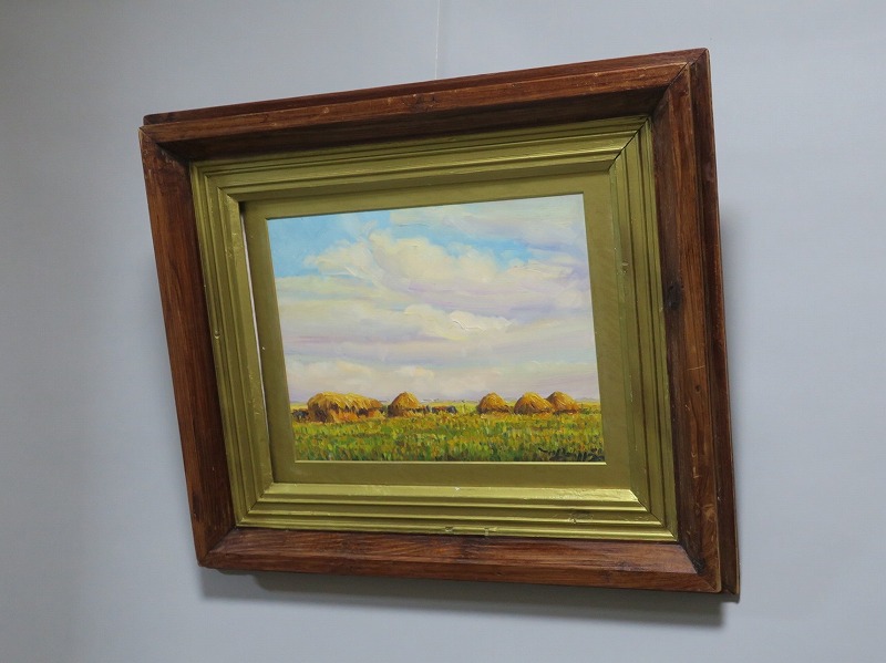 在銘ですが作者については不詳です。わらが積んである風景からフランスの田園地帯を描いた作品であると想像できます。印象派に影響を受けた作家が描いた油絵でしょう。秋を感じさせてくれる風景。インテリアとしてお楽しみください。