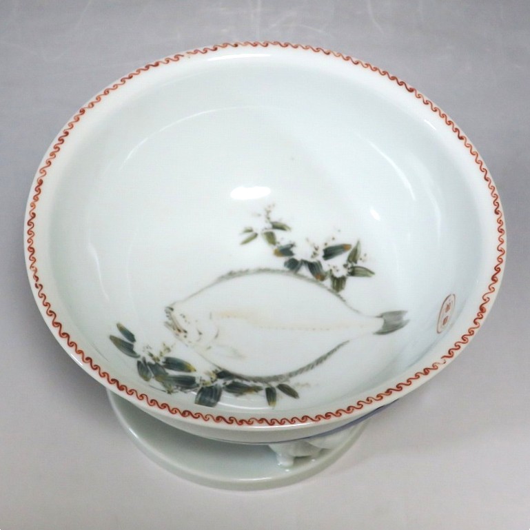 渋草焼 色絵 ヒラメ文 唐子三脚 杯洗