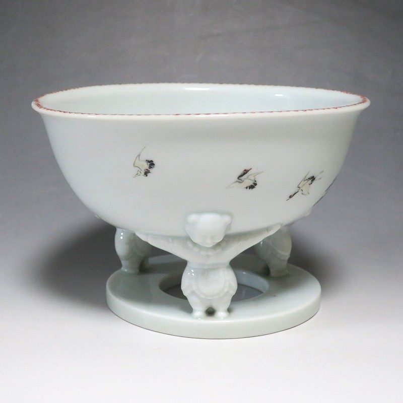 (明治時代 19世紀中頃) 商品番号 4058 高さ 約12cm/口径 約18.4cm/高台径 約12.5cm 使用による若干の擦り傷がありますが、完品です。状態は写真でご確認ください。 渋草焼は天保12年(1841年)、地域の磁器需要を満たすために岐阜県高山市に開かれた窯です。渋草陶石を使い、瀬戸や九谷から陶工を招いて良質な作品を生産しました。 本品は明治時代に作られた色絵の杯洗。見込みにヒラメ、側面には富士山の絵が描かれ、三脚が唐子の造形をした可愛らしい作品です。他の窯にはない独特の個性、伊万里焼とは雰囲気の異なる国焼磁器の魅力があります。食器や資料としてお楽しみください。 | ||