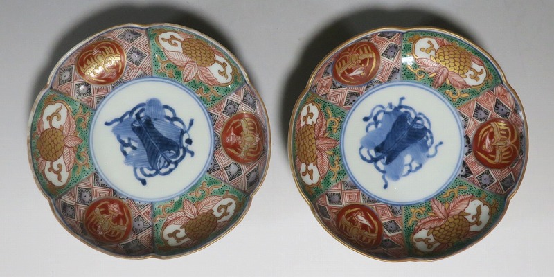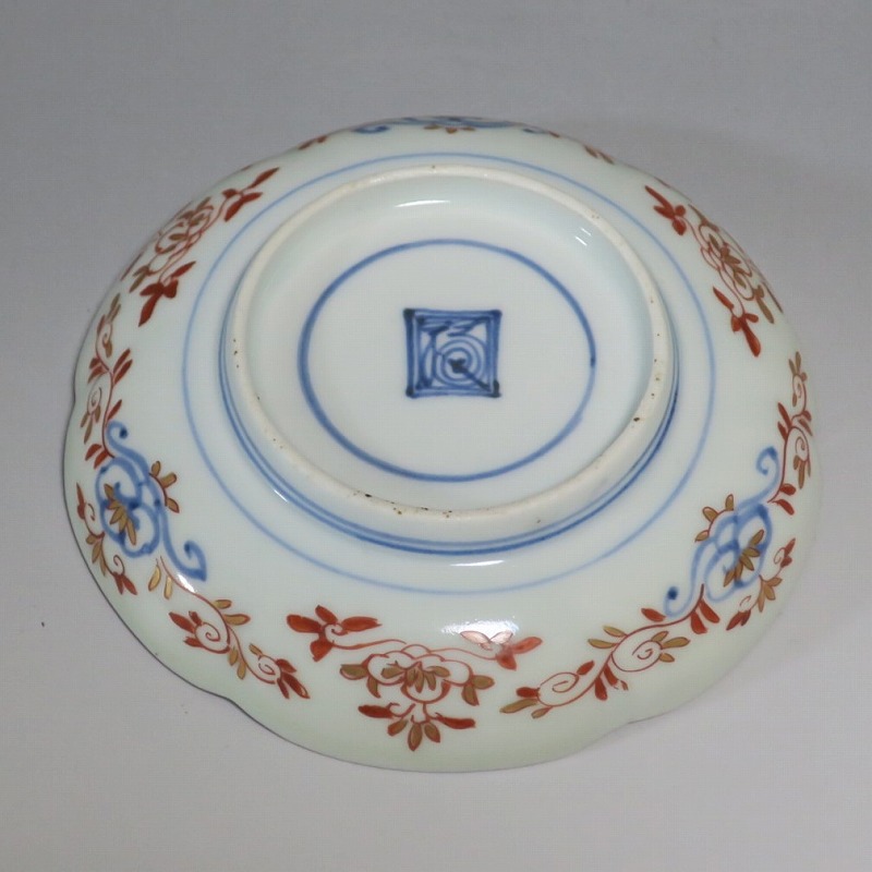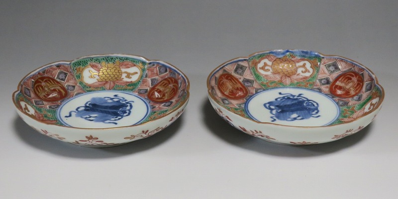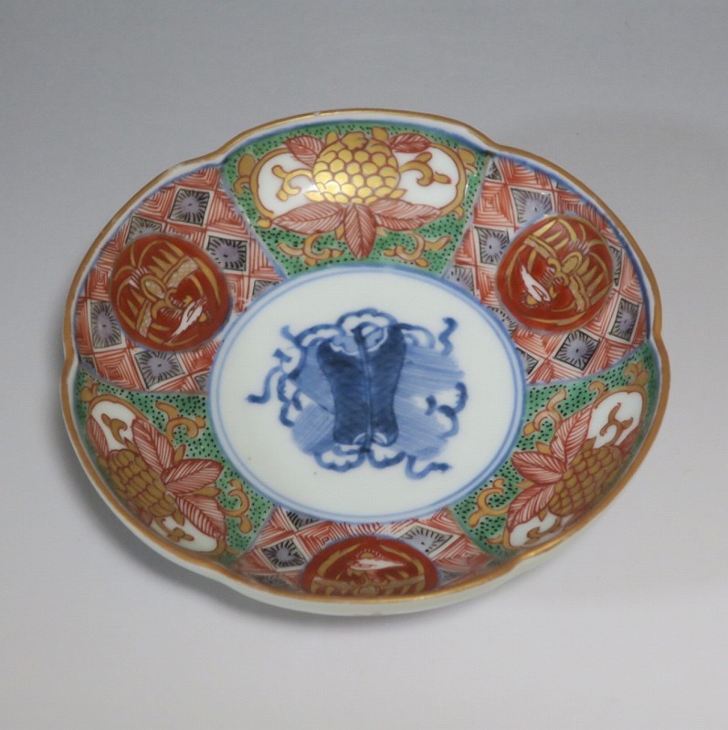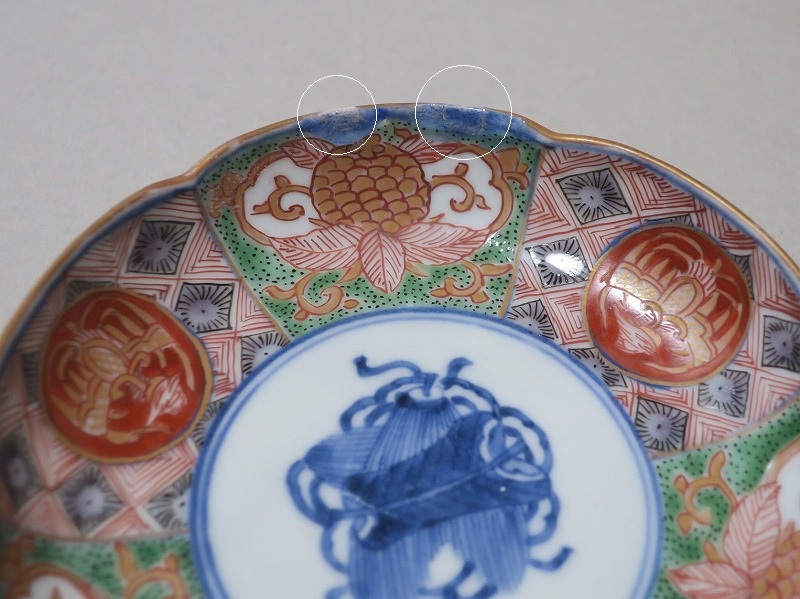 (明治時代初期 19世紀後半) 商品番号 4093 口径 約12cm/高さ 約2.8cm/高台径 約6.7cm 1枚の口辺に約1.5cmの直しが2カ所とそこから約5cmのニュウが1本あります。状態は写真でご確認ください。 大聖寺焼は慶応三年(1867年)、加賀前田藩の支藩・大聖寺藩が産業振興策として開かせた窯です。明治時代初期から大正末期にかけて上質な色絵伊万里写しを量産し、ヨーロッパに輸出され人気を博しました。本品は色絵金彩で鳳凰、亀甲とザクロを組み合わせてデザインした色絵金彩の四寸皿。外貨を稼ぐための輸出品として製作されたので、裏まで手の込んだ絵付けが施され良質な作品に仕上がっています。絢爛な感じがするので、クリスマス、お正月用の食器にぴったり。本作を使って年末年始の食事をお楽しみください。 | ||