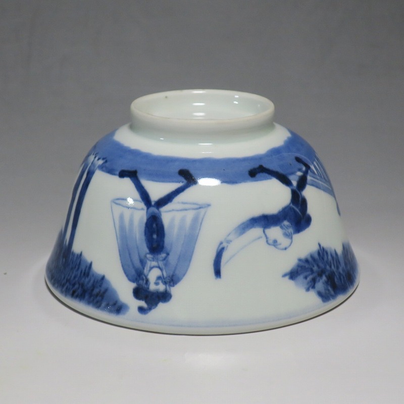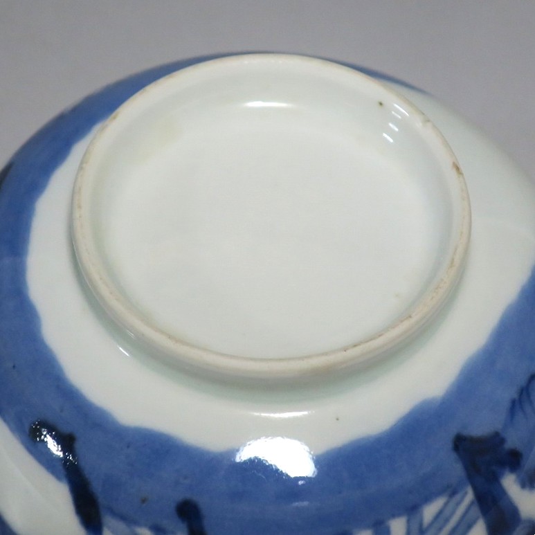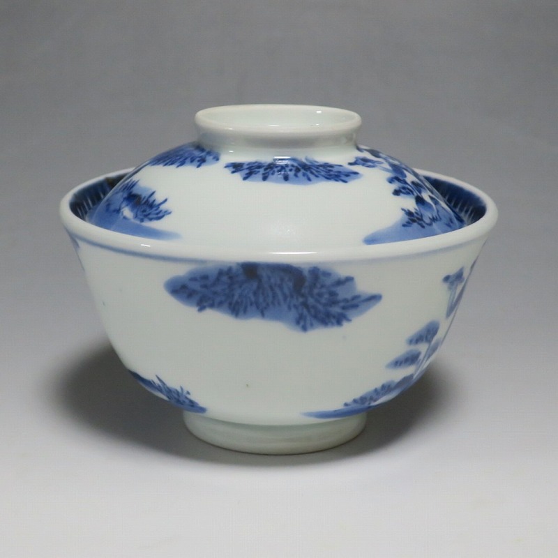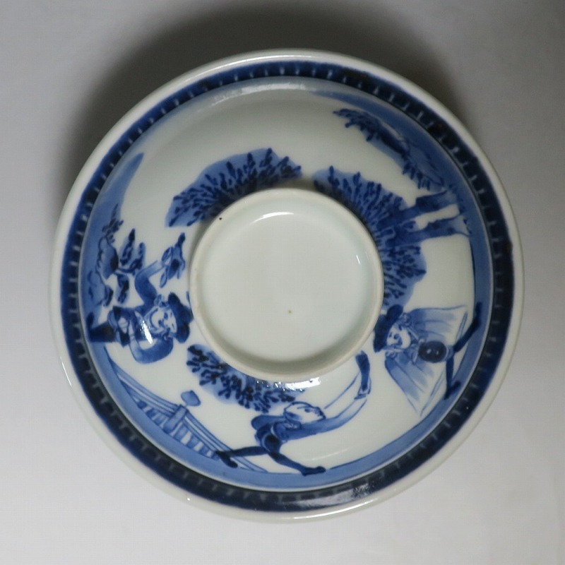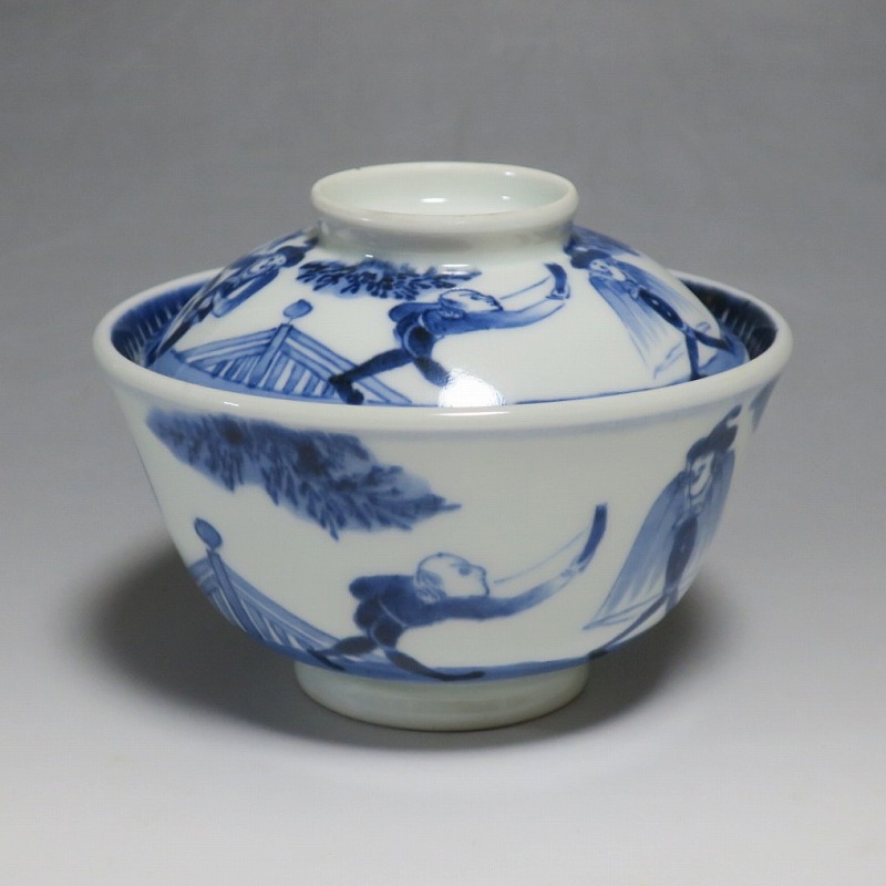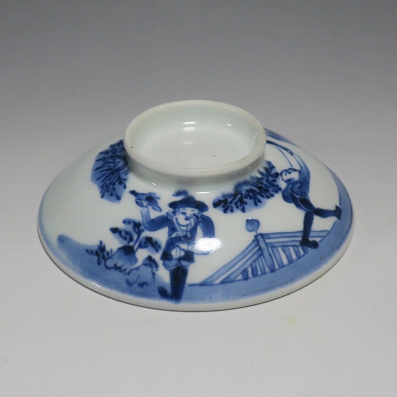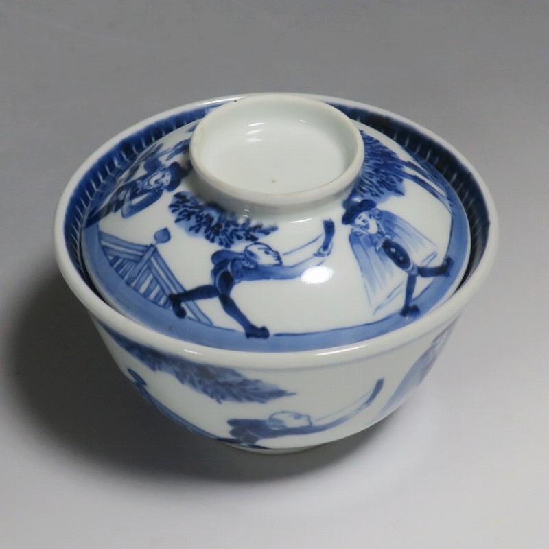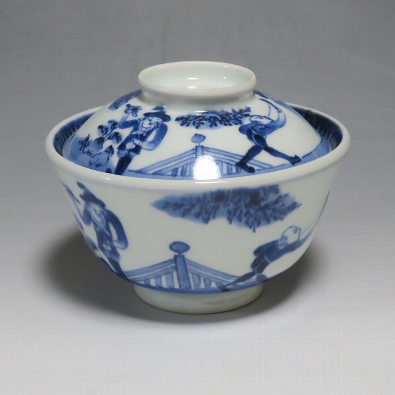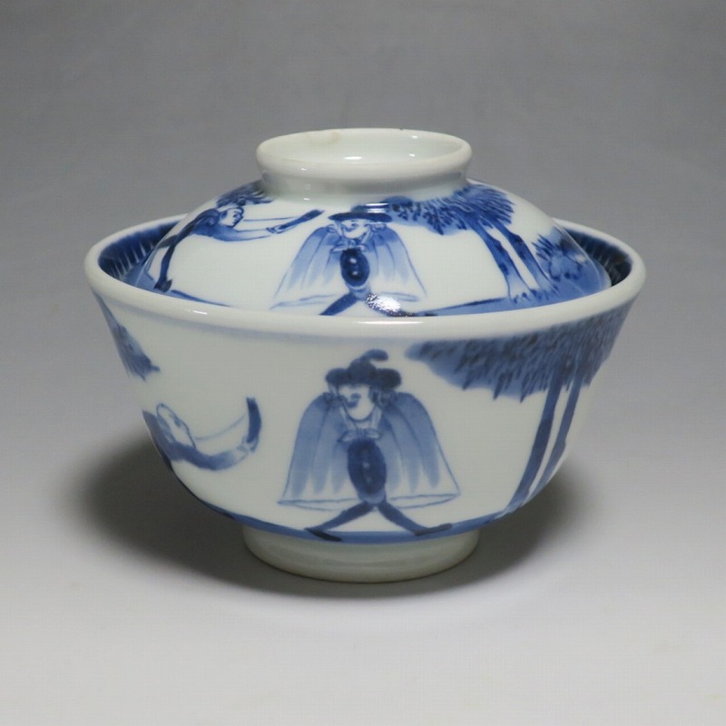 (江戸時代後期 18世紀後半) 商品番号 4102 口径 約12cm/高さ 約7cm 窯傷や蓋の持ち手部分に薄い当たり跡があります。状態は写真でご確認ください。 18世紀後半、長崎に伝播した蘭学や清学が流行します。その影響は磁器作品にも及び、有田では南蛮人を描いた作品が作られるようになりました。本品は経済政策を推進した田沼時代に作られた染付の南蛮人蓋茶碗。美しい呉須の発色、興味深い南蛮人の様子を描いた作品です。見ていると江戸時代の日蘭貿易の雰囲気が伝わってきます。観賞用、食器としてお楽しみください。 | ||