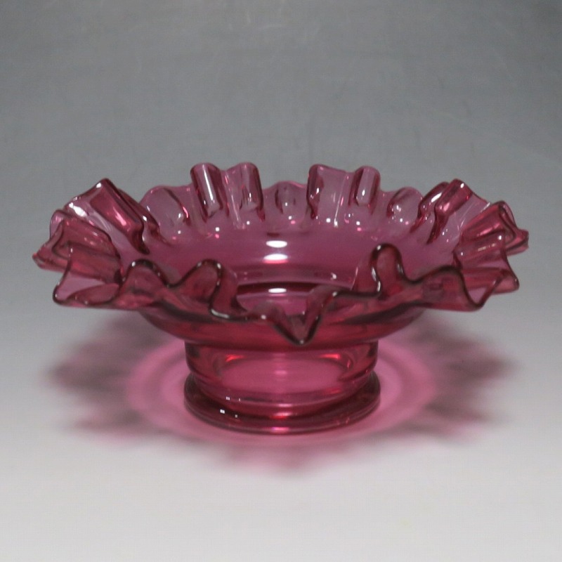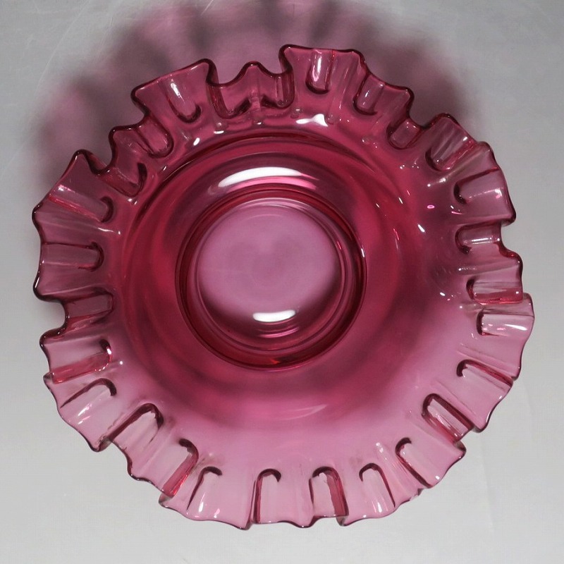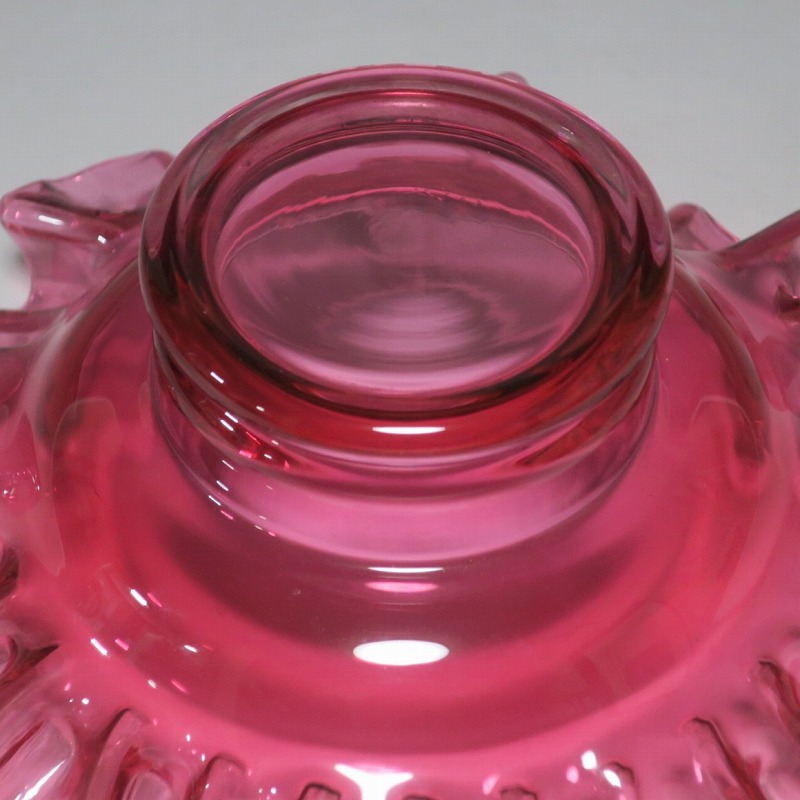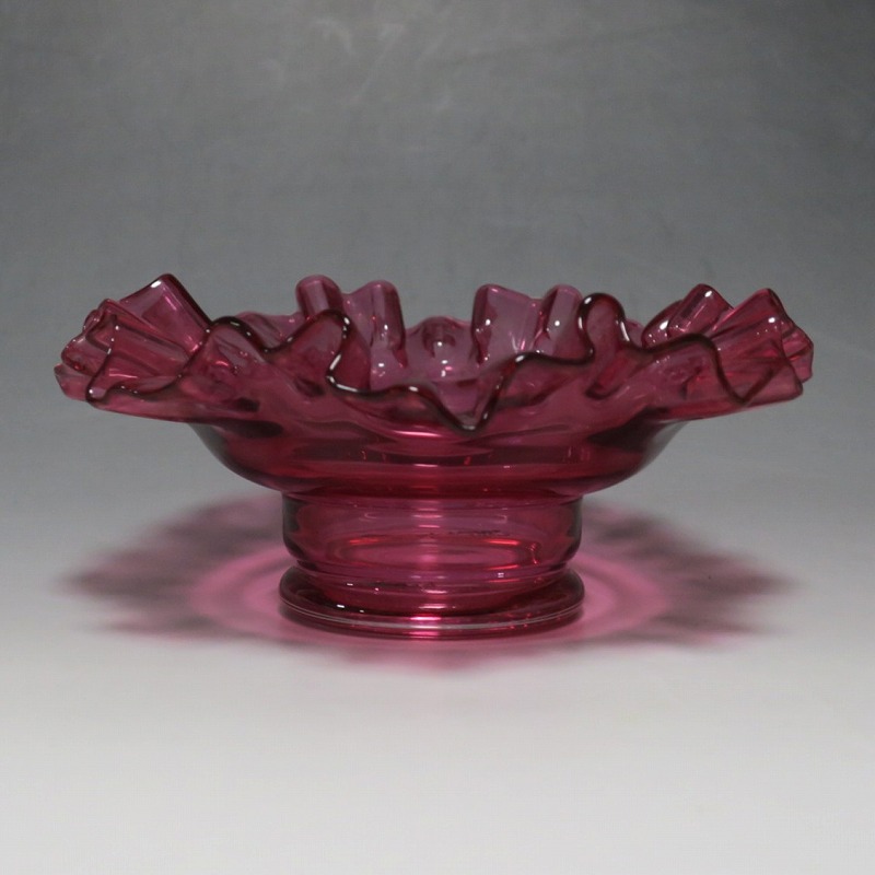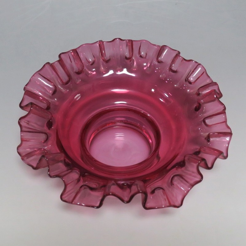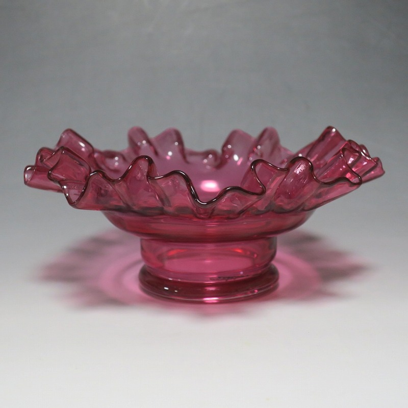 (イギリス 20世紀前半) 商品番号 4117 口径 約17.5cm/高さ 約7.5cm/高台径 約7cm 経年の汚れがありますが、完品です。状態は写真でご確認ください。 19世紀にイギリスで流行したクランベリーガラスの流れを汲んで製作された花瓶です。口辺のフリル、ガラスの質感から20世紀前半に作られたと推測できます。同時代、日本でも金赤を使用した赤色の氷コップ、花瓶などが流行しました。熟練工が作った作品なので存在感があります。色も形もお洒落な作品です。お菓子を入れると楽しいでしょう。 | ||