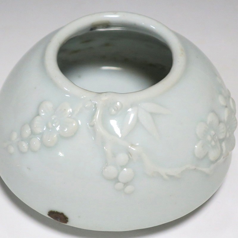 高さ 約5.5cm/胴径 約8.8cm 窯傷はありますが、完品です。状態は写真でご確認ください。 水盂は、書道具のひとつで水を入れる容器です。硯に水を移す際に使い、口が広く、匙で掬って水を汲みます。本品は清朝後期に作られた白磁の陽刻梅笹文水盂。梅文なので正月や春などハレの日に使用された書道具でしょう。小ぶりでかわいい模様が入っています。飾ると華やかさが出ます。他の書道具と一緒に飾るとインテリアとして楽しむことができるでしょう。座辺に置いてお楽しみください。 | ||