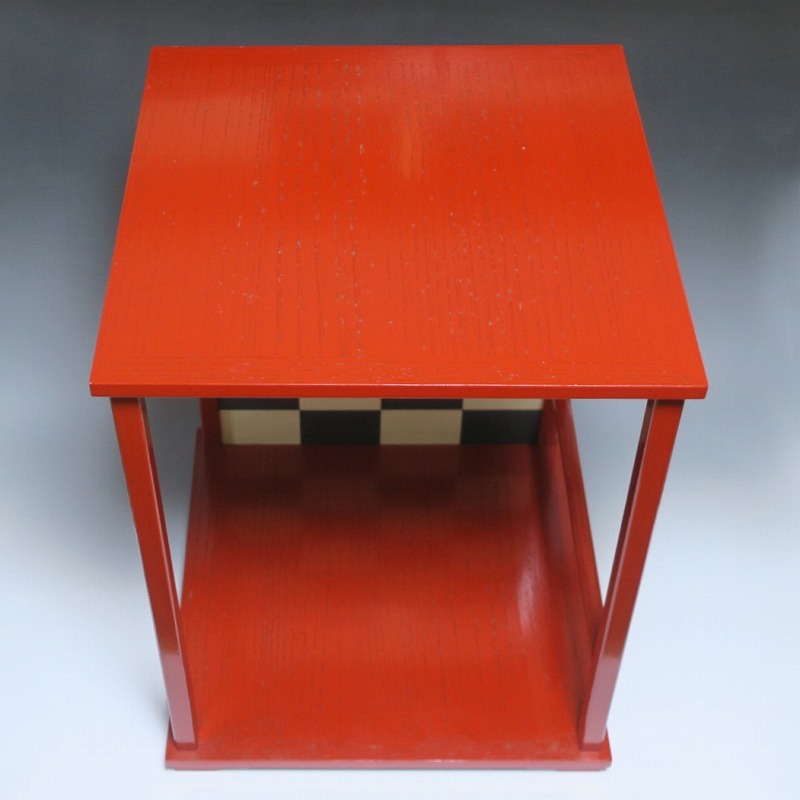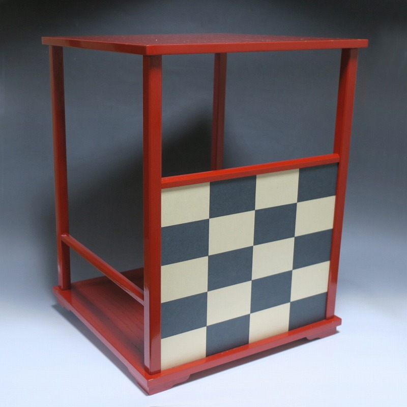 高さ 約43.1cm/横幅 約33.2cm/奥行 約33.3cm 経年の傷みや保存袋に染みがありますが、総じて良い状態です。状態は写真でご確認ください。 渡辺可映は、茶道界で名前を知られた茶道具の指物師です。江戸指物の技術を使い茶道の各流派の指物(接合道具を使わずに木と木を組み合わせて作る家具や調度品)を製作しています。本品は平成時代に作られた江戸指物の茶棚。桂離宮に使用されている市松文を使用した桂棚と呼ばれる茶棚です。デザイン、指物も洒落たデザインの作品。水差、茶道具の飾り棚の他、古美術品の飾り棚としてご使用ください。 | ||
