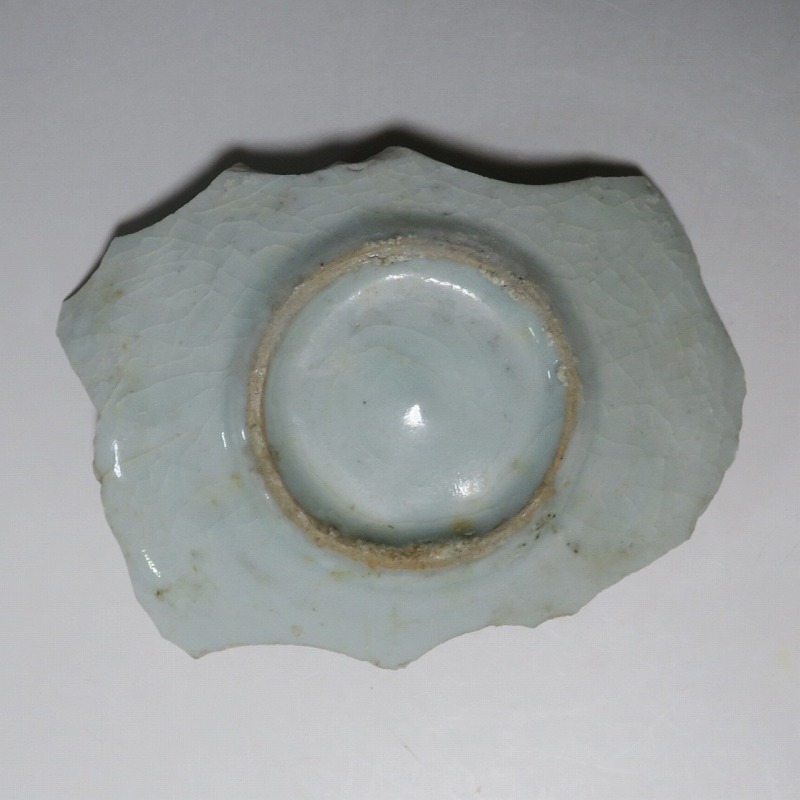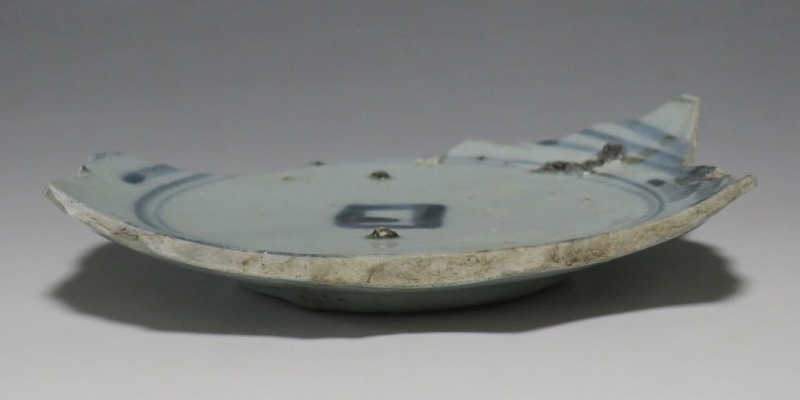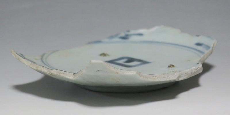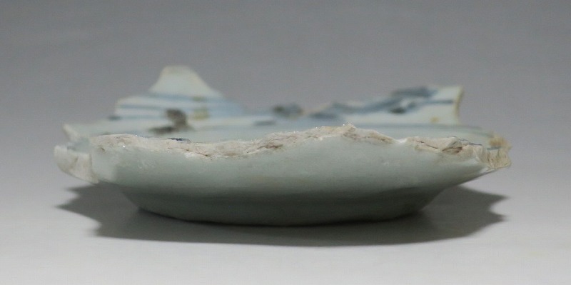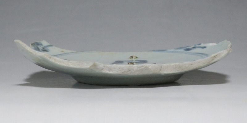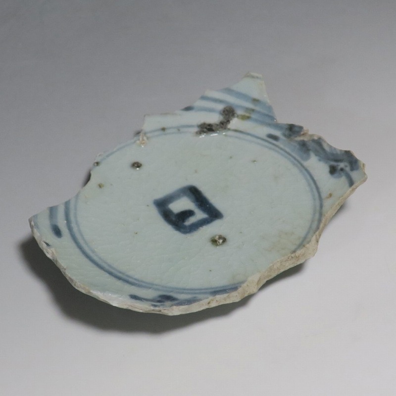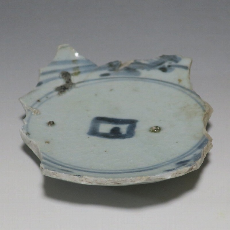 (江戸時代前期 1640年頃) 商品番号 4146 高さ 約3cm/横幅 約14.3cm/奥行 約10cm 甘手です。状態は写真でご確認ください。 日本で磁器が製作されるようになったのは17世紀前半です。初期伊万里の絵付けは景徳鎮の影響を受けていますが、それよりも柔らかいタッチ、和風で絵付けが成されています。本品は見込みに「日」の字のある染付陶片。本来は鳳凰文が描かれたなます皿の残欠なので、南中する太陽を意識して作られたのでしょう。高台が付いているので、酒の当てを盛る皿などに使用できます。食器、資料としてお楽しみください。 | ||