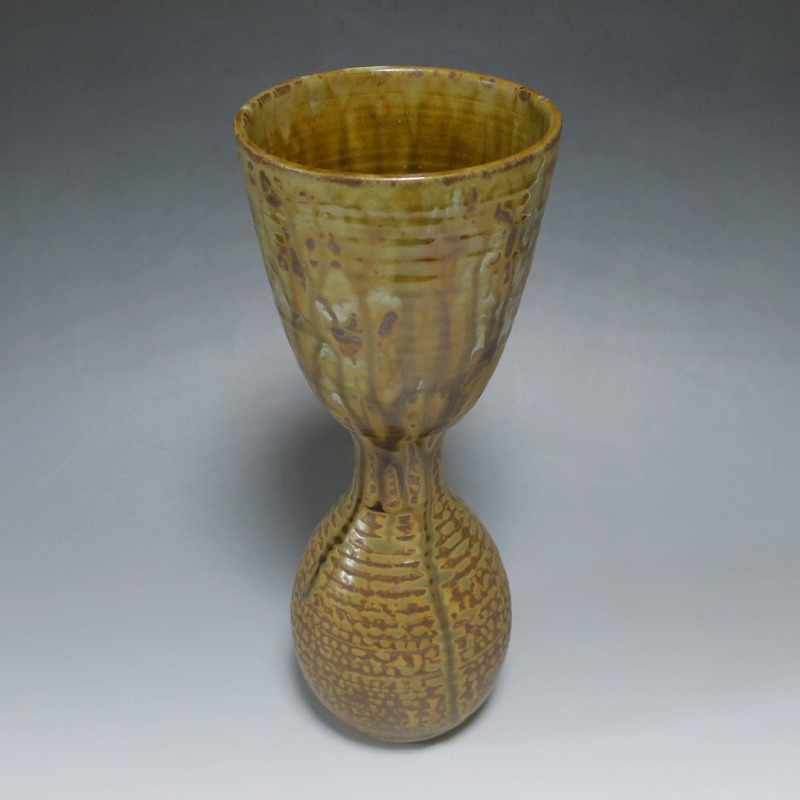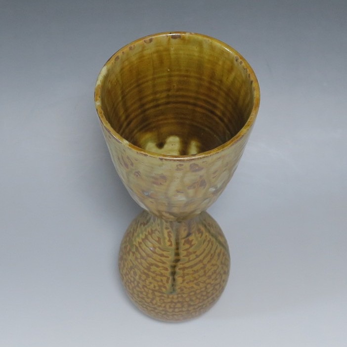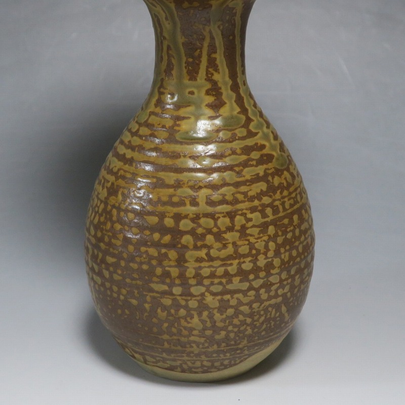 高さ 約29.3cm/口径 約12cm/高台径 約6cm 総じて良い状態です。状態は写真でご確認ください。 高取焼は17世紀後半、福岡藩3代・黒田光之の藩命によって開かれた窯です。初期は唐津焼に似た茶器を作っていましたが、元禄時代になると高取焼は本窯と小石原高取焼に別れ、独自の焼物を製作するようになりました。本品は昭和時代に作られた高取焼の花入れ。作風から十三代・高取八仙(1934年〜)の作品だと考えられます。表千家・即中斎(1901年〜1979年)の箱書きがあります。彫刻のような造形をしたモダンな花入れ。花器としてお楽しみください。 | ||