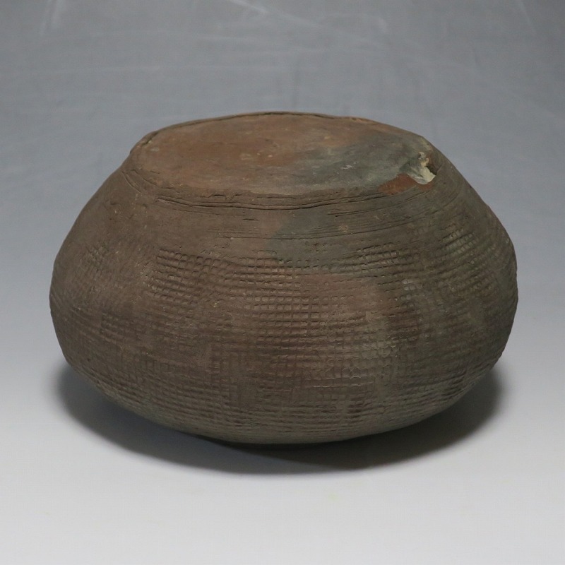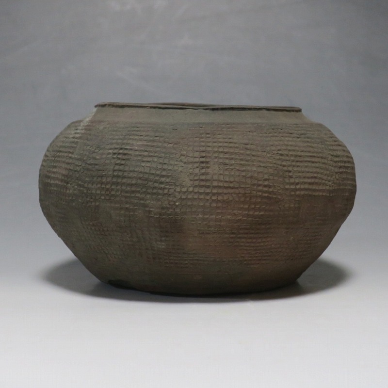 高さ 約8.5cm/胴径 約15.5cm 発掘品なので土が付着しており、口辺に約1.5p×7mmの直し、内側に若干の削げがあります。状態は写真でご確認ください。 中国では紀元前15世紀頃から瓷器(b器)が作られるようになります。 紀元前5世紀になると表面に装飾として印文が施された無釉の瓷器、備前焼のような焼締められた作品が出現しました。本品は前漢時代に製作された印文の小壺。胴部に叩き目のある作品です。小さいのですが古代の雰囲気を感じさせてくれます。観賞用、花器(落としを入れて)としてお楽しみください。 | ||