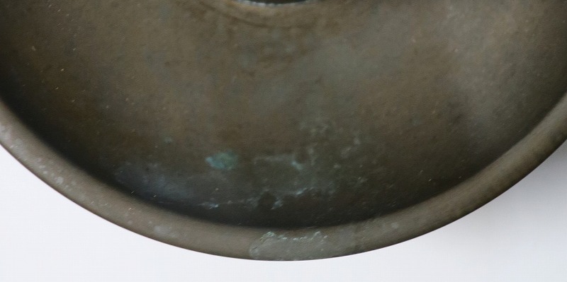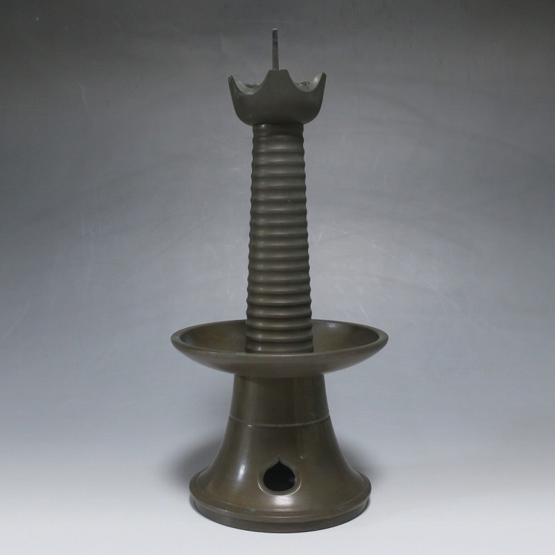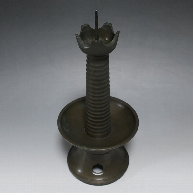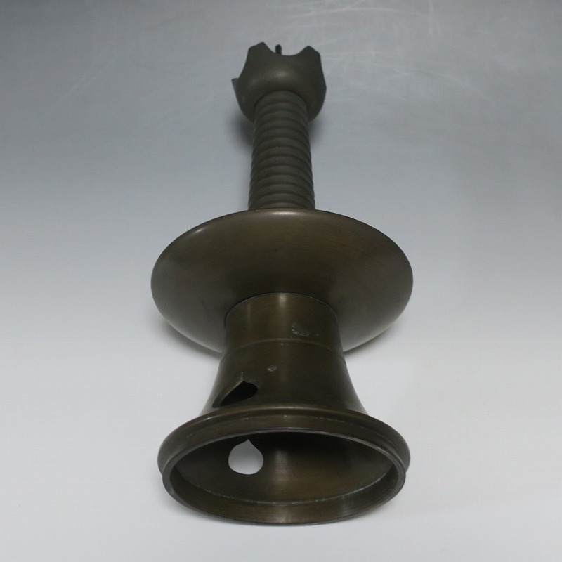 高さ 約31cm/横幅 約14cm 経年の傷みや錆がありますが、総じて良い状態です。状態は写真でご確認ください。 中川家は、京都で活動する千家十職の一人で金物師です。桃山時代、千利休の依頼・指導によって薬燗を作って以降、茶道具作りに専念しました。本品は「中川家中興の祖」と仰がれている7代中川浄益(1796年〜1859年、京都生まれ)が製作した銅製の灯火器。江戸時代に製作されたモダンな作品です。表千家9代・了々斎(1775年〜1825年)が好んだ形の燭台です。灯火器の他、インテリアとしても楽しむことができます。 | ||