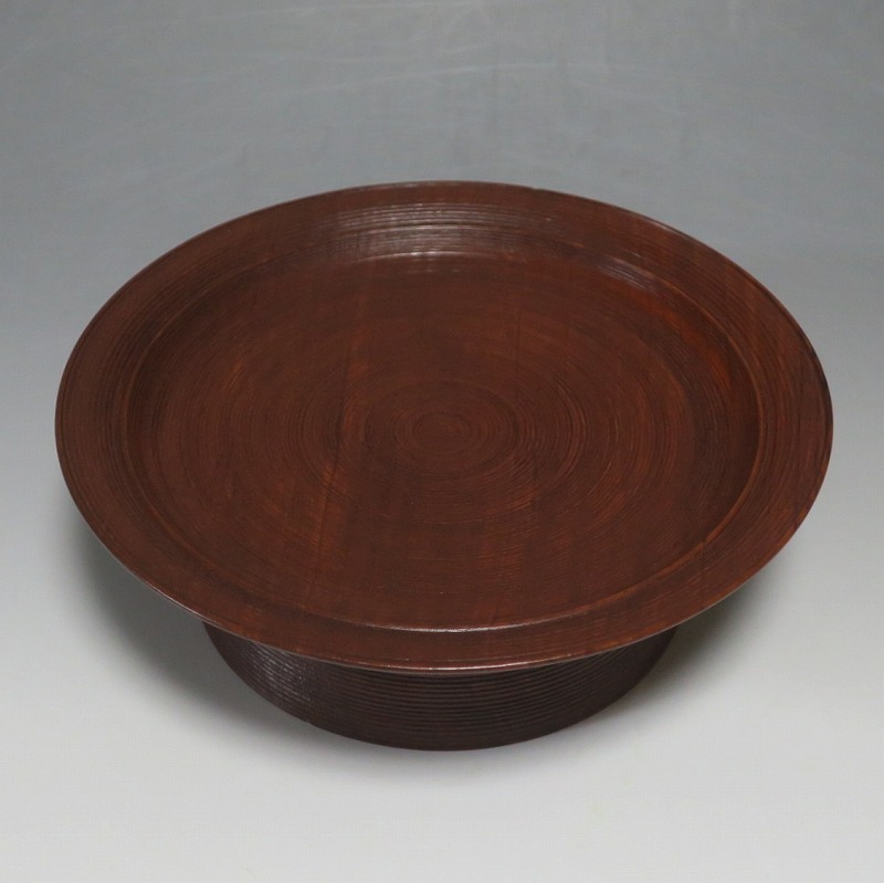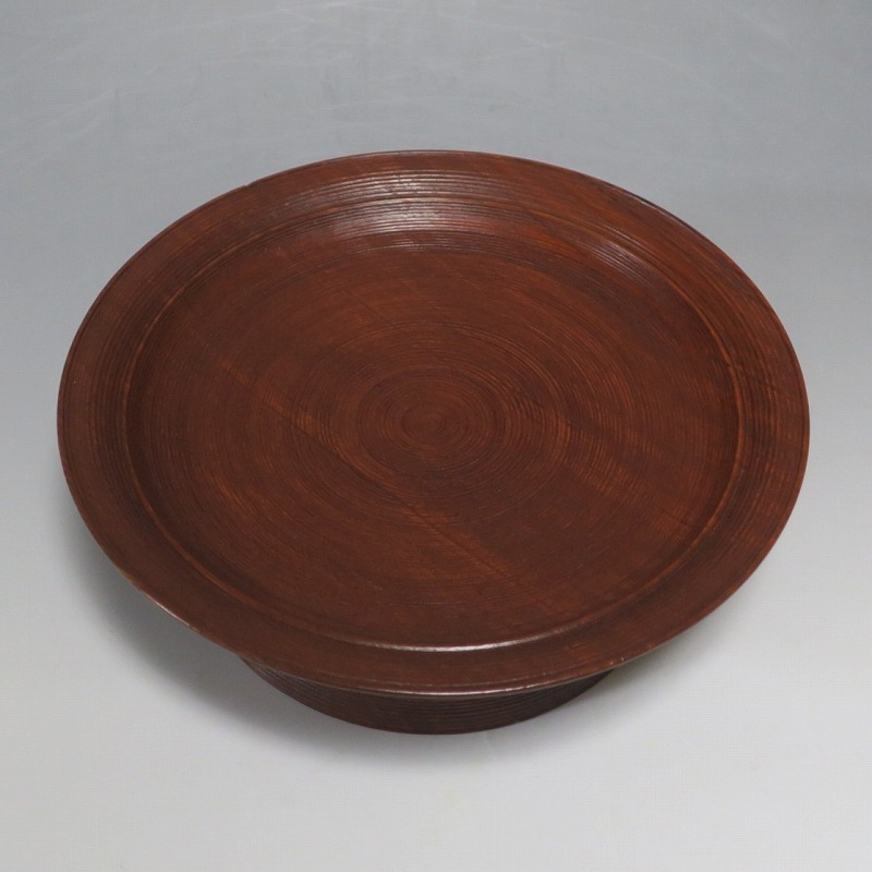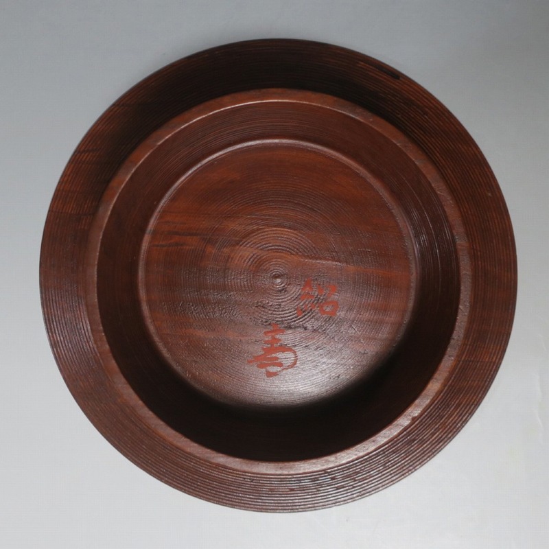 口径 約18.8cm/高さ 約6cm/高台径 約13cm 口辺に約3mmのアタリがありますが、総じて良い状態です。状態は写真でご確認ください。 吉田生風庵は江戸時代末期、名古屋の吉田紹和が表千家流堀内家の堀内不識斎、表千家10代家元吸江斎に師事して表千家の宗匠となった茶道家です。本品は吉田生風庵4代・吉田紹清の箱書きのある漆器の独楽高台付き菓子器。轆轤で引いた木目の美しい作品です。箱蓋の裏に「独楽 草結庵庭前之松以 紹清 十五ノ内」の書付があります。表千家流派の道具だけあって質素な感じのする菓子器です。菓子器の他、見立ての食器として使用できます。 | ||
