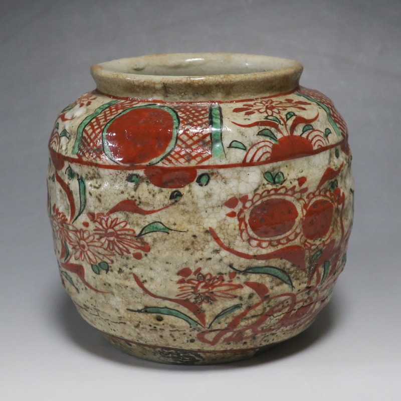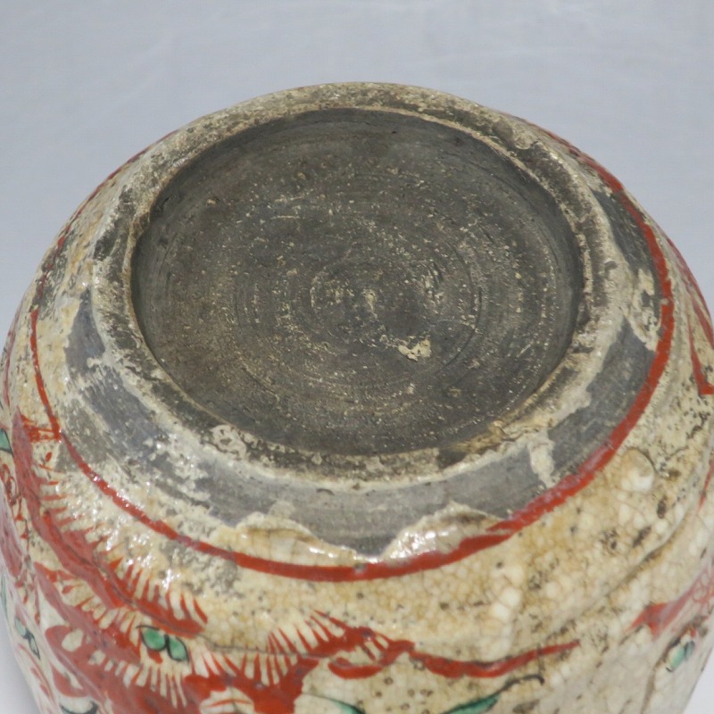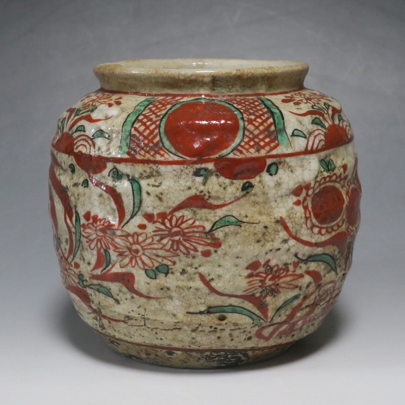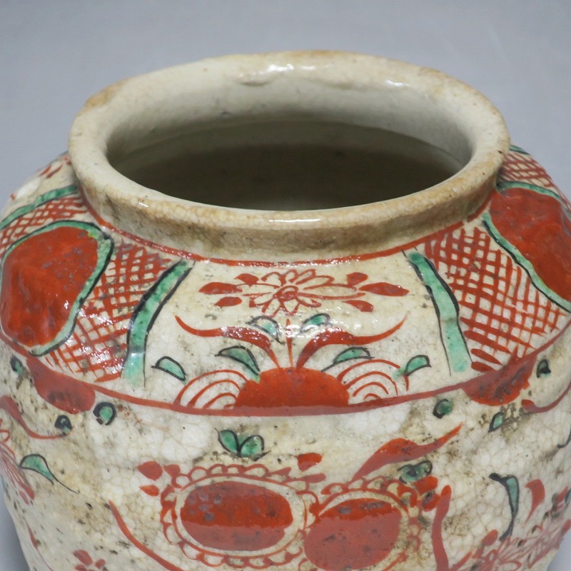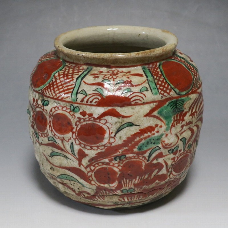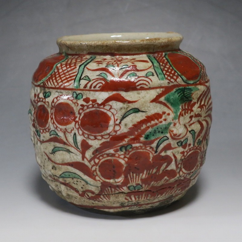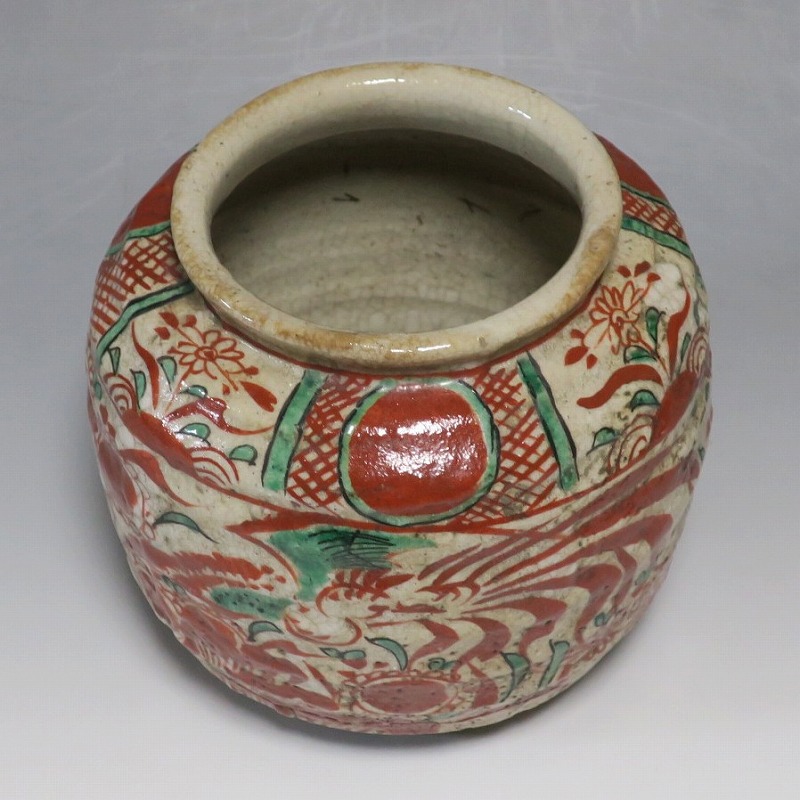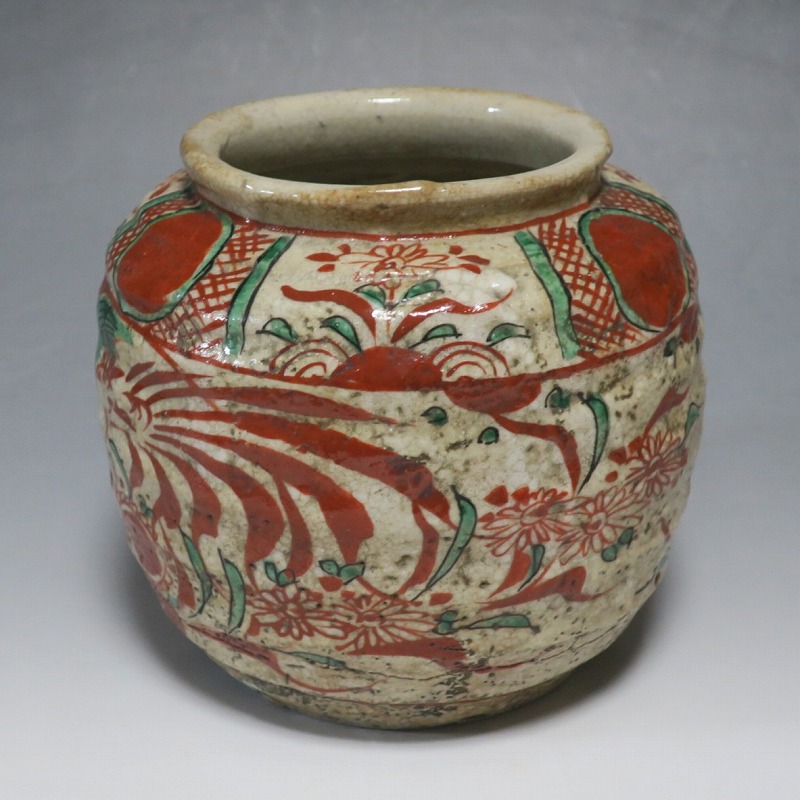 高さ 約14cm/胴径 約15.5cm 経年の汚れや窯傷はありますが、総じて良い状態です。状態は写真でご確認ください。 犬山焼は愛知県犬山市で18世紀中頃に開かれた窯です。天保初年(1830年)、赤絵の作品が作られるようになり、1840年代になると呉須赤絵や道八風の雲錦手が焼成され、一世を風靡しました。本品は幕末期、犬山焼が興隆していた時代に作られた鳳凰紋の壺。赤絵の様式がうまく和風に仕上がっています。インテリア、花器としてお楽しみください。 | ||