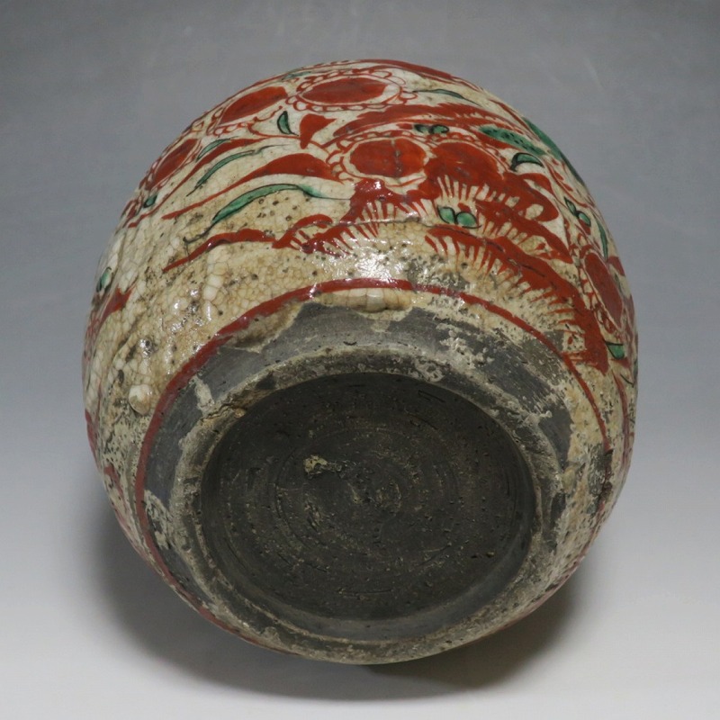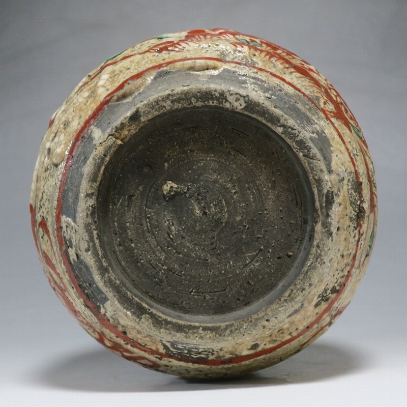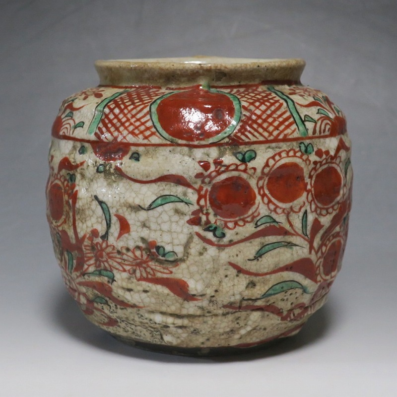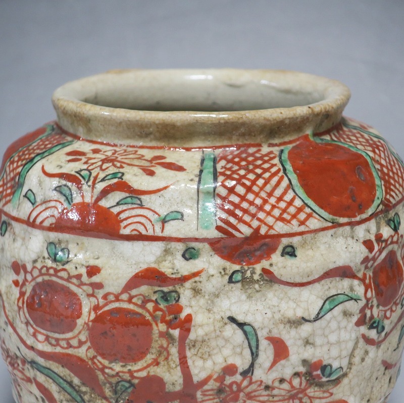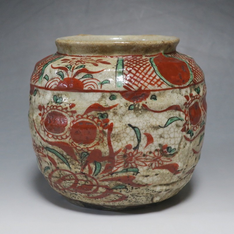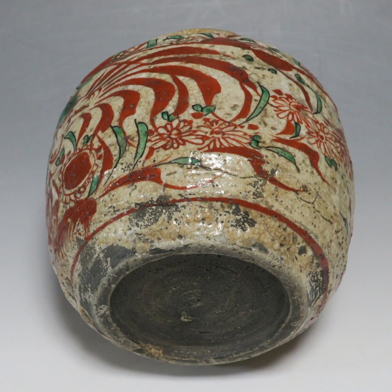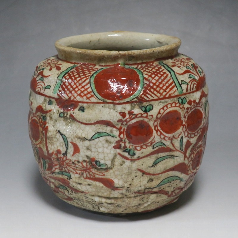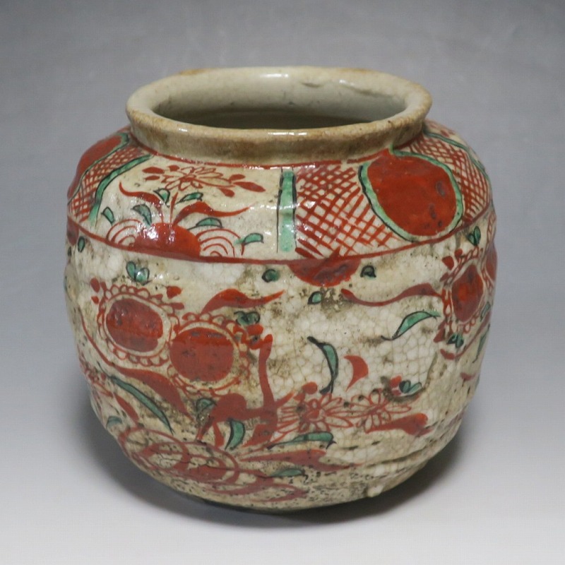 高さ 約14cm/胴径 約15.5cm 経年の汚れや窯傷はありますが、総じて良い状態です。状態は写真でご確認ください。 犬山焼は愛知県犬山市で18世紀中頃に開かれた窯です。天保初年(1830年)、赤絵の作品が作られるようになり、1840年代になると呉須赤絵や道八風の雲錦手が焼成され、一世を風靡しました。本品は幕末期、犬山焼が興隆していた時代に作られた鳳凰紋の壺。赤絵の様式がうまく和風に仕上がっています。インテリア、花器としてお楽しみください。 | ||