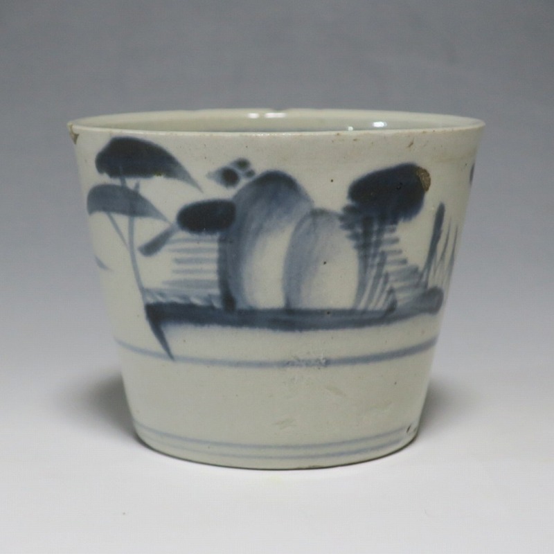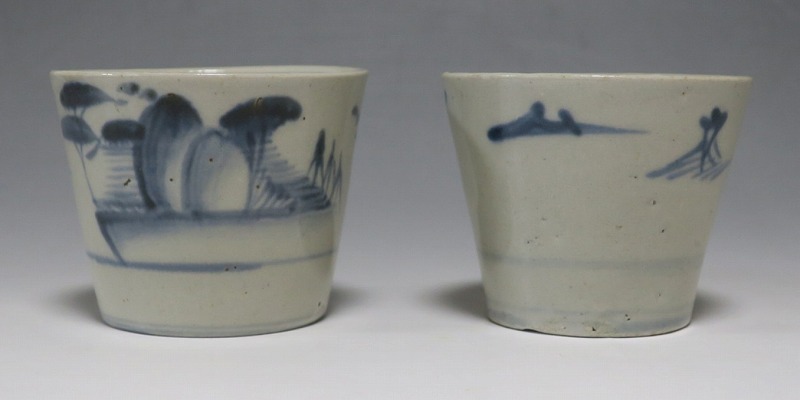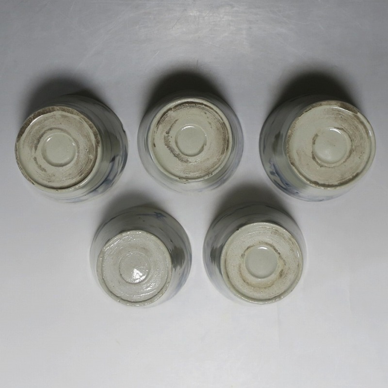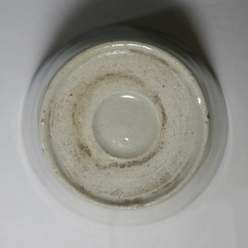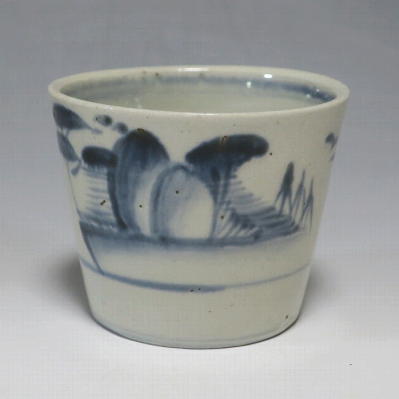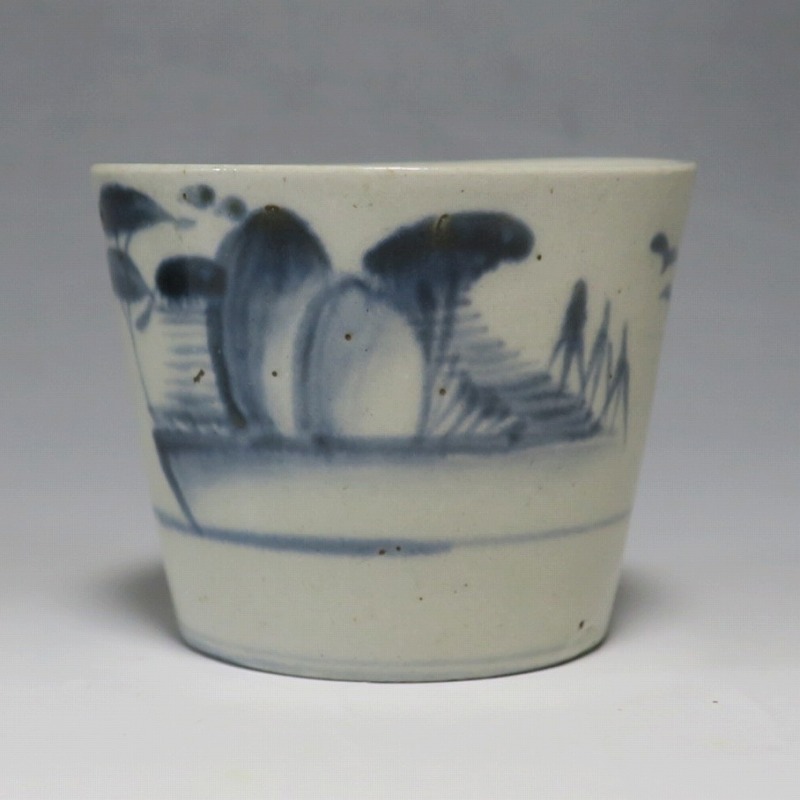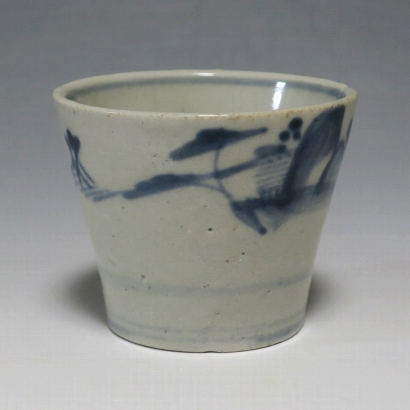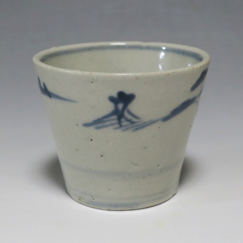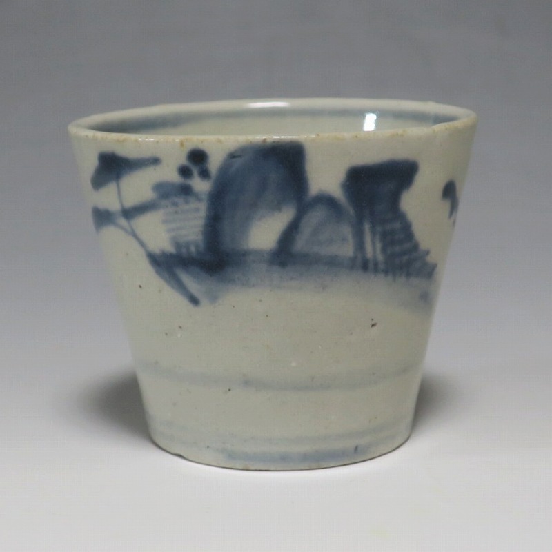 (江戸時代後期 19世紀前半) 商品番号 4190 口径 約7.5〜8cm/高さ 約6〜6.3cm/高台径 約5〜5.5cm 1客完品。4客の口辺や高台にそれぞれ1mm〜1cmのアタリがあります。状態は写真でご確認ください。 皆沢焼は19世紀前半、前橋城本丸北付近(群馬県前橋市)に開かれた窯です。1815年から1822年まで藩窯の御用窯として活動しましたが、それ以降は民窯に移行しました。本品は染付山水のそば猪口。波佐見焼や瀬戸焼の太白手に似た作品です。国焼独特の質感がある珍しい国焼のそば猪口です。普段使いのそば猪口としてお楽しみください。 | ||