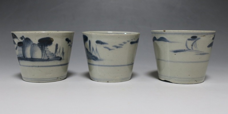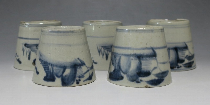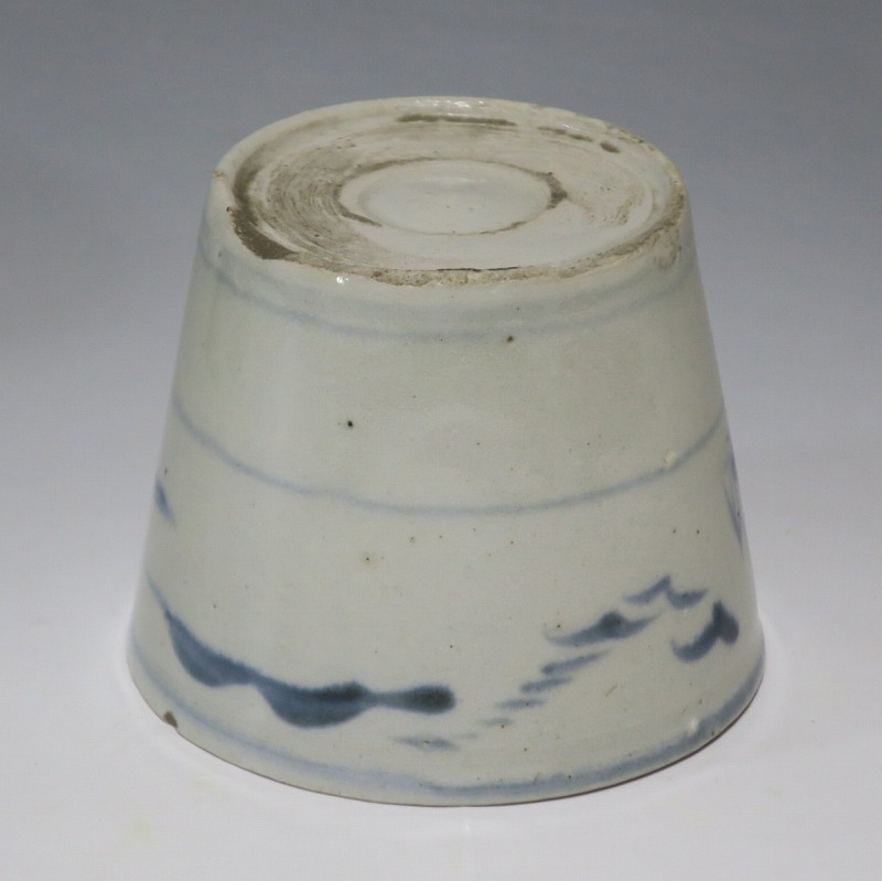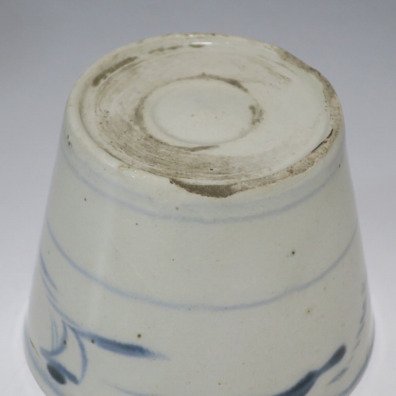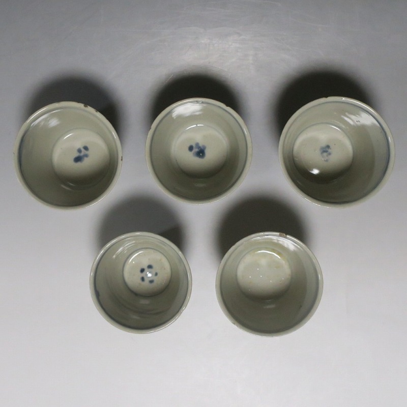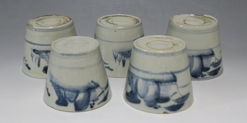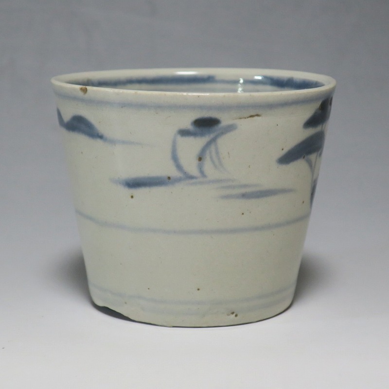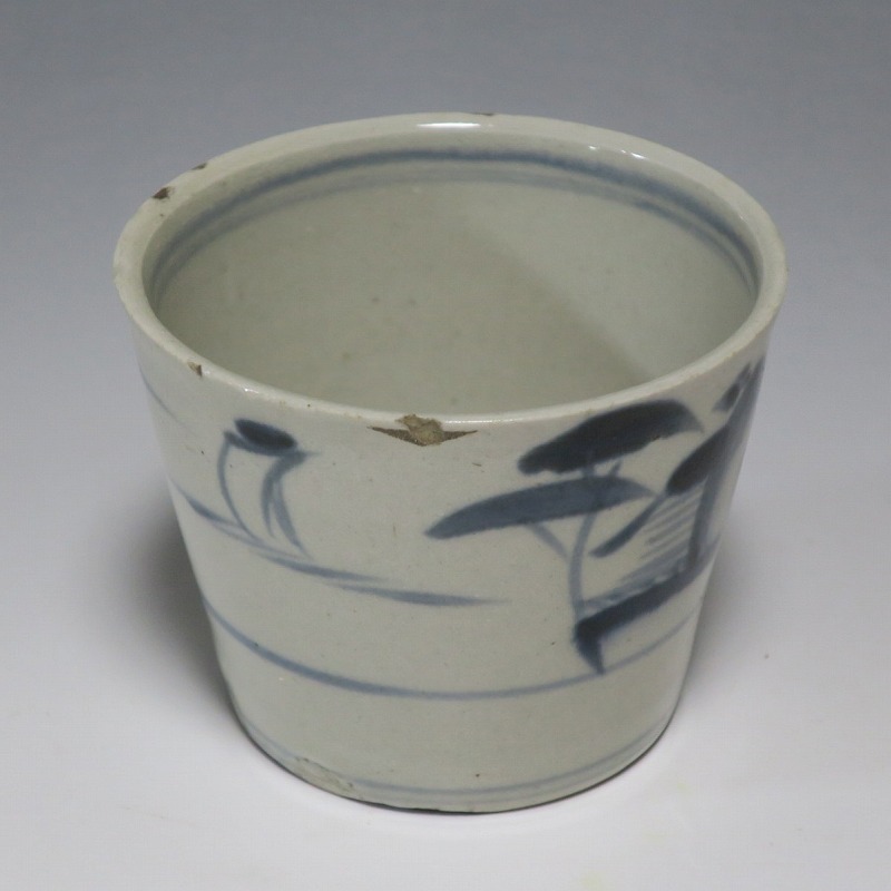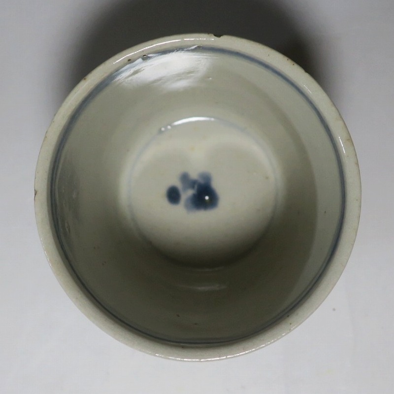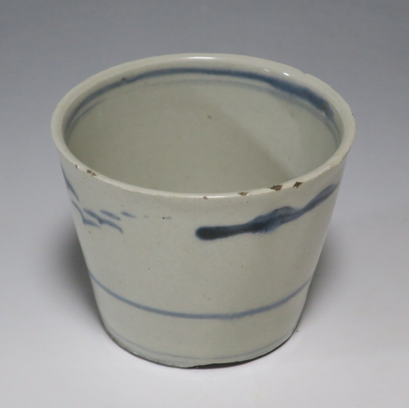(江戸時代後期 19世紀前半) 商品番号 4190 口径 約7.5〜8cm/高さ 約6〜6.3cm/高台径 約5〜5.5cm 1客完品。4客の口辺や高台にそれぞれ1mm〜1cmのアタリがあります。状態は写真でご確認ください。 皆沢焼は19世紀前半、前橋城本丸北付近(群馬県前橋市)に開かれた窯です。1815年から1822年まで藩窯の御用窯として活動しましたが、それ以降は民窯に移行しました。本品は染付山水のそば猪口。波佐見焼や瀬戸焼の太白手に似た作品です。国焼独特の質感がある珍しい国焼のそば猪口です。普段使いのそば猪口としてお楽しみください。 | ||